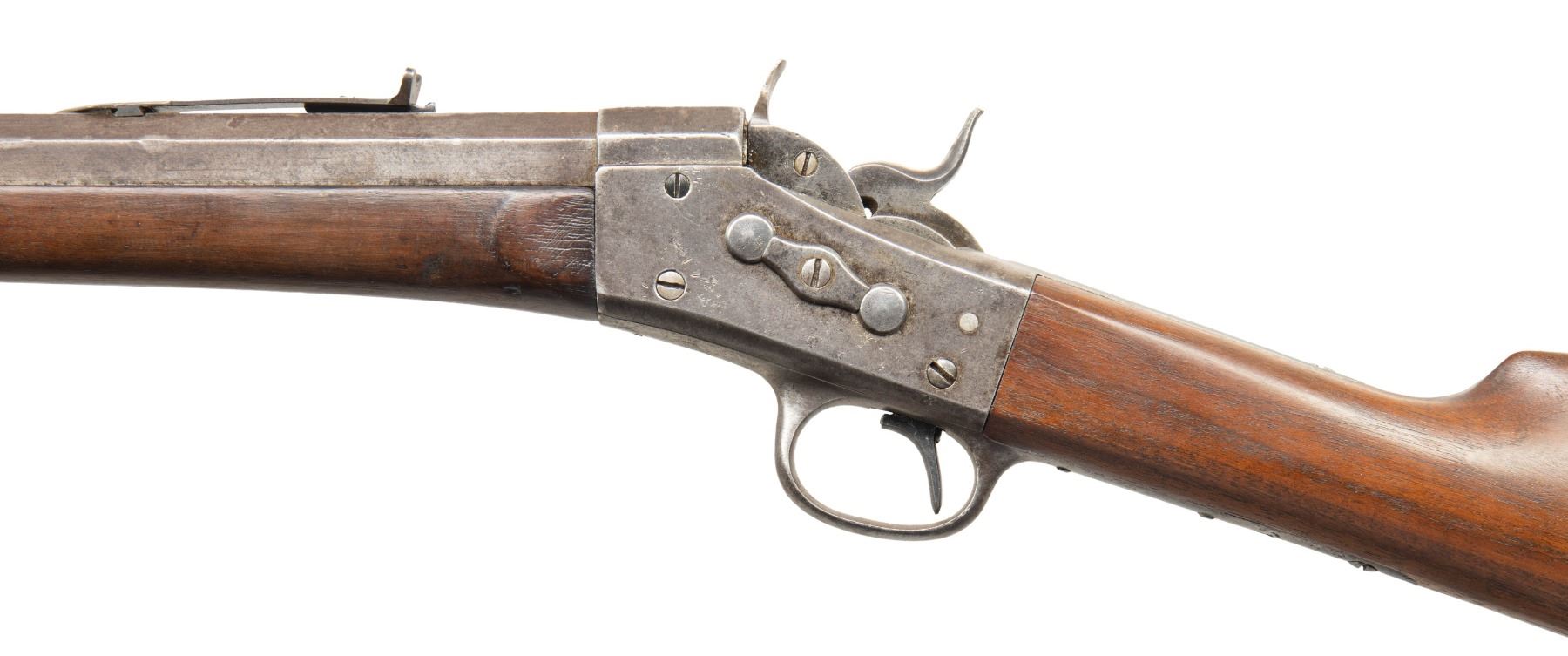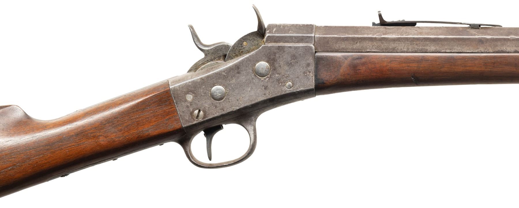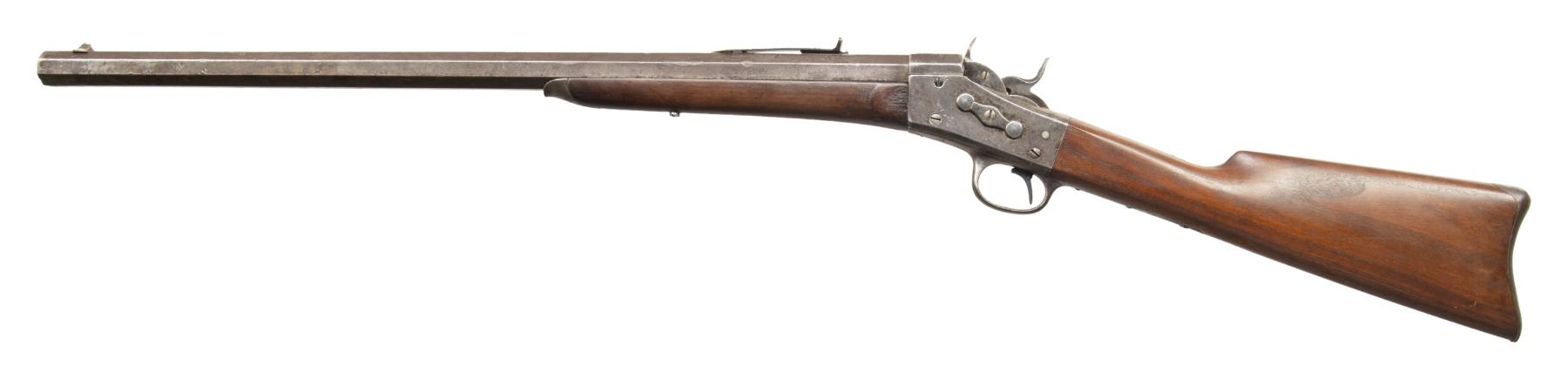 Cal. 45 CF. NSN. Bbl. 26" heavy oct. marked "45" on underside. Blade front sight. Sporting style rear sight. Custom Remington Rolling Block Rifle in unknown 45 cal. 45-70 will not chamber. Upper tang has several Remington patent dates with last one being illegible. Walnut stock set. CONDITION: stock set has handling marks with dings, abrasions & scratches. Forend screw is proud of wood & forend is loose. Metal has a dull gray appearance with scattered oxidation, edge wear, tool marks, pitting & handling marks. Action functions properly when hand cycled. Very good plus bore with strong rifling. PROVENANCE: Estate of Groves Herrick. (01-28368/MJC). ANTIQUE. $300-500.