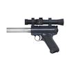 Cal. 22 LR. S# 212-03771. Bbl. custom 6" slab sided receiver diameter bull (appears stainless having beveled target crown) with additional slab side treatment to bottom; top drilled and tapped for front sight (missing). Mfg. 1985 (1982-2005) with blued finish and checkered black plastic grips having silver eagle medallion. Top of receiver covered with 1 piece Weaver style base holding 1" tubed Ultra Dot red dot sight in alloy rings. Slightly altered triggerguard profile with addition of engagement adjustment screw plus aftermarket target trigger with overtravel adjustment screw. Notable change in the MK. II is that it will keep the bolt retracted upon firing the last round. MAGS: 2 factory 10 rd. CONDITION: very good plus overall appearance with faint handling marks. Near excellent bore and operable optics. Very good grips. (25-3228/NW). MODERN. $250-400.