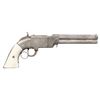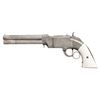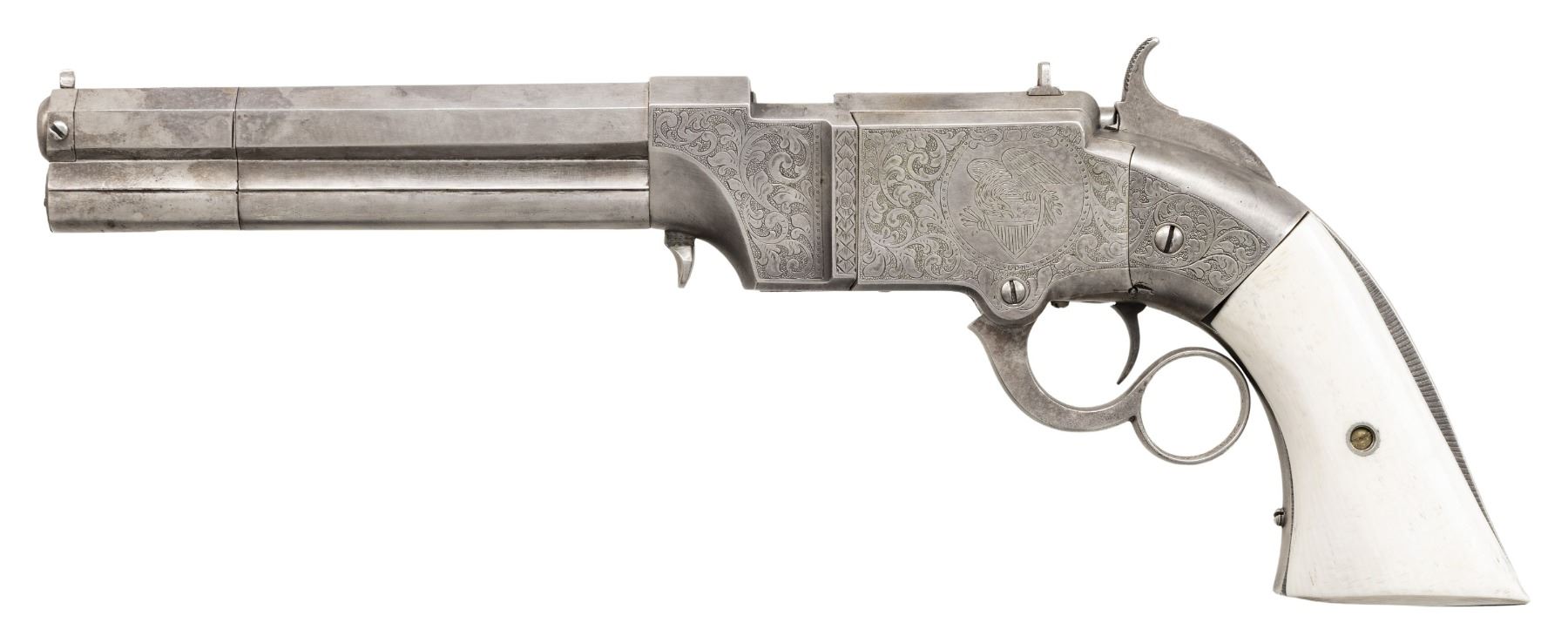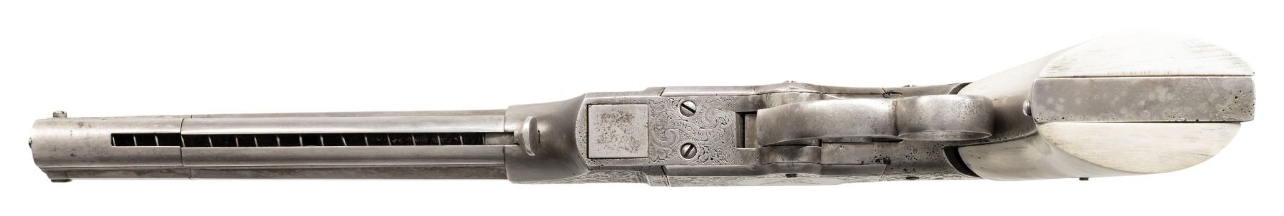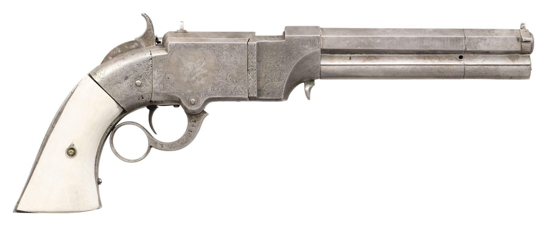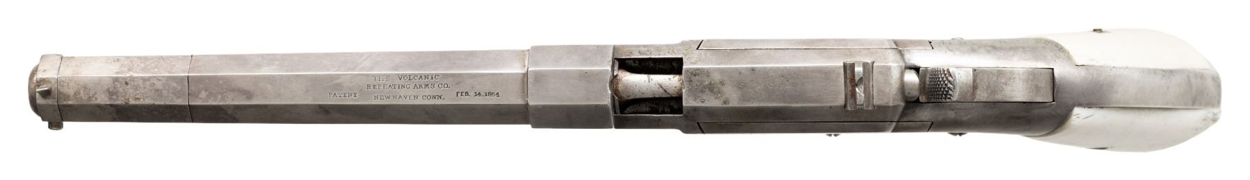 LARGE FRAME NO. 2 VOLCANIC ARMS LEVER ACTION PISTOL. Cal. 41. S# 741. Pistol is in standard configuration with blued 6" octagonal barrel, integral spring loaded magazine, fixed notch rear sight, pinched post front sight, engraved panel scene brass frame, custom ivory grips. Made to shoot self-contained "rocket ball" cartridges with powder & primer contained in conical ball. Manufactured between 1855-1857 after formation of Volcanic Arms Company from Smith & Wesson after they sold their interests to investors including Oliver Winchester. Barrel markings: "THE VOLCANIC ARMS CO. / NEW HAVEN CONN / PATENT FEB 14 1854" on top flat. CONDITION: very good as customized with engraving and silver plating, address marking very good, silver plated frame & custom engraving applied after manufacture in style of Nimschke, replacement grips poorly fit. Mechanics need attention, trigger spring does not engage, sharp rifled bore. (01-26637/JS). ANTIQUE. $4,000-6,000.