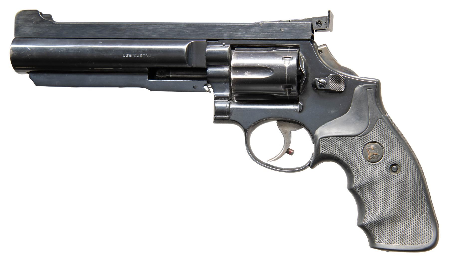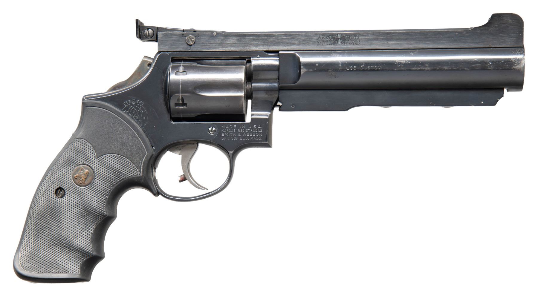 Cal. 357 Mag. S# D856011. Bbl. 6" LSB Custom. Aristocrat sight rib with adjustable rear. Custom PPC style 13-1 revolver. Modified hammer & trigger. Blued finish. Pachmayr "Gripper" grips. Stippled backstrap. CONDITION: grips show scattered white staining & handling marks. Hammer retains strong traces of case colors with some edge wear & fading. Trigger is smooth & has a bright appearance with some light oxidation & operational wear. Balance of metal retains 90% mix of blue finishes with some light pitting on bbl., scattered edge wear, fading & handling marks. Action functions properly when hand cycled. Bright near excellent bore. (25-4869/MJC). MODERN. $300-500.