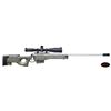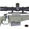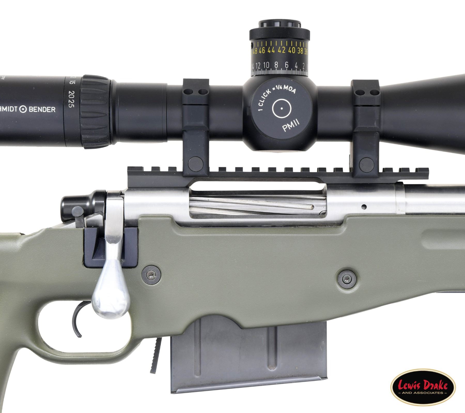 RIFLE. Cal. 338 Lapua Mag. S# S6548027. Bbl. 28" fluted stainless with blued triple baffle muzzle brake giving 30 1/4" overall; 1.22" at rear and .88" at muzzle. Consignor states built by Gerald Boyd (2046-2014) who worked for, and was close friend of, Kenny Jarrett who is famous for his long range "bean field" rifles. Consignor further states that Boyd used a Shilen barrel that is marked "WEST KENTUCKY GUNS" along with its caliber; all Boyd barrels similarly marked. Bolt handle with ground scope clearance and added pear shaped aluminum knob giving longer overall length for positive operation with greater leverage. Stock is unmarked but appears to be a green (black trim) Accuracy International Chassis of L96 style as used by English and German snipers. Forend tip allows use of a pivoting bipod. Multiple ports for push button release sling swivels plus rail in forend. Thumbhole stock has adjustable buttplate and comb. Action appears to have factory adjustable trigger set for 4 pounds (gauge measured). Unmarked Picatinny one piece scope base with unmarked heavy duty 34mm scope rings; all matte finished. Superb Schmidt Bender 5-25X56 matte finished scope with P4FL first focal plane reticle that has variable illumination. Side parallax, fine 1/4 MOA adjustments and Euro fast focus eyepiece. Scope introduced in 2022; MSRP of $4,120. MAGS: 1 unbranded 10 rd. appears by Accuracy International. UNATTACHED ACCESSORIES: Heavily constructed Hunting Classics lockable airline style aluminum transport case in good condition with outlined foam liner and Harris SLM Bipod. CONDITION: all aspects near excellent to include bore and optics. PROVENANCE: from the renowned collection of quality sporting arms from Lewis Drake together with inventory of Lewis Drake Associates. (24-6631/NW). MODERN. $4,000-5,500.