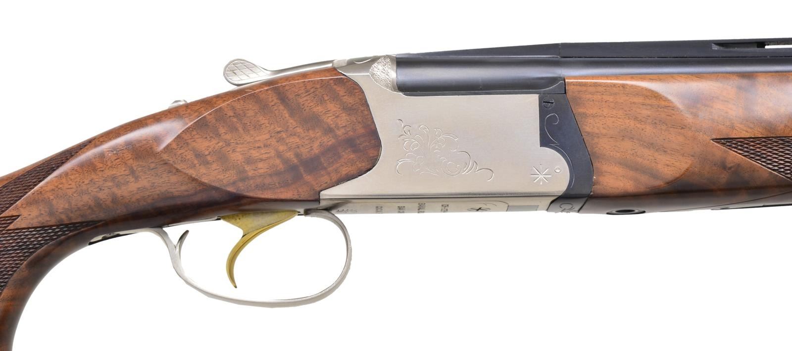 Cal.20 ga. 3". S#: 032702838B. Bbls: 26 1/2" with vent rib, steel bead and interchangable chokes. Mod & Full tubes included. Satin nickel finished boxlock action has highlights of scroll engraving. Gold finished non selective single trigger & selective ejectors. Finely made custom stock & forend by Paul Hilmer of Hudson IA. Semi beavertail forend and flat knob sporting clays stock of fancy fiddle walnut have borderless hand checkering and smooth satin finish. LOP: 14 1/2" over black Decelerator sporting clays pad. DAC: 1 1/2". DAH: 2 1/2". The stock has a slight cast on. Imported by EAA Corp. CONDITION: Metal retains nearly all original finish. Custom wood has very good finish. Bright near excellent bores. (22-5929/DS). MODERN. $700-1000. .