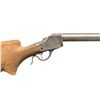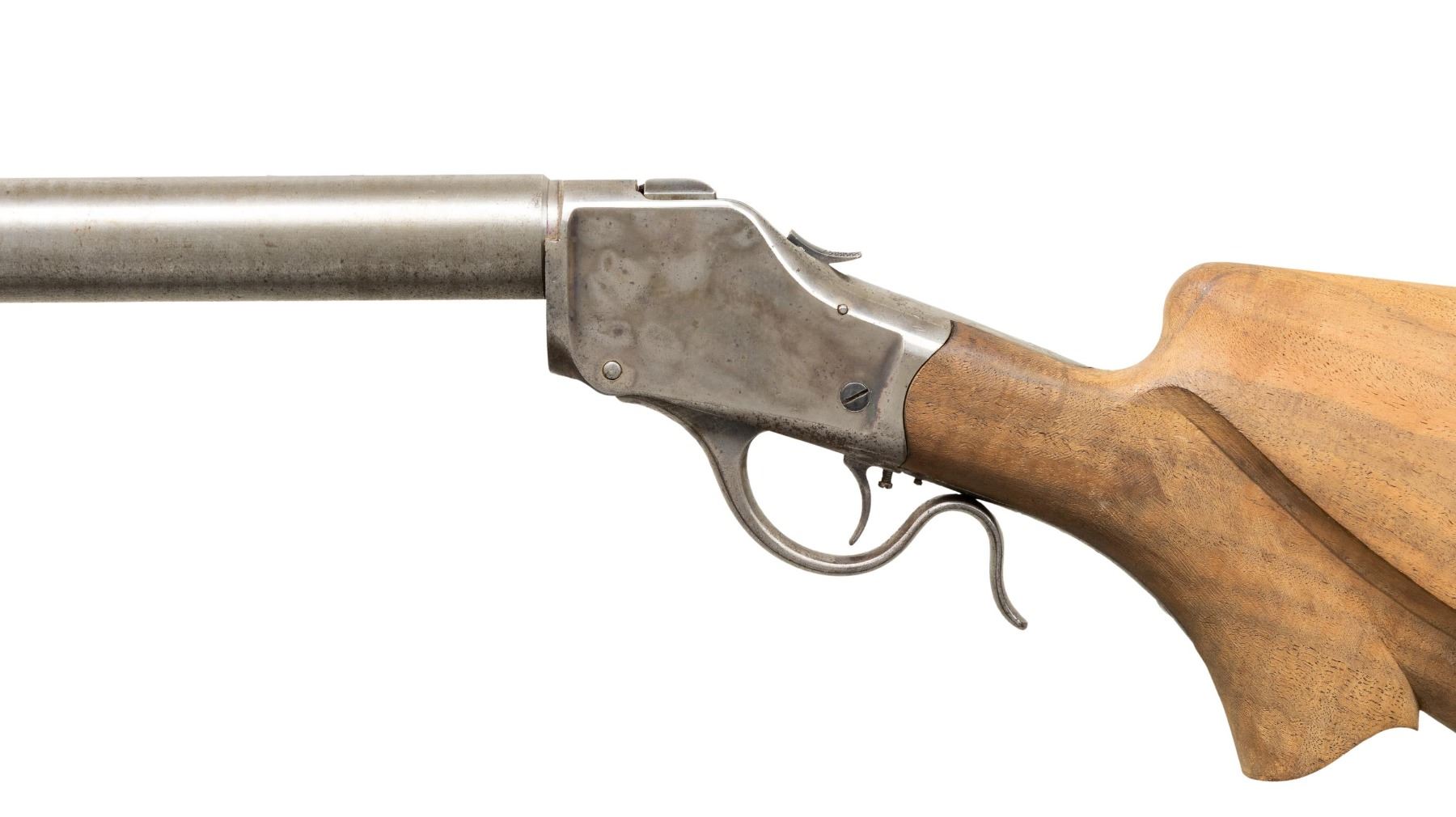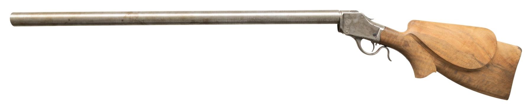 RIFLE. Cal. 38-55 WCF. S# 75841. Bbl. 30 1/16". Model 1885 High Wall single shot rifle originally mfg. by Winchester in 1896. Custom heavy rnd. bull bbl. is devoid of any identifying markings. Lower receiver tang is marked with Winchester's patent information, followed by the S#. Custom unfinished perch belly pistol grip buttstock with large right hand cheekpiece and finely checkered steel buttplate. Forearm is absent. Top of the bbl. is drilled and tapped with 4 screw holes for scope block attachment. Upper receiver tang is drilled and tapped with a plug screw, likely for a previously mounted tang sight attachment, with an additional screw present on the lower receiver tang. Receiver features an adj. trigger and a contemporary coil spring. CONDITION: receiver and lever retain scant traces of their apparent original factory case colored finish, with the balancing having fading to gray patina, exhibiting scattered spots / patches of light surface oxidation and age related discoloration. Receiver exhibits a couple of patches of surface level grind marks on the tangs. Bbl. exhibits consistent light surface oxidation and discoloration overall, with some scattered scratches. Mirror bore, retaining well defined rifling throughout. Proper manual mechanics. Stock is very good, as unfinished, showing some discoloration around the upper edges at the buttplate. Buttplate exhibits scattered patches of light to mild surface oxidation, with the balance of oxidation present towards the peak. A high quality customized Model 1885 High Wall that will make for an attractive rifle once properly finished! (01-29023/MLW). ANTIQUE. $200-300.