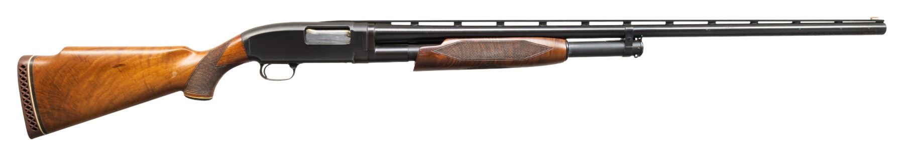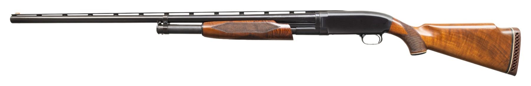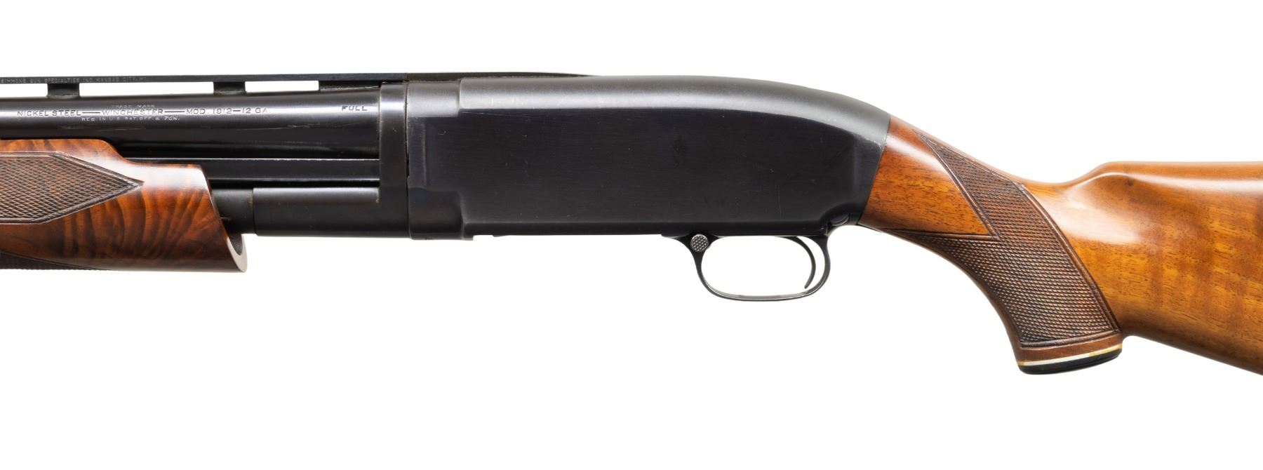 IN TRAP CONFIGURATION. Cal. 12 GA. S# 184358. Bbl. 31 3/8". Model 1912 pump action shotgun mfg. by Winchester in 1919. Left side of the bbl. exhibits standard factory markings denoting the model and cal. designations, followed by a "FULL" choke marking, with Winchester's mfg. and patent information marked on the right. Left side of the V/R is marked "SIMMONS GUN SPECIALTIES INC. KANSAS CITY, MO". Metal components exhibit a reapplied blue finish overall, with the top strap of the receiver and the mag. tube exhibiting a reapplied matte blue finish. Bolt and carrier are polished in-the-white. High grade custom checkered wood pump and Monte Carlo pistol grip buttstock with Pachmayr White Line ventilated brown rubber recoil pad. Matte grooved V/R with red fiber optic front sight and aluminum mid-bead. CONDITION: metal components retain the majority of their reapplied blue finish, showing some superficial handling marks and spots of light pitting beneath the finish. Bbl. exhibits scattered patches of dark mild surface oxidation. Mirror bore, exhibiting some small spots of light surface oxidation and pitting. Proper manual mechanics. Wood furniture shows scattered marks and impressions from handling and storage, as well as some flaking to the varnish, but otherwise remains sound. (25-4764/MLW). CURIO. $300-500.