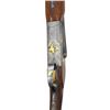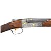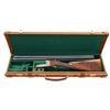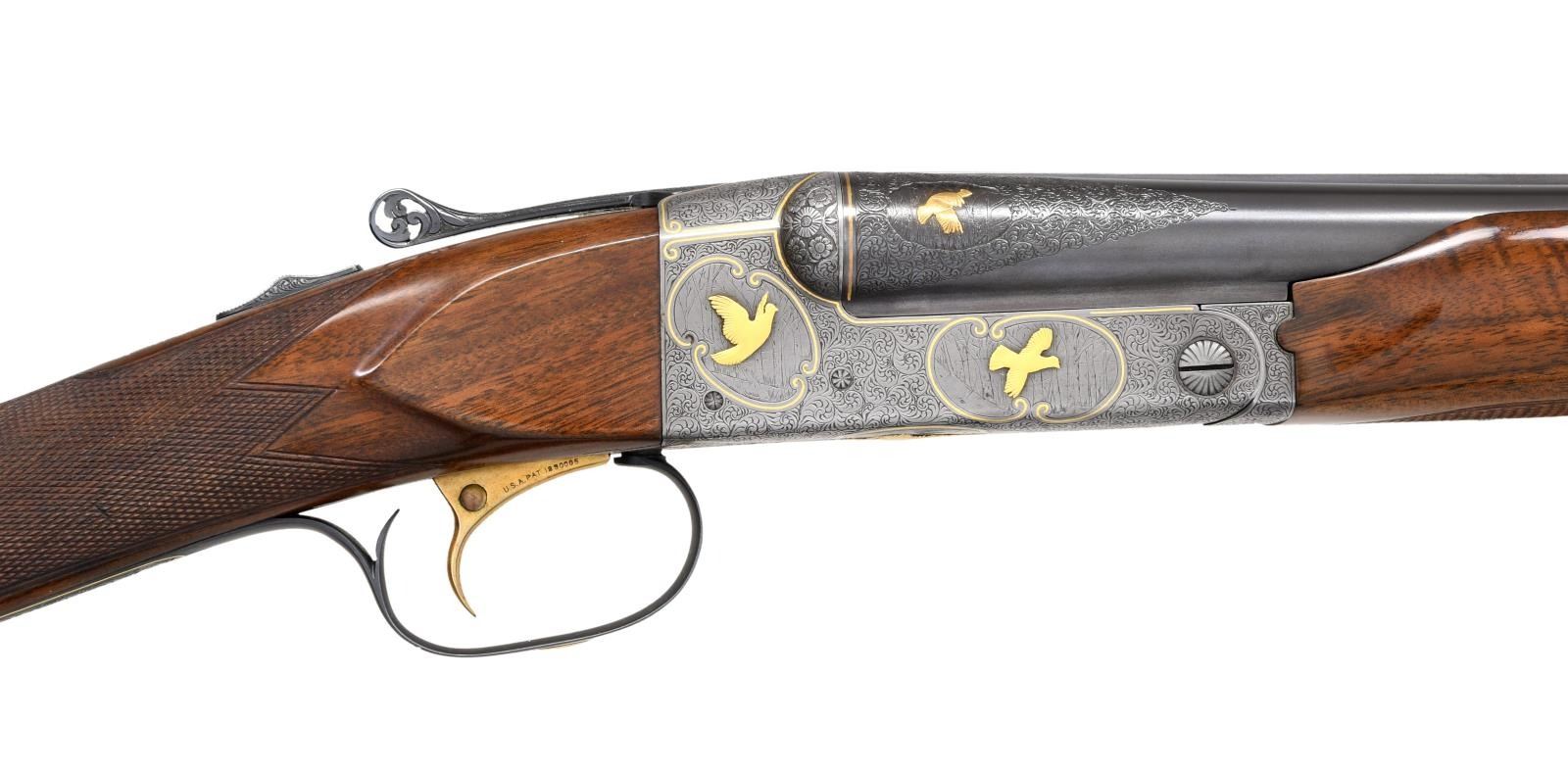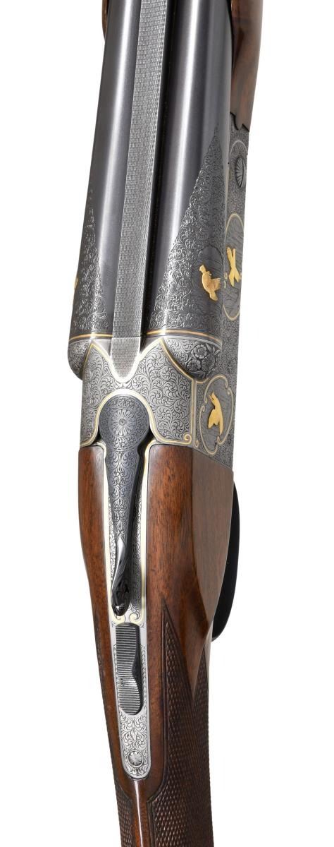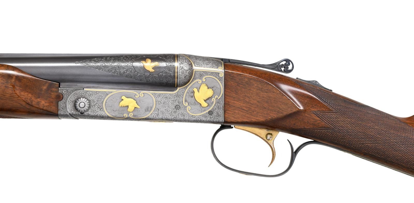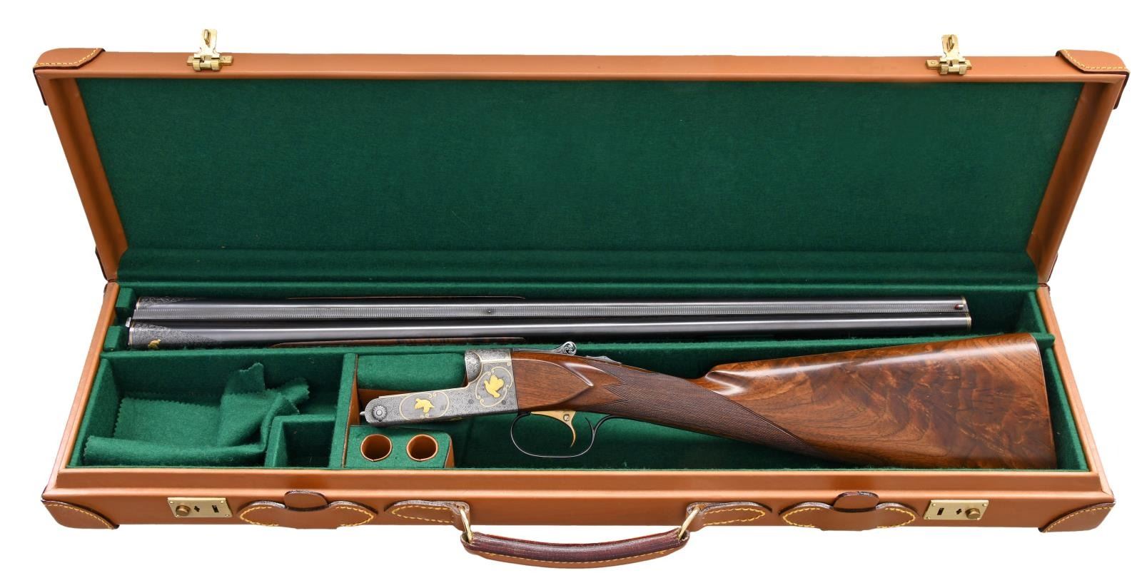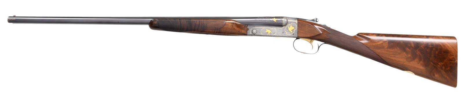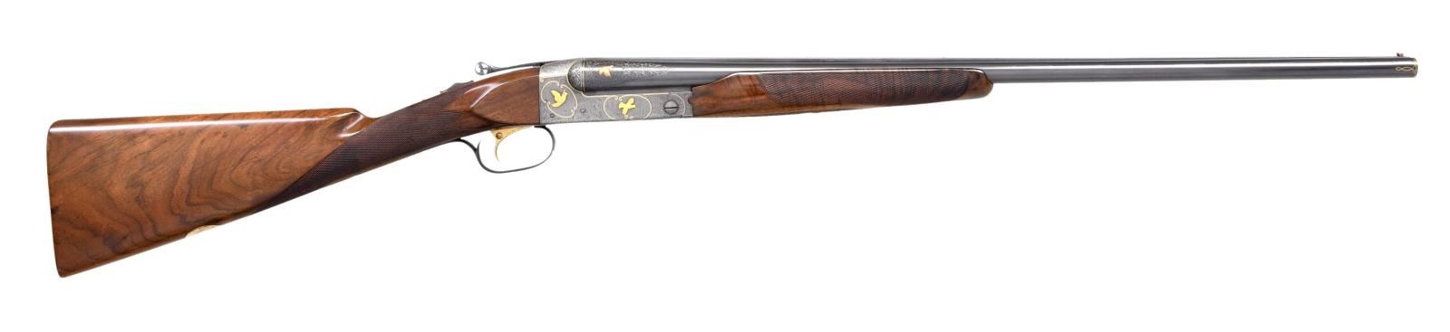 PACHMAYR WITH SUPERB ENGRAVING AND RELIEF GOLD INLAY BY RICHARD BOUCHER. Cal. 20 Ga. 2-3/4". S# 9972. The late Richard Boucher did a considerable amount of work for Pachmayr in the 1960s and 1970s. This nicely embellished gun has 26" barrels marked for skeet 1 and 2 chokes. Breech ends are engraved with 3" triangles of simple scroll surrounding game scenes with birds in relief gold. A quail takes wing in a desert environment on the left, and a ruffed grouse erupts through birch trees on the right. Gold bands are around the breech ends and muzzles. Coin-finished flat-side model 21 action with non-automatic safety and a gold-plated single selective trigger has all factory markings on the engine-turned watertable. Action is engraved with full coverage on a on a varying-size simple scroll with some semi-relief floral highlights within gold wire-inlaid borders. Game scenes on sides of the action continue the barrel theme with two vignettes of quail in the desert on the left and ruffed grouse in the birch and alders on the right. Trigger plate features a fine scene of two relief gold pheasants, one falling from the sky as another flies off, in woodlands with conifers in the background. This scene is signed "BOUCHER". A pointer head is on the trigger guard bow. Blued top lever has a nicely pierced and scroll-sculpted thumb piece. The quality of this attractive work is very fine, with softened details in gold of birds and good bulino shading of backgrounds. Original factory straight grip buttstock made of nicely crotch-figured American walnut measures 14-1/8" over checkered wood butt. Point pattern checkering is at grip, and a large gold oval engraved with the monogram "RLN" is on the toeline. The matching unbraced beavertail ejector forend has engine turned iron and the usual "J" spring and knurled button secondary releases. MEASUREMENTS: BBLS: Bore Diameter: L .624. R .625. Restriction: L .008 (skeet 2). R .015 flare (skeet 1). Wall thickness: L .032. R .029. STOCK: DAH: 1-13/16". DAC: 1-5/8". CAST: neutral. LOP: 14-1/8". WEIGHT: 6 lb. 9 oz. UNATTACHED ACCESSORIES: gun is housed in a tan leather case made by the famous Italian based case maker Emmebi with glued corners and lined in green felt. Case contains keys and a tan cloth zippered outer cover. CONDITION: very fine, as custom-finished. Retaining nearly all custom finishes on metal and wood with only a few scattered very light handling and assembly marks, most notably two dings and some minor chatter on the bottom front of the forend. Bores are bright and shiny. Action is tight. Mechanically good. Case is good. (23-6964/MGM). CURIO. $8,000-12,000.