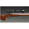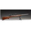 ACTION TARGET RIFLE. Cal. 308 Win. S# G1313061. Bbl. 26 7/8". Model 70 bolt action rifle mfg. by Winchester in 1977 and subsequently customized into a target/competition configuration. The underside of the heavy tapered stainless steel Obermeyer bbl. is marked "1588 308 11/ 7-78 111", followed by "BJQ/ RTD". Receiver exhibits standard factory markings, with an apparent "HALPLAIT" or "HALPLATT" lightly etched on the underside. Receiver exhibits a matte blue finish, with the bolt handle, bolt shroud, trigger guard, and floorplate exhibiting a polished blue finish. Bolt body is jeweled and polished in-the-white. 1-piece plain wood pistol grip stock features an aluminum hand stop rail on the underside of the forearm (currently fitted with a Harris 1A2 Ultralight bipod), a flare at the bottom of the pistol grip, as well as a Mershon Company "White Line" Sure Grip grooved black rubber recoil pad. Bbl. features a removable black anodized aluminum dovetail mount. Receiver is drilled and tapped with 2 dovetail rails and 2 scope rings, featuring a TASCO World Class 3-9x50mm scope. CONDITION: metal components retain the vast majority of their factory finishes, exhibiting some superficial handling marks overall. Brilliant mirror bore, exhibiting sharp and well defined rifling throughout. Proper manual mechanics. Stock shows a few scattered superficial marks and small impressions, but otherwise remains very good to excellent overall. Scope retains a clear and sharp optic. PROVENANCE: From the Buckstix Collection. (25-6491/MLW). MODERN. $1,800-2,700.