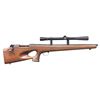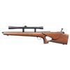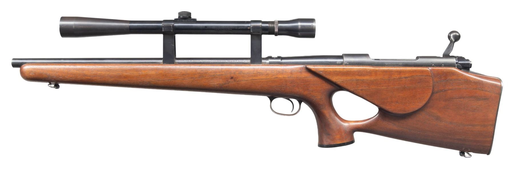 RIFLE. Cal. 257 Roberts. S# 284001. Bbl. 21 1/8". Model 70 bolt action rifle originally mfg. by Winchester in 1954 and later converted into a custom bullpup rifle by L.H. Brown. The left side of the shortened factory bbl. exhibits standard markings denoting the model and cal. designations. Left side of the receiver is marked with the Winchester trademark logo, with the S# marked on the right side of the chamber. Metal components exhibit a blue finish overall, save for on the bolt body and follower which are polished in-the-white. Custom 1-piece plain wood thumbhole stock with dark wood pistol grip cap, raised cheek rest, as well as a Model 70 checkered steel buttplate. Toeline of butt and underside of forearm feature sling studs and swivels. Custom made high profile scope mounts fitted with a Lyman Alaskan All-Weather 4x scope. Rear sight dovetail slot is empty. Receiver is factory drilled and tapped with plug screws. Bolt matches the receiver via the full S#, which is electro-penciled on the underside of the bolt body. UNATTACHED ACCESSORIES: generic soft case. CONDITION: metal components retain large amounts to the majority of their original factory blue finish, exhibiting some areas of wear and thinning fading to gray patina (predominately on bolt knob and trigger guard), with some light edge wear present overall. Mirror bore, exhibiting some scattered spots of what appears to be either hardened grease or light surface oxidation, while retaining strong rifling throughout. Proper manual mechanics. Scope retains a clear and sharp optic. PROVENANCE: From the Buckstix Collection. (25-6724/MLW). MODERN. $1,500-2,250.