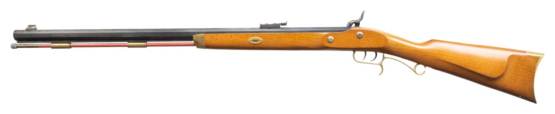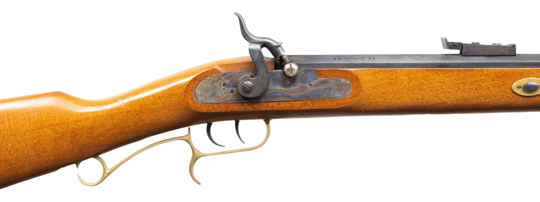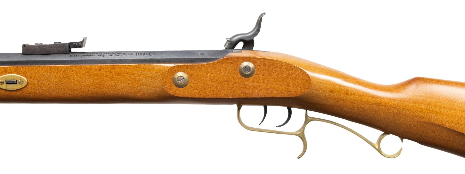 Cal. 50. S# 508057. Bbl. 28". Bead front sight. Adjustable rear sight. Spanish made percussion rifle. Double set triggers. Case colored lock & hammer. Blued bbl. Brass furniture. Hardwood stock set. CONDITION: stock shows scattered light handling marks & wear. Brass parts are turning a dull yellow with some handling marks & tarnishing. Lock & hammer retain most of their case colors with some light oxidation & operational wear. Bbl. retains 93% bluing with some handling marks, edge wear & light oxidation at muzzle. Action functions properly when hand cycled. Bore shows scattered oxidation & fouling but strong rifling. (01-28305/MJC). ANTIQUE. $100-200.