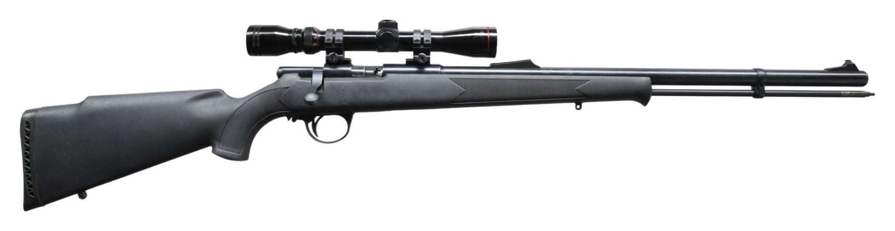 Cal. 50. S# 61-13-043020-00. Bbl. 25". Ramped bead front sight. Rear iron sight not present. Receiver mounted Simmons 3-9x power scope with duplex crosshair reticle & very good optics. Blued finish. Black synthetic stock with bottom mounted sling studs & black recoil pad. LOP: 14 1/4". Ramrod present. CONDITION: stock shows some handling marks & light dings. Metal retains 95% blue with some edge wear, handling marks & light oxidation. Action appears to function properly when hand cycled. Bore shows scattered pitting & oxidation but strong rifling. (01-27881/MJC). ANTIQUE. $100-300.