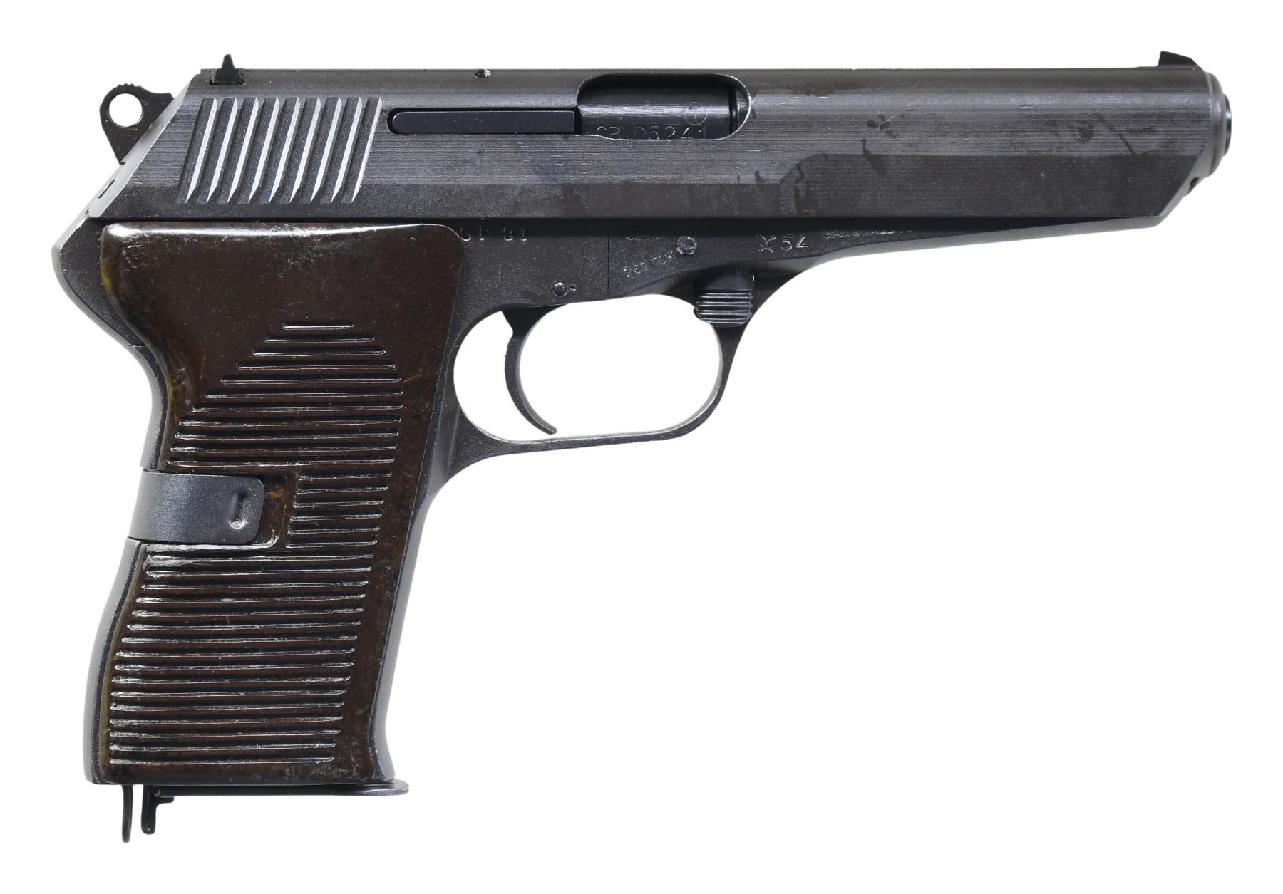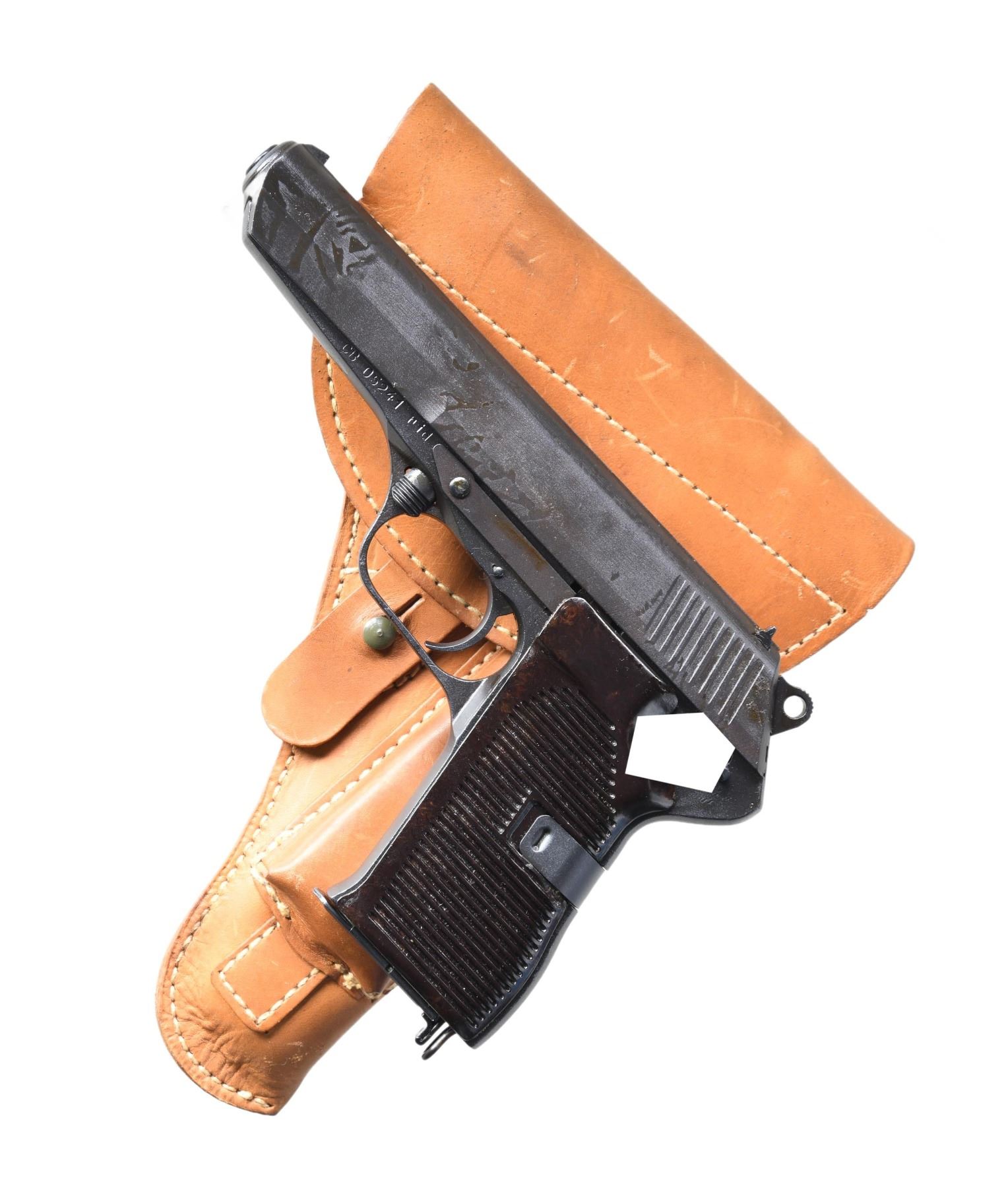 Cal. 7.62x25. S# CB05241. Bbl. 4 3/4". Blade front sight. Square notch rear sight. Matching numbers on frame, bbl. & slide. Right side of frame has crossed swords 54 Czech acceptance stamp & Century import markings .Left side of frame has "rld" marking. Matte black finish. Grooved brown plastic grips. MAGS: 2-8 rd. UNATTACHED ACCESSORIES: tan CZ-52 holster. CONDITION: grips show scattered light handling marks. Metal retains nearly all its arsenal rework matte black finish with scattered dried cosmoline. Action functions properly when hand cycled. Very good bore with scattered dried cosmoline but strong rifling. (25-2687/MJC). CURIO. $200-300.