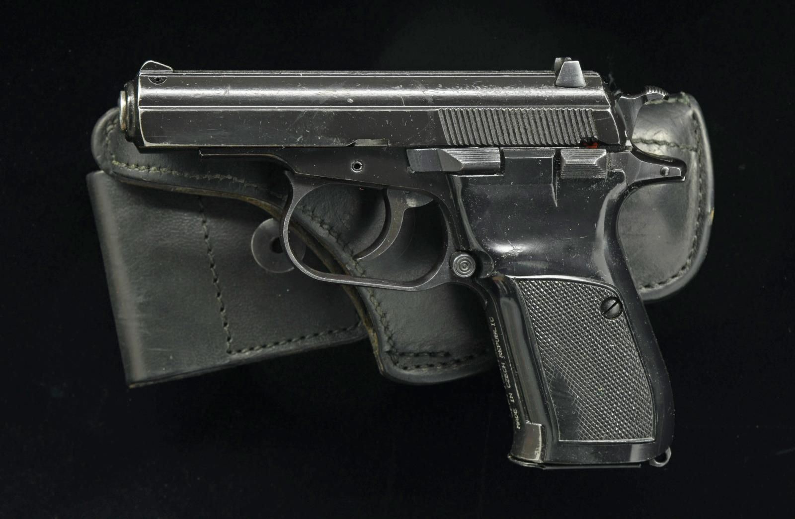 Cal. 9mm Makarov. S# 186013CZ. Bbl. 3 3/4". Ramped front sight w/ white paint. Fixed rear sight w/ white paint. Right side of frame is marked "she90" denoting mfg. in 1990. Matching numbers on bbl. & slide. Import marking on right side of slide & front strap. Finger groove black grips. Lanyard ring on bottom of grip frame. MAGS: 1-13 rd. w/ crossed sword marking. UNATTACHED ACCESSORIES: right handed Zili Praha black leather thumb break holster. CONDITION: grips show a couple dents, some flattened points, scratches & handling wear. Metal retains 92% arsenal black enamel w/ scattered light flaking. Very good bright bore. (23-2693/MJC). CURIO. $250-350.