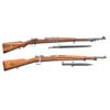 1) CZECH MODEL 98/29 PERSIAN. Cal. 8x57mm. S# R7721. Bbl. 29 1/4". Very nice example w/ crisp markings of Persian Model 98/29 rifle mfg. in Czechoslovakia. All original markings are in Farsi & numbers match throughout. Import marked under bbl. & rifle given importer S# of "R7721". Untouched Persian lion crest on top of receiver ring. Straight bolt handle. Tangent rear sight. Inverted V front sight w/ protective ears. Cleaning rod is present. All milled furniture. Matching walnut stock set. UNATTACHED ACCESSORIES: matching numbered 15 3/8" fullered blade bayonet w/ walnut grips. Bayonet is marked only w/ S#. Blued steel scabbard. Bright finished bayonet has scattered stains & handling marks, but very nice overall appearance. Scabbard has 80% blue w/ sm. scratches & sm. spots of peppery oxidation. CONDITION: original finish stock set has very light wear & scattered sm. handling marks throughout. Metal has 90% original blue w/ scattered sm. spots of missing finish. Near excellent shiny bore. (21-1184/RW). 2) HUSQVARNA MODEL 1938 SHORT RIFLE. Cal. 6.5x55. S# 679780. Bbl. 23 3/4". Matching numbers throughout, except upper & lower bands. Import marked underneath bbl. Receiver is marked "HUSQVARNA VAPENFABRIKS AKTIEBOLAG 1943". Turned down bolt handle. Tangent rear sight graduated to 600m. Blade front sight. Muzzle has been threaded for blank firing attachment. Cleaning rod is present. Non matching hardwood stock set. Ballistic information decal has been removed from right side of buttstock. Buttstock has brass condition disk. UNATTACHED ACCESSORIES: 8 1/4" spear point blade bayonet w/ checkered steel grip. Left ricasso marked w/ crown acceptance mark & "534". Right ricasso has crown of "C". Steel scabbard marked w/ "L / 12 / No. 45b / No. 4035". Bayonet has been sharpened. Blued crossguard, grip & scabbard have 70% finish w/ thinning & wear. CONDITION: Stock set has moderate wear & handling marks throughout. Metal has 75% thinning original blue w/ light wear & scattered sm. scratches. Very good shiny bore. (21-1187/RW). ALL CURIO. $800-1,100.