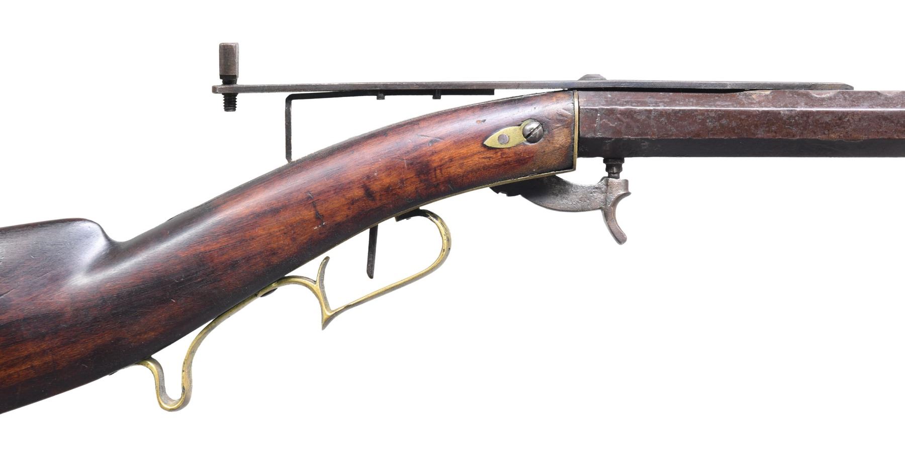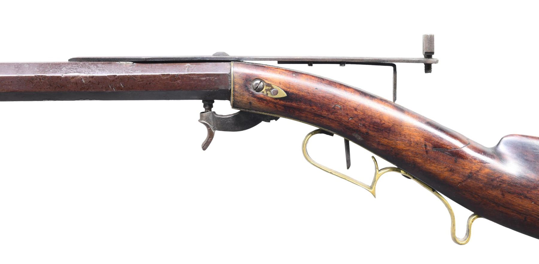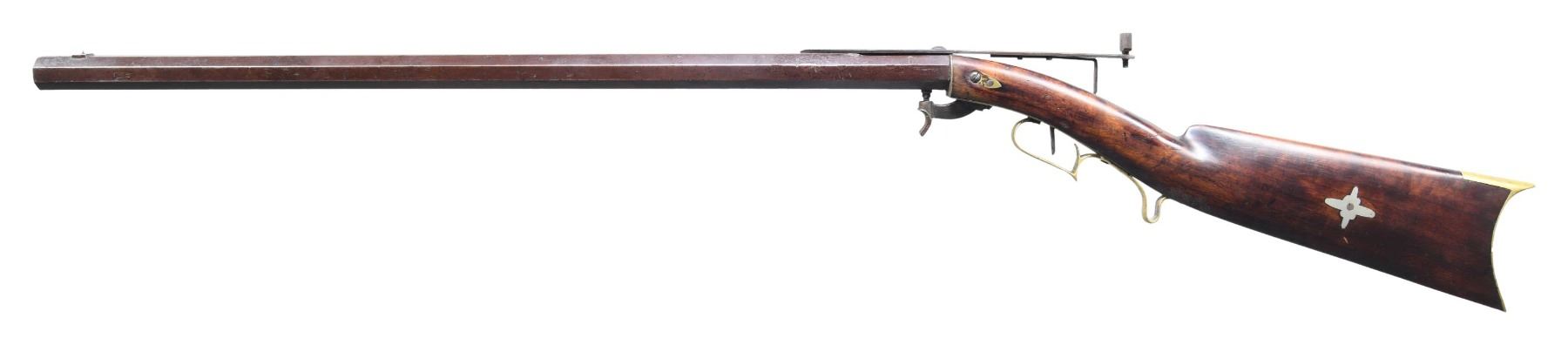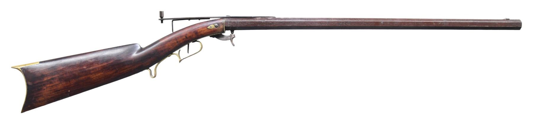 RIFLE. Cal. 54. NSN. Bbl is 25 1/4" oct measuring 15/16" across flats at muzzle. As noted in "American Gunsmiths" by Frank Sellers David Hall Hilliard; builder of underhammer guns in Cornish, NH 1842-1877. Bead front sight w/ long strap style peep rear sight. Underhammer action w/ plain trigger. Stock has brass trigger plate, escutcheons, trigger guard and crescent buttplate. Left side of stock has a German silver star. CONDITION: bbl has faded brown appearance showing dents and wrench marks on edges. Refinished stock is cracked through the left wrist showing scattered scratches and marks. Functioning action. Dark bore has no remaining visible rifling. (01-26551/DS). ANTIQUE. $500-1,000.