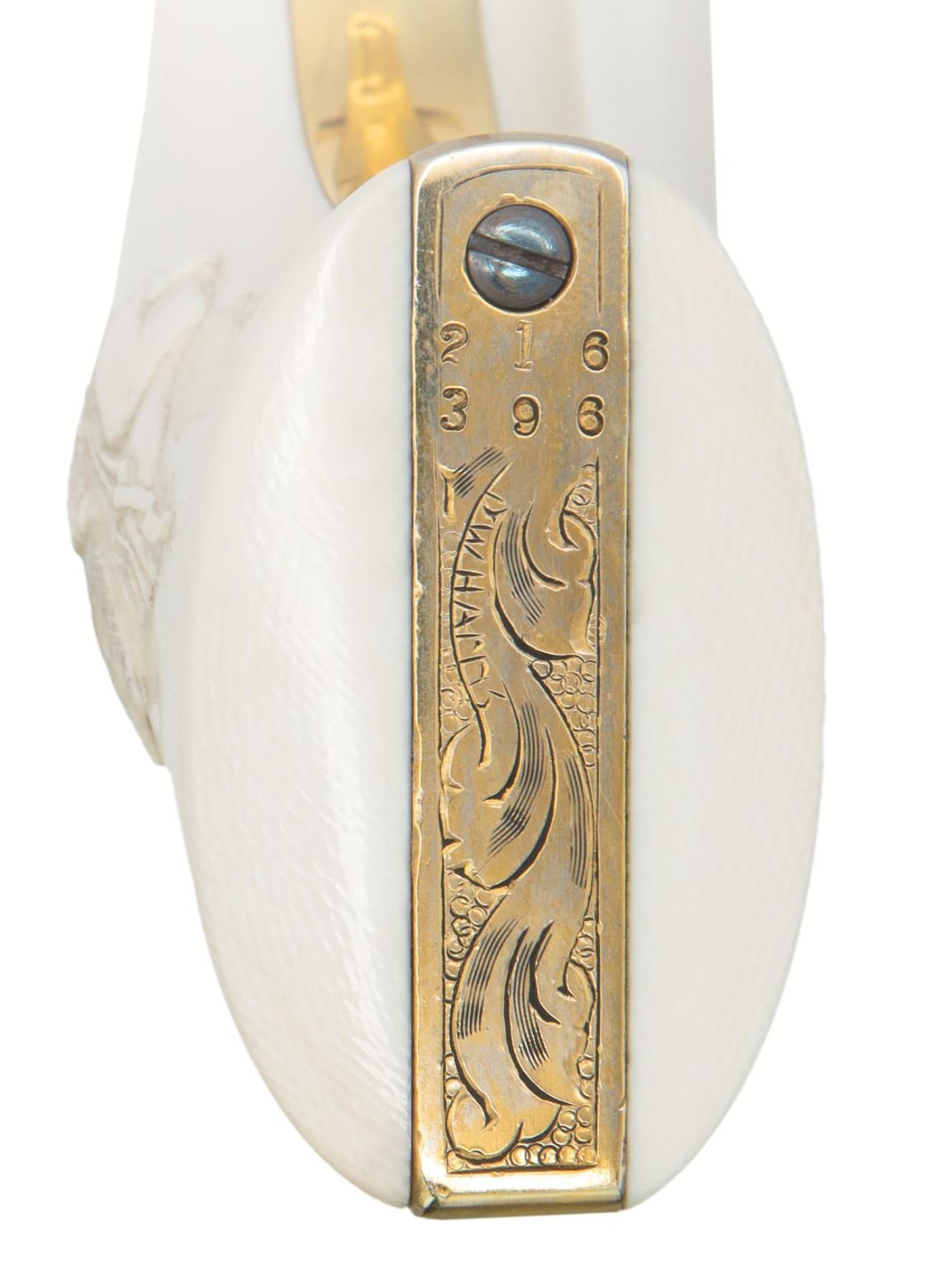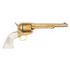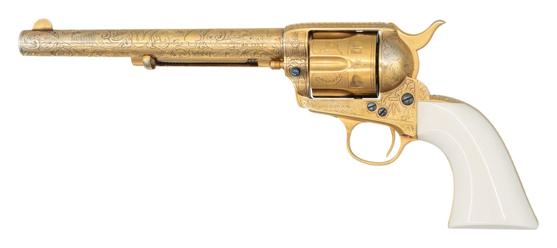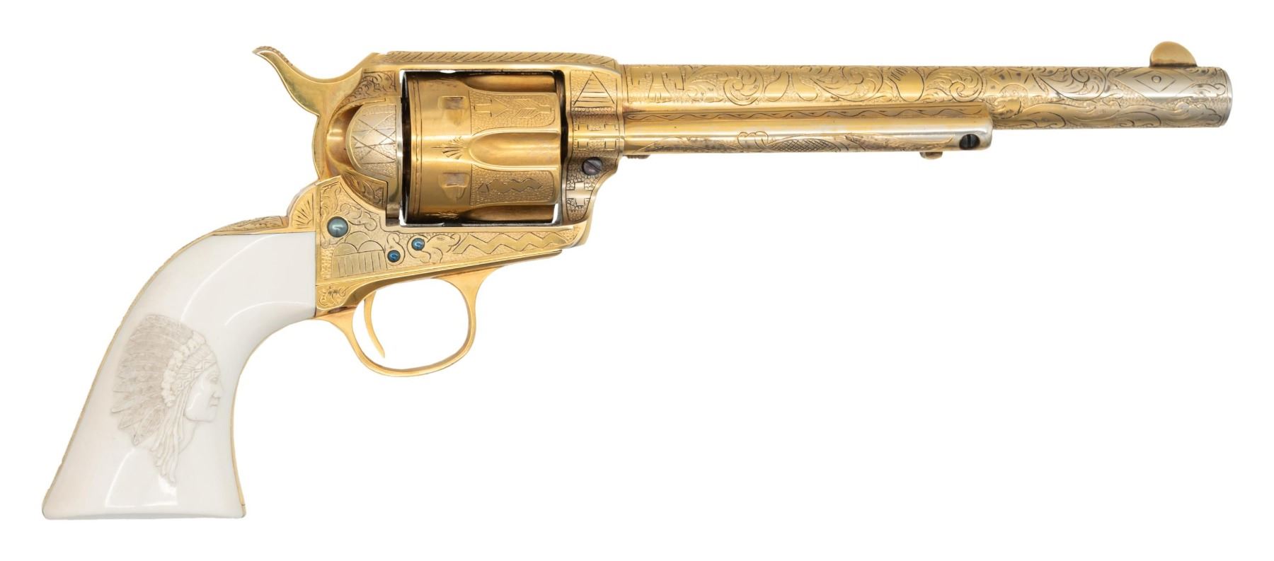 ACTION ARMY REVOLVER. Cal. 45 Colt. S# 216396. Bbl. 7 1/2". Mfg. in 1901. Left side of the bbl. is marked "45 COLT" with Colt's single line address marked across the top. Left side of frame with Colt's 2-line patent information followed by the Rampant Colt logo. Near full coverage custom aftermarket engraving consisting of scroll work, as well as various patterns and motifs on a punch dot background. Butt is signed "DW HARRIS". Metal components exhibit an aftermarket applied gold plated finish, with frame screws and cyl. base pin button exhibiting a nitre blue finish. Frame is mounted with a 1-piece smooth natural white grip. Right side of grip features a relief carved Native American head. Standard SAA pattern blade front sight and frame notched rear sight. Matching numbers are present on the frame, trigger guard, and rear grip strap. Cyl. is mismatched. CONDITION: metal components retain virtually all of their aftermarket gold plated finish, showing some spots of light pitting beneath the finish. Nitre blue screws show some light to mild wear and thinning. Proper manual mechanics. Mirror bore, retaining well defined rifling throughout. Grip is excellent. PROVENANCE: The Esteemed Norm Greenberg Collection. (25-4129/MLW). CURIO. $4,000-6,000.