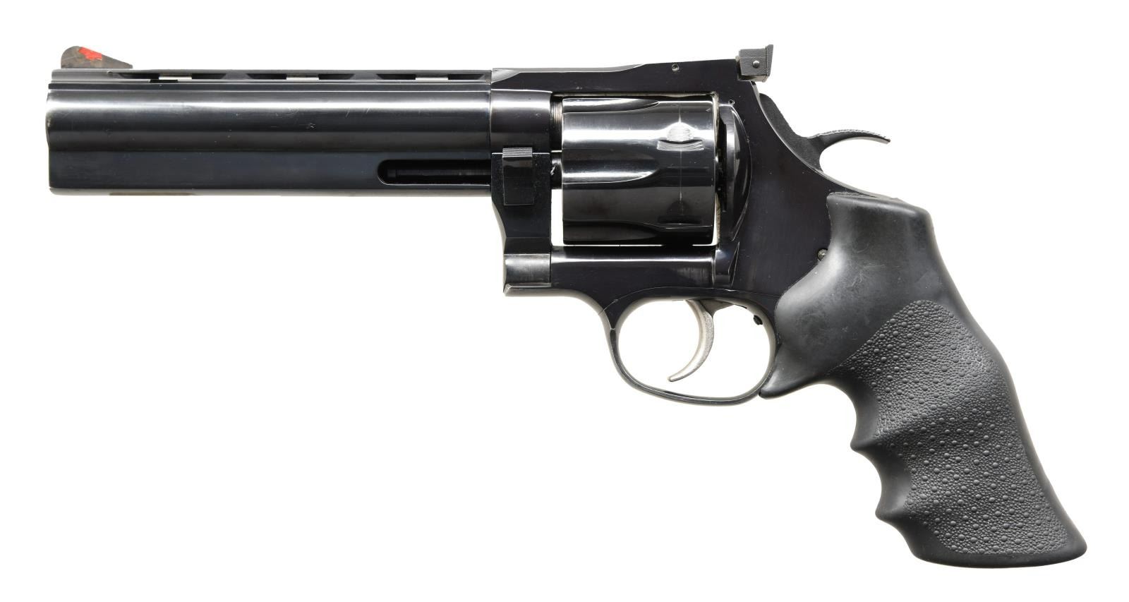 Cal. 44 Mag. S# B002873. Bbl. 6" VR. Serrateed blade front sight w/ red insert. Adjustable rear sight. Blue finish. Hogue finger groove grips. CONDITION: grips show scattered handling wear & dust staining. Metal retains 95% original blue w/ a drag line on cyl. & some scattered edge wear. Bright very good plus bore. (23-4920/MJC). MODERN. $900-1200.