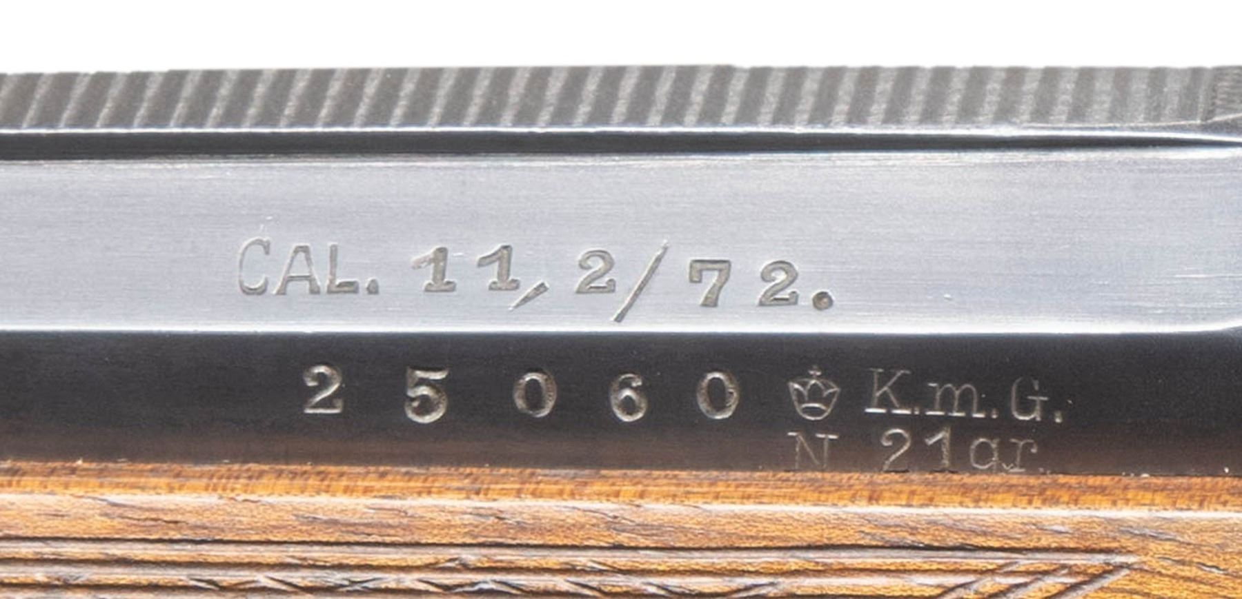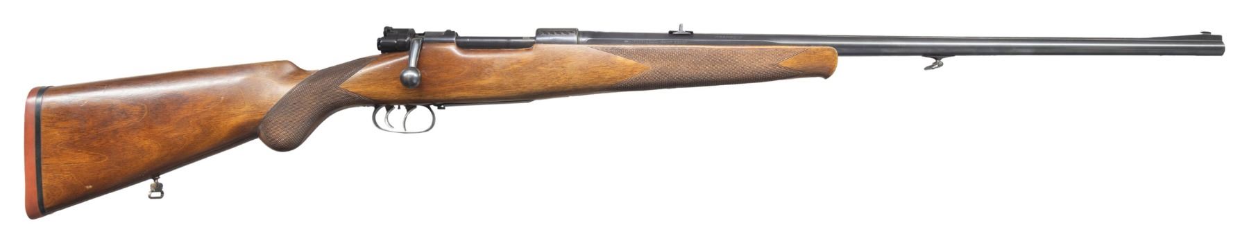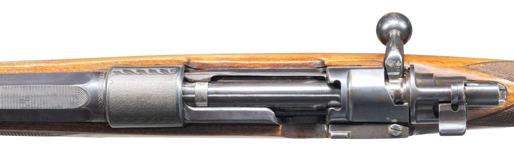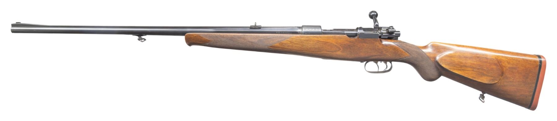 Cal. 11.2x72 Schuler. S# 25060. The 26-1/2" one third octagon, 2/3 round barrel has integral matted top rib mounted with one standing, two folding leaf rear and silver bead front sights. Top right flat is engraved "A. Jansen" and top left with "Bruxelles". Caliber and S# are on left rear. Large ring model 98 standard length action with "BU" proofs has had bolt handle turned down. Bottom metal has extension at top to accept large diameter cartridges with rebated rims and is fitted with double set triggers. Floorplate removes with push button at rear. Action and bottom metal have some simple foliage and scroll engraving. Round knob pistol grip stock measures 14-5/8" over Silver type pad and features right hand cheekpiece, point pattern checkering at grip and forend and schnabled forend tip. Sling loops are on toeline and bottom of barrel. CONDITION: very fine. Metal retaining nearly all of what appears to be original blue. Stock has most of its original oil finish with a few scattered marks. Bore is bright and shiny. Mechanically good. PROVENANCE: From the Buckstix Collection. (25-6414/MGM). CURIO. $3,000-5,000.