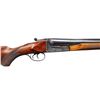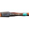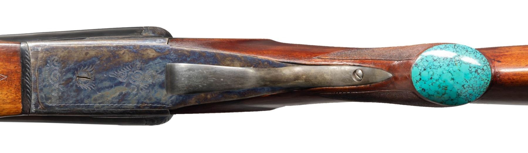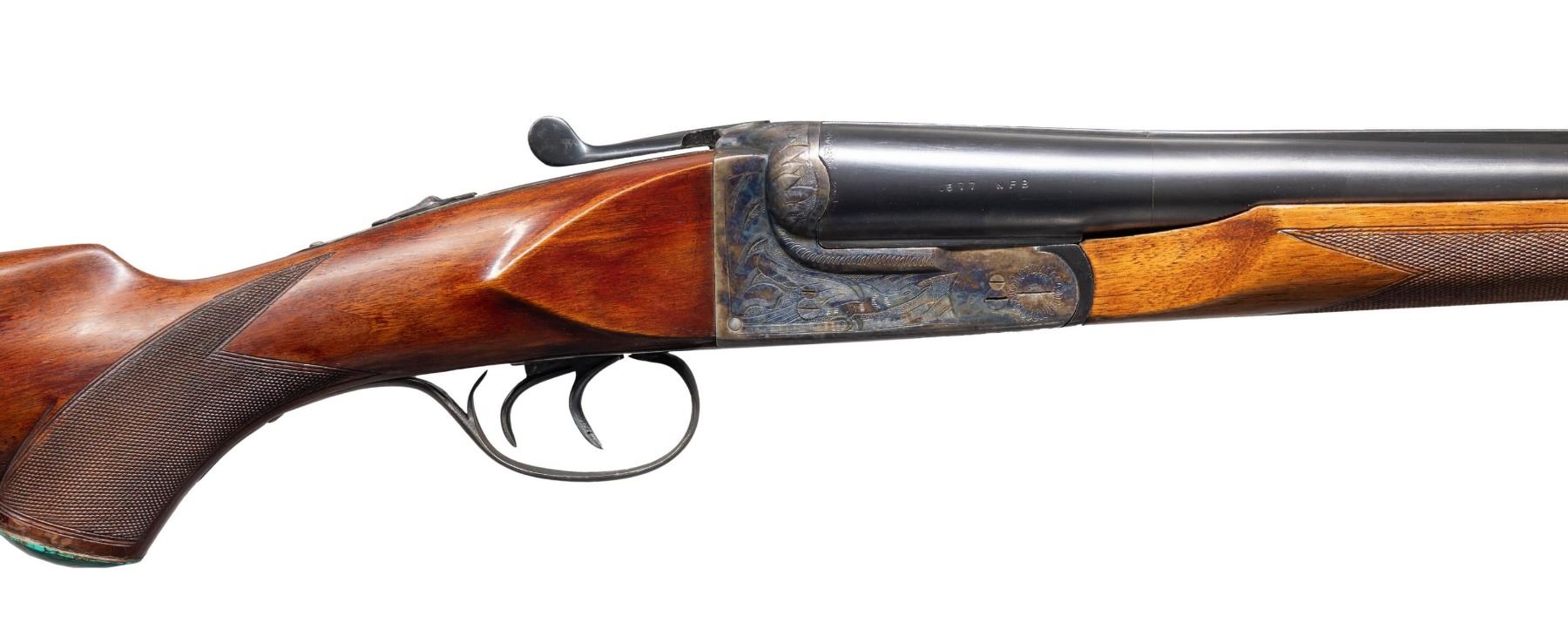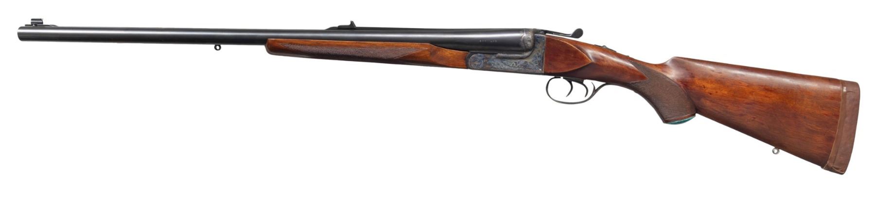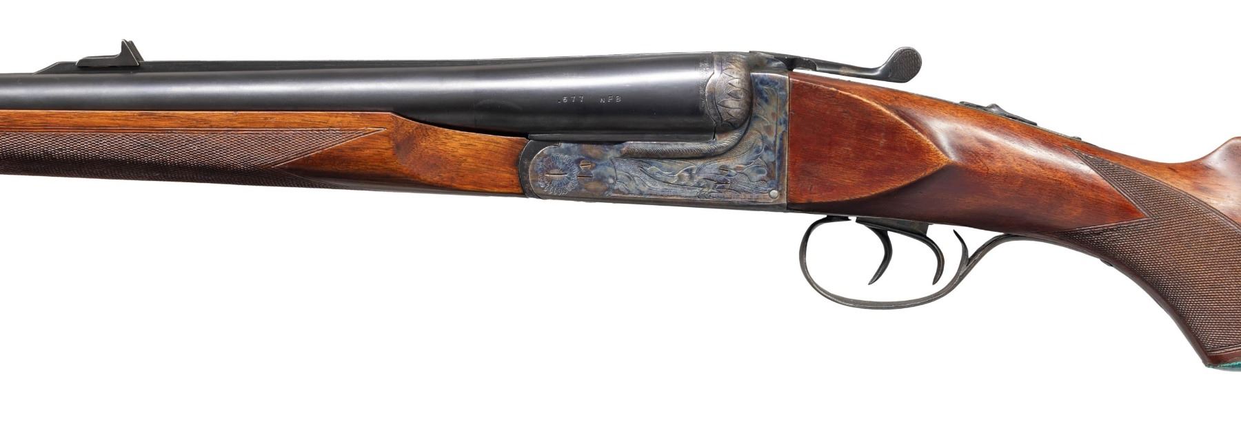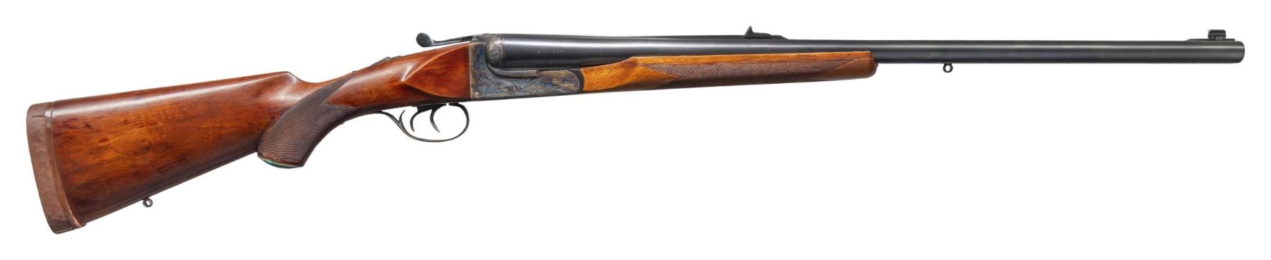 SHOTGUN BY BOB HYNDEN WITH CASE. Cal. 577 Nitro for Black. S# PG33312. Using a Laurona 10 Ga. magnum boxlock action barrels were monobloced, new ribs fitted and barrels regulated. The 26" barrels fitted with matted quarter rib holding single leaf express rear sight and silver bead in raised ramp are stamped with caliber on each side. Barrel flats with original Spanish proofs are newly stamped "650 GR. BUL. MAX" "80.0 GR IMR 4198". A sling eye is screwed to bottom rib. Case hardened boxlock action with automatic safety, hidden third fastener, side clips, reinforced frame and double triggers is engraved with broad shaded acanthus around flying bird on each side. Turquoise stone capped pistol grip buttstock measures 13-3/4" over recoil pad covered with brown tape. Point pattern checkering is at grip and a sling eye is on toeline. Matching beavertail forend has Anson release. UNATTACHED ACCESSORIES: rifle is housed in new green canvas case with tan leather corners; lined in green felt. A Bob Hynden label is in lid along with a test target showing good regulation of barrels. CONDITION: fine as custom finished. Barrels retaining nearly all custom applied black. Action retains nearly all original case hardening color. Trigger guard re-blued and silvered on tang. Stock with added finish and color. Bores are very fine. Action is tight. Mechanically good. Case is very fine "near new". PROVENANCE: From the Buckstix Collection. (25-6366/MGM). MODERN. $2,500-3,750.
