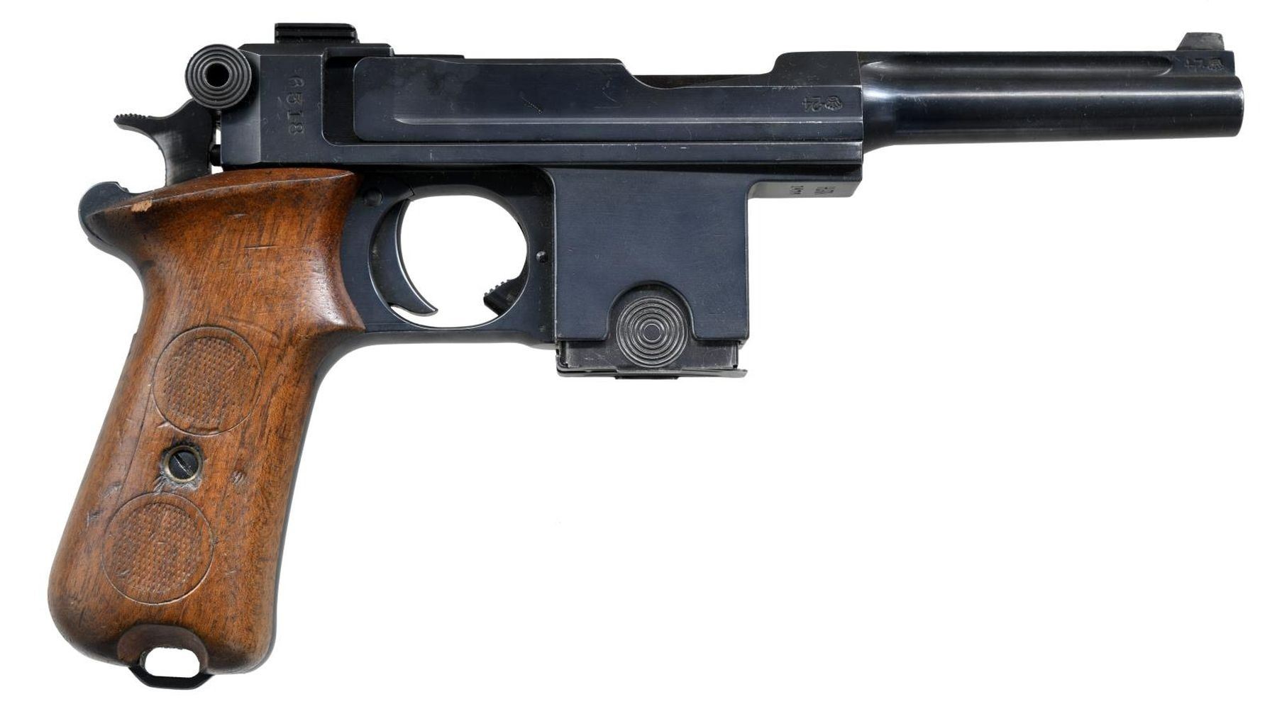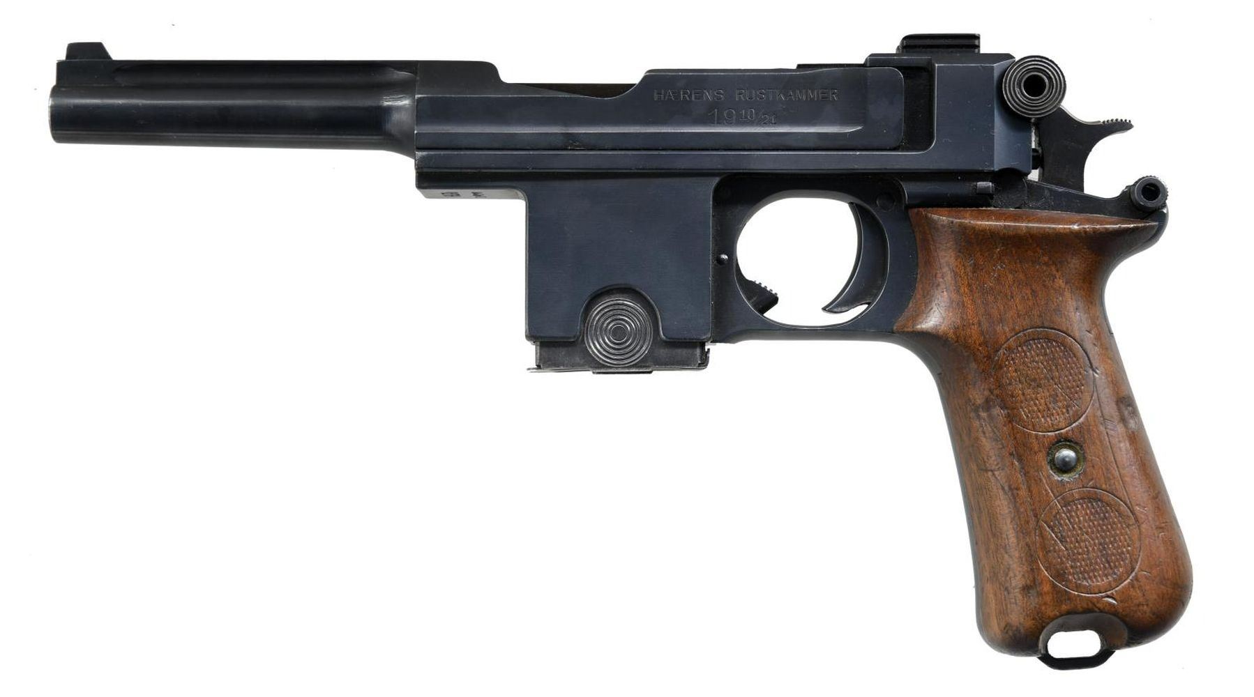 Cal. 9mm Bergmann. S# 1476. Bbl. 4". Mfg. 1924. Blade front sight. Fixed rear sight. Danish mfg. example marked "HAERENS RUSTAMMER" & "1910/21". Right side of frame marked w/ inventory number "6318". Checkered hardwood grips. MAGS: 1-6 rd. numbered "1718". CONDITION: grips show worn checkering, scattered dings, light scratches & handling marks. Metal retains 92% arsenal blue w/ some light dings, edge & handling wear. Fair bore w/ scattered frosting. (23-1025/MJC). CURIO. $1000-1500.