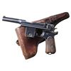 SEMI-AUTOMATIC PISTOL WITH DESIRABLE HOLSTER. Cal. 9mm Bergmann. S# 11111. Bbl. 4". Model 1910 Bergmann Bayard semi-automatic pistol mfg. in Belgium by Anciens Etablissements Pieper under contract for Denmark. The left side of the of the bbl. extension is marked "BREVETE./ S.G.D.G.", followed by "ANCIENS ETABLISSEMENTS PIEPER./ HERSTAL-LIEGE./ BERGMANN'S PATENT", with the right side exhibiting assorted Belgian commercial proofs, which are also present on the right side of the bbl. and on the top of the bolt. Right side of the frame is marked with the Danish army S# "3696", with the underside of the frame marked with the full S# "11111". Metal components exhibit a rust blue finish overall, with some small parts exhibiting a straw finish. Bolt, firing pin, locking block, and hammer are polished in-the-white. Frame is mounted with 2-piece checkered wood grips. Fixed blade front sight, fixed V-notch rear sight. Nearly all serialized parts are matching and include the frame, slide, rear sight, bolt, locking and locking block. Grips are matching via the full S# on the interior of the panels, which has been over stamped above their previous S#s. Firing pin is mismatched (S# 713). MAGS: 1 matching 6-rd. UNATTACHED ACCESSORIES: brown leather Danish holster marked with a Danish Crown/11 on the front of the closure flap. Holster retains its cleaning rod, and it fitted with a brown leather shoulder strap. CONDITION: metal components retain the majority of their original blue finish, exhibiting some areas of wear and thinning that show through to gray patina, scattered spots of light surface oxidation, as well as scattered superficial marks from handling and storage. Fair bore, exhibiting consistent mild to moderate pitting and a spot of dark pitting, while retaining strong rifling throughout. Strawed parts retain traces of their original finish. Firing pin retention pin exhibits a large chip on the rim. Grips show scattered superficial marks and impressions from handling and storage, but otherwise remain sturdy and serviceable. Holster remains malleable, exhibiting wear, with varying degrees of age related cracking and crazing present overall. Shoulder strap remains malleable, exhibiting varying degrees of age related cracking and crazing overall, with the buckle exhibiting moderate pitting. (24-6969/MLW). CURIO. $2,500-3,500.