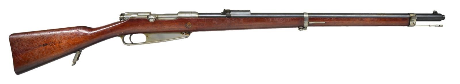 Cal. 8mm Mauser. S# 9005. Bbl. 29 1/4". All visible numbers match. Rifle mfg. at Danzig Arsenal was given 1905 conversion to utilize standard Mauser stripper clips in place of the original en bloc clip. Receiver bridge modified by riveted on clip guards. Receiver ring has clearance cut for bullet tips. Left rail has been given shallow thumb slot. Left mag. wall has spring loaded cartridge retainer. Clip release has been removed & plated over in trigger guard. Rifle does not have mag. opening cover. Left receiver rail marked in gothic "Gew 88." Receiver ring marked on top w/ "imperial crown" "DANZIG 1890 S." Receiver ring marked on right side w/ imperial proofs "SJ?" Ladder rear sight graduated to 2000m. Inverted "V" front sight. Double slotted cleaning rod. Upper band w/ bayonet lug marked "8. R. J. 3.139.". Lower band has crossed out unit markings. Walnut stock. Stock markings have been rendered obscure due to professional refinish. CONDITION: stock has added coat of lacquer as preservative w/ wear, flaking & scratches. Receiver, trigger guard, bolt & furniture are bright w/ light wear & staining. Bbl. jacket has original blue w/ thinning wear & scattered areas of fine pitting. Bore is shiny w/ strong lands. (01-19374/RW). ANTIQUE. $400-600.