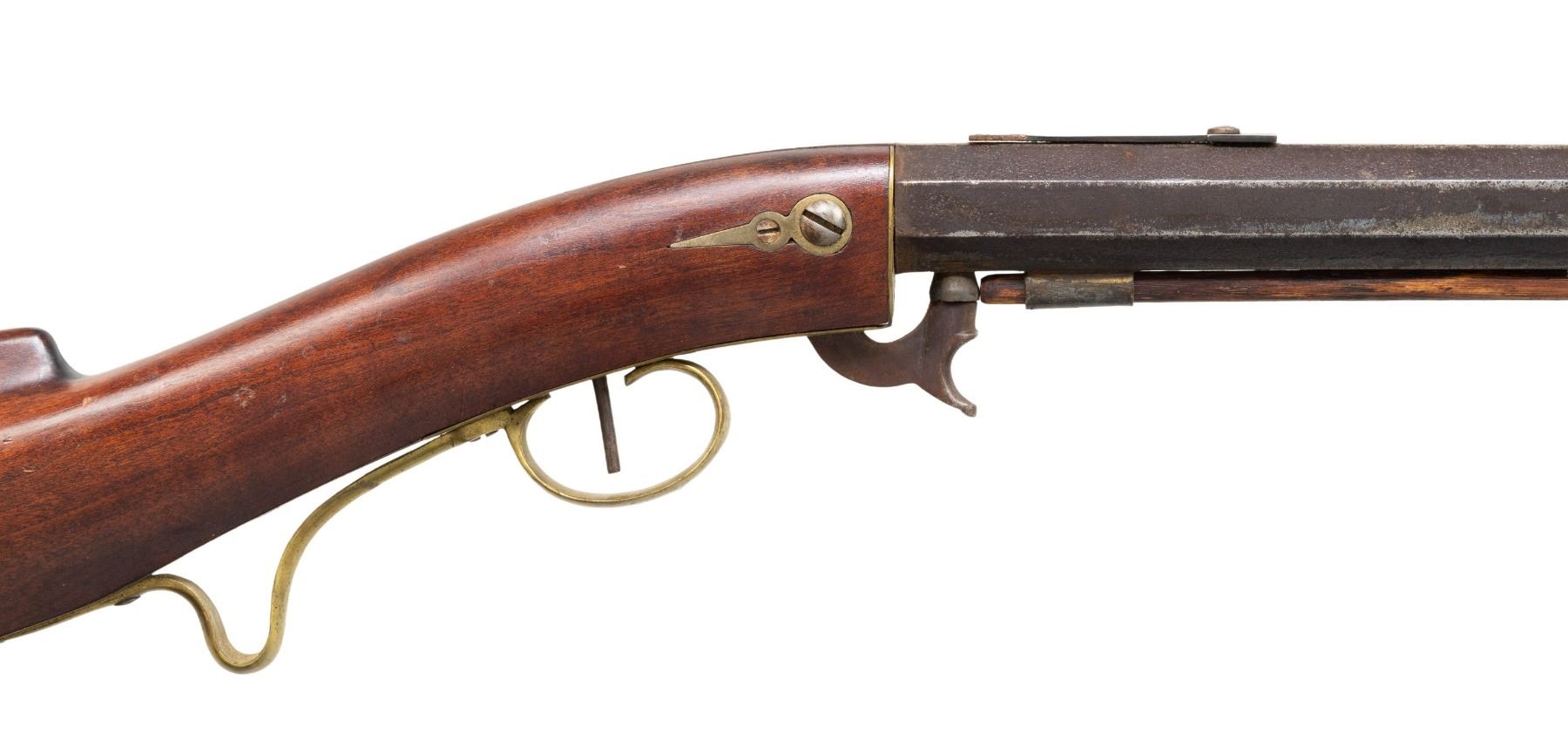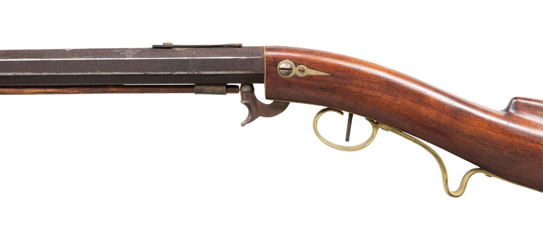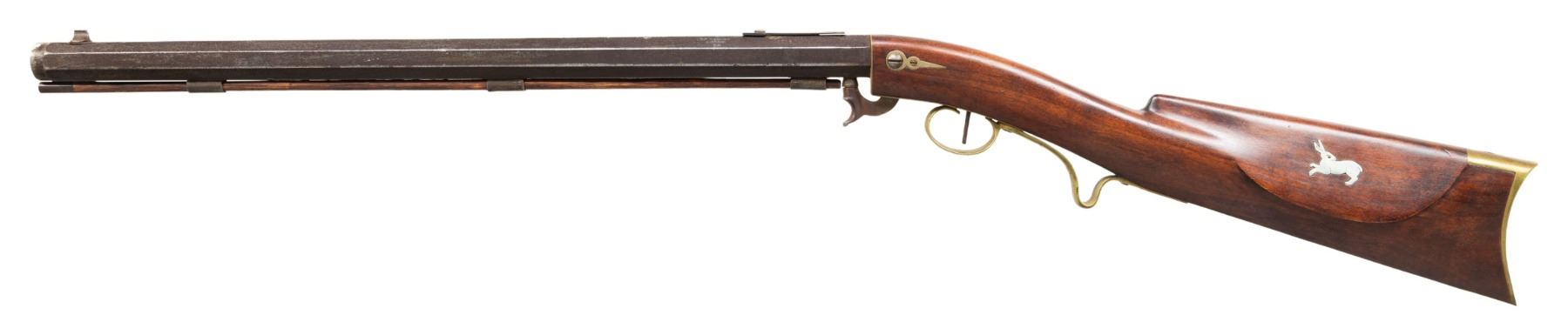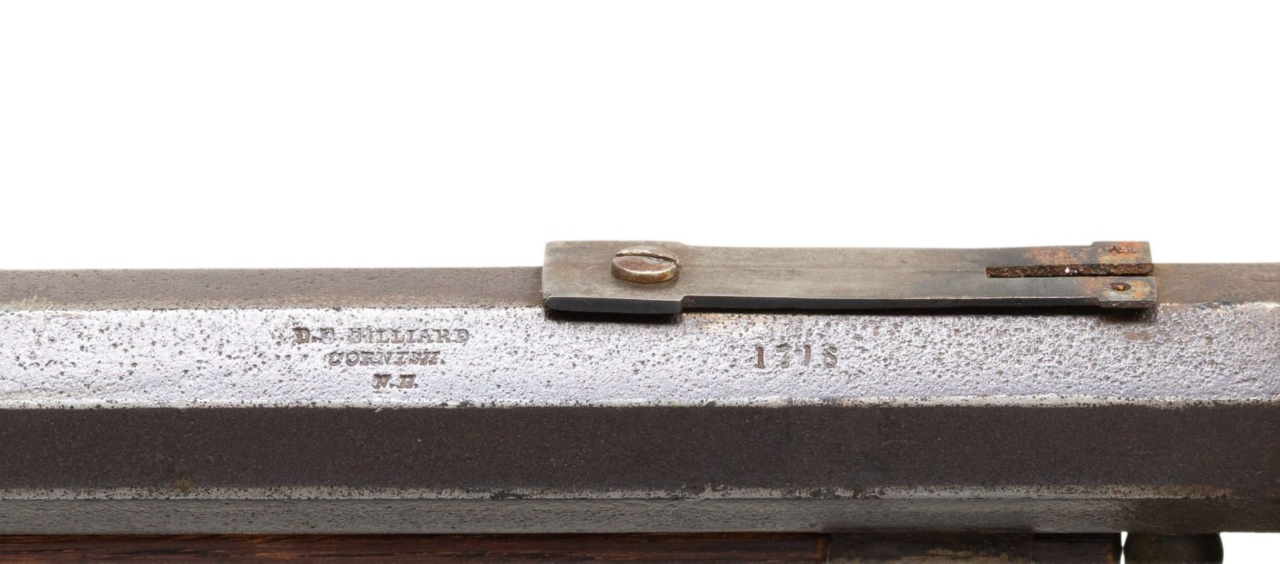 PERCUSSION RIFLE. CAL.38. S# 1716. Per "American Gunsmiths" by Frank Sellers, David Hall Hilliard (1805-1877) operated in Cornish, New Hampshire from 1842-1877 making underhammer guns. Smoothbore, oct. 20.75" bbl. w/ hardwood ramrod. Blade front sight & staff for rear sight; notch & elevator missing. Straight trigger. Walnut stock w/ brass furniture. German silver hare on cheekpiece. CONDITION: barrel has heavily pitted & patina'd appearance with marks. Good wood finish with light dings. Dark pitted bore. Action appears to function when cycled by hand. (01-28386/MD). ANTIQUE. $400-600.