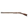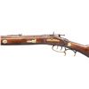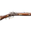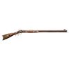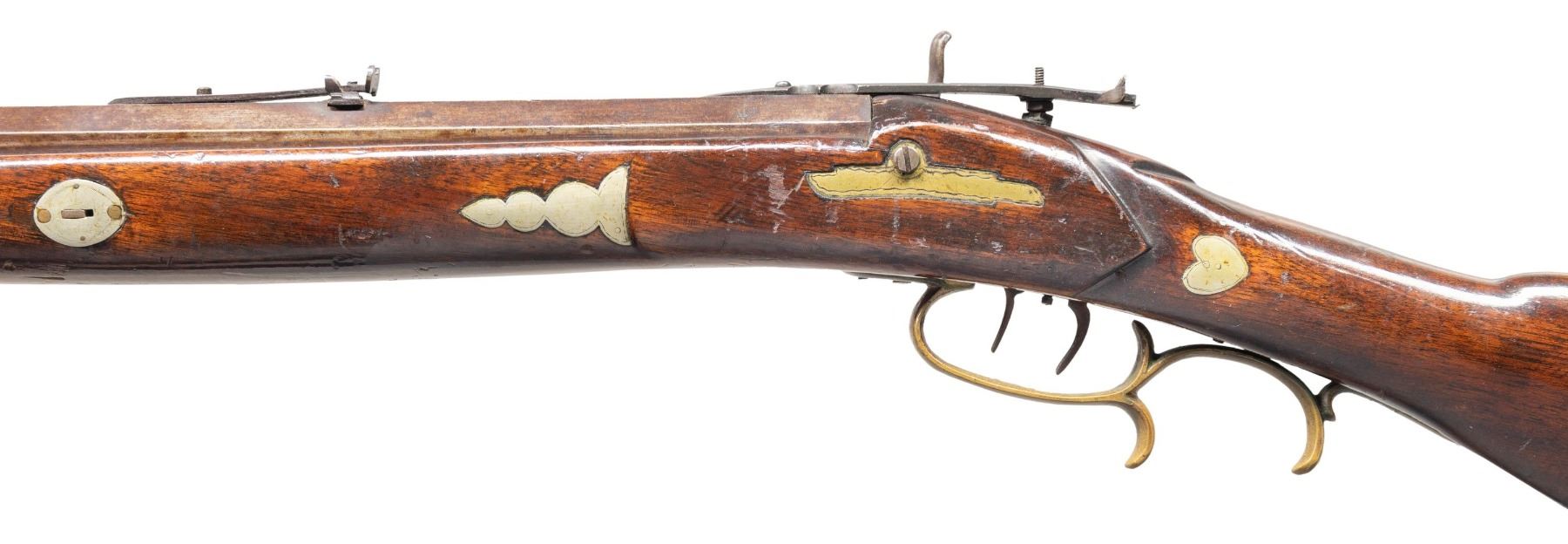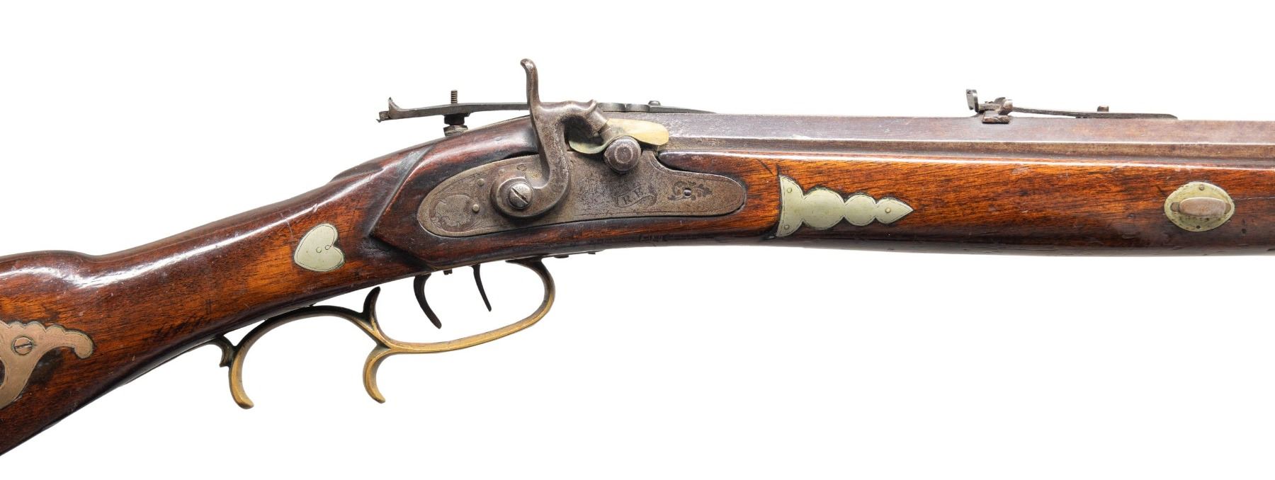 RIFLE. Cal. 38. NSN. Per "American Gunsmiths" by Frank Sellers, David Hudson operated in Napolean, Ohio 1875-1896. Oct. 35" barrel measuring 1.19" across flats. Modern globe front sight (missing post), semi buckhorn rear sight, & additional 5" long staff originally for tang sight welded into a large notch. Percussion lock has "R.B." in scroll & brass shield around nipple. Wedge fastened walnut half stock w/ hardwood ramrod & pewter nose cap. Brass furniture includes finger curl triggerguard, toeplate, crescent buttplate & pierced & segmented patchbox. German silver ornamentation includes wedge escutcheons, spear tips, hearts, half moons & sideplate. CONDITION: barrel & lock has brown patina appearance with pitting around nipple, marks & pinprick corrosion. Stock has heavy varnish with spots of peeling & numerous dings & marks. Good bore with strong rifling. Appears mechanically fine. PROVENANCE: The Esteemed Norm Greenberg Collection. (01-27749/MD). ANTIQUE. $700-1,100.