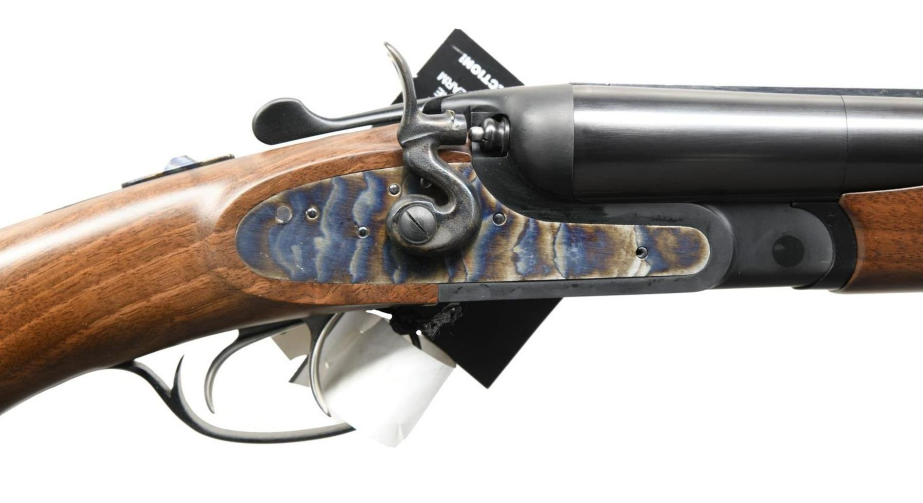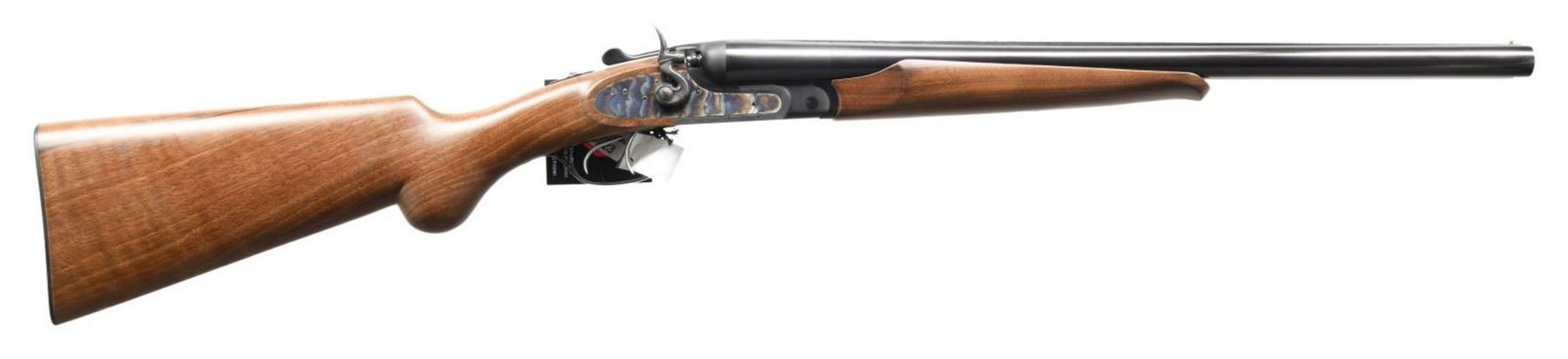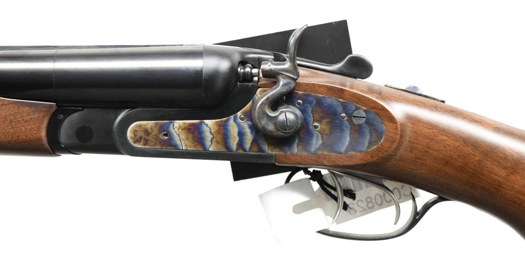 SXS SHOTGUN WITH MATCHING BOX. Cal. 12 GA, 2 3/4" & 3". S# SC000823. Bbl 20". Model 1878 Coach Gun SxS shotgun mfg. by Pietta in Italy, imported by KC LLC of Harrisburg, PA, and retailed by Davidson. Underside of bbl. exhibits markings stipulating Pietta's mfg. information, KC LLC's importer information, the S#, as well as the cal. designation. Black receiver, trigger guard, and buttplate, with case color hardened sideplates & hammers, and blued bbls. Smooth plain wood round knob buttstock and schnabel tip forend. UNATTACHED ACCESSORIES: matching box. CONDITION: near new, with metal components retaining the vast majority of their original factory finishes overall. Mirror bores. Wood furniture is excellent overall. Box exhibits some external wear, but otherwise remains sturdy and serviceable. PROVENANCE: The Collection of Gun Sport Ltd owned by Jon R. Thomas. (23-3746/MLW). MODERN. $400-600.