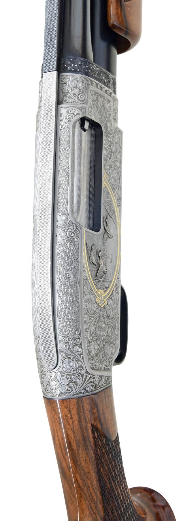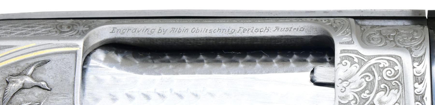 SUPERB ENGRAVING & PRECIOUS METAL INLAYS BY THE NOTED ALBIN OBILTSCHNIG. Cal. 12 Ga. 2-3/4". S# 1665325. This interesting custom gun probably gun dates to the 1960's given it's racy styling of grip. Built on a Winchester model 12 trap gun with 28" ventilated rib barrel choked full; action is finished in silver gray. Action is covered with truly attractive and wonderfully cut large open shaded acanthus scroll. Highlights and volutes have been polished bright for added depth. This fine work surrounds game scenes which are within flush gold band frames on sides of action. Major subjects are rendered in high relief silver. Foregrounds are relief engraved. Backgrounds are nicely shaded. A pointer points a pair of flushing pheasant on left side and a trio of ducks are settling into a marsh on right. Top of action is finely shaded in stippled skip line pattern. Signature: "Engraving by Albin Obultschnig Ferlach Austria" is above cartridge port on right side. Custom buttstock made of broadly marbled and stump figured European walnut measures 14-1/8" over RH Arnold pad on 3/8" walnut lengthening piece. Very nicely cut skip line checkering in fancy boarder is at grip. Rosewood grip cap is broad and teardrop shaped exhibiting early 60's styling. Matching full target type forend has long extension at rear. CONDITION: very fine as custom finished. Barrel retaining nearly all custom blue with some minor handling marks. Action shows some brightening of French gray on edges. There are few very minor marks in glossy stock finish. Bore is bright and shiny. Mechanically fine. (24-2225/MGM). CURIO. $6,000-9,000.