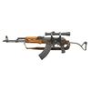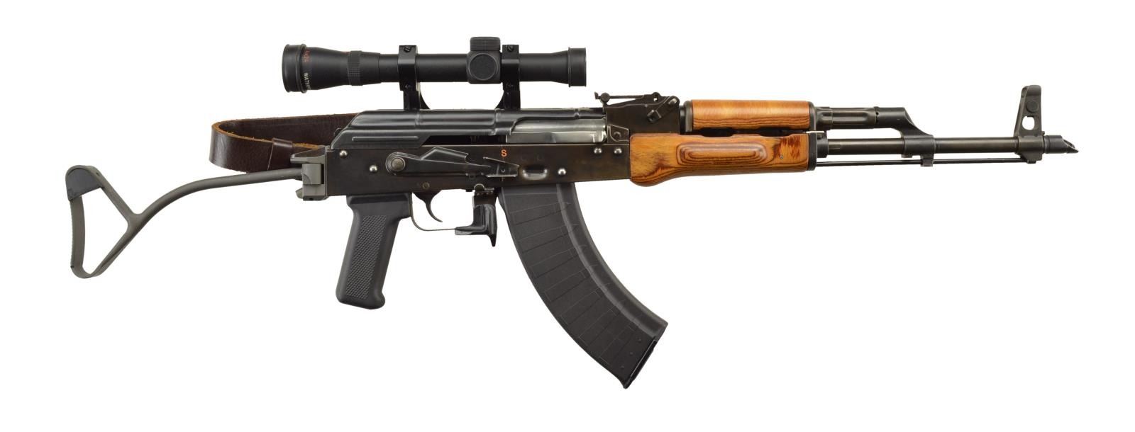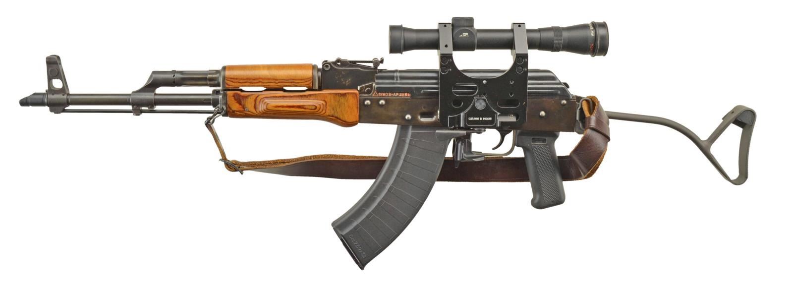 Cal. 7.62x39 S# 1980S-AF2858 Bbl.16: DC Industries NDS-3 receiver built in the style of the Romanian AK. Dark blued finish on exposed metal surfaces. Gray parkerized, right side folding shoulder stock w/ rubber buffer to prevent marring receiver finish and making unexpected noise. Beautiful laminated wood, very similar to the better Egyptian Maadi rifles. Plastic mag release extender. Threaded barrel, left-hand, with Chinese style slanted muzzle brake. On-board cleaning rod, secured through bayonet lug, into forearm. Protected post front sight w/ rear tangent sight, marked to 1000m & includes normal Romanian setting "P" which is loosely translated to their CQB or "BATTLE" setting. Left-side, receiver mounted scope base, currently sporting Russian QD mount and 4x24 scope made in Belarus. MAGS: 1 plastic 30rd. CONDITION: Finish on exposed metal surfaces is complete and consistent w/ very little sign of actual use. Laminated wood is beautiful, free of any noticeable blemishing, as is plastic pistol grip. Scope glass is clear with tight reticles. Stock locks tightly. Bright bore w/ sharp rifling. Fire control mechanism appears to function correctly when cycled by hand. (22-2331/JZ). MODERN. $600 - 1,000
