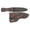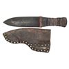 KNIFE & TACKED SHEATH. 12" overall, 7" double edged wide dagger blade, full tang, cord wrapped handle, folded tacked & slotted harness leather sheath. CONDITION: good overall, pitted blade, sheath scuffed and one break at slot. (02-25227/JS). NON-GUN. $400-600.