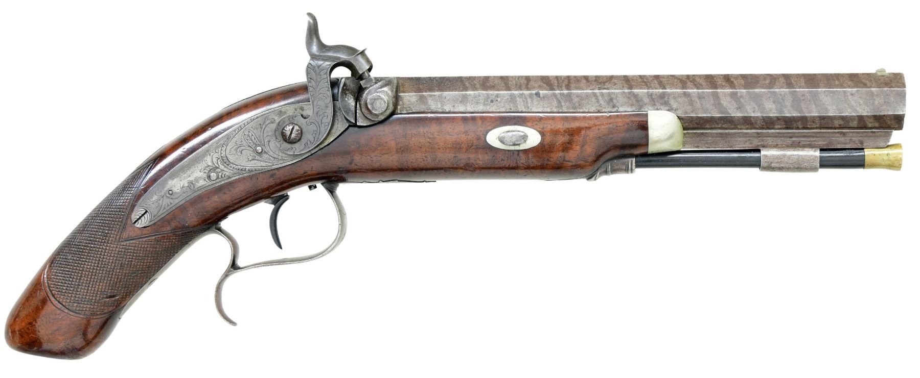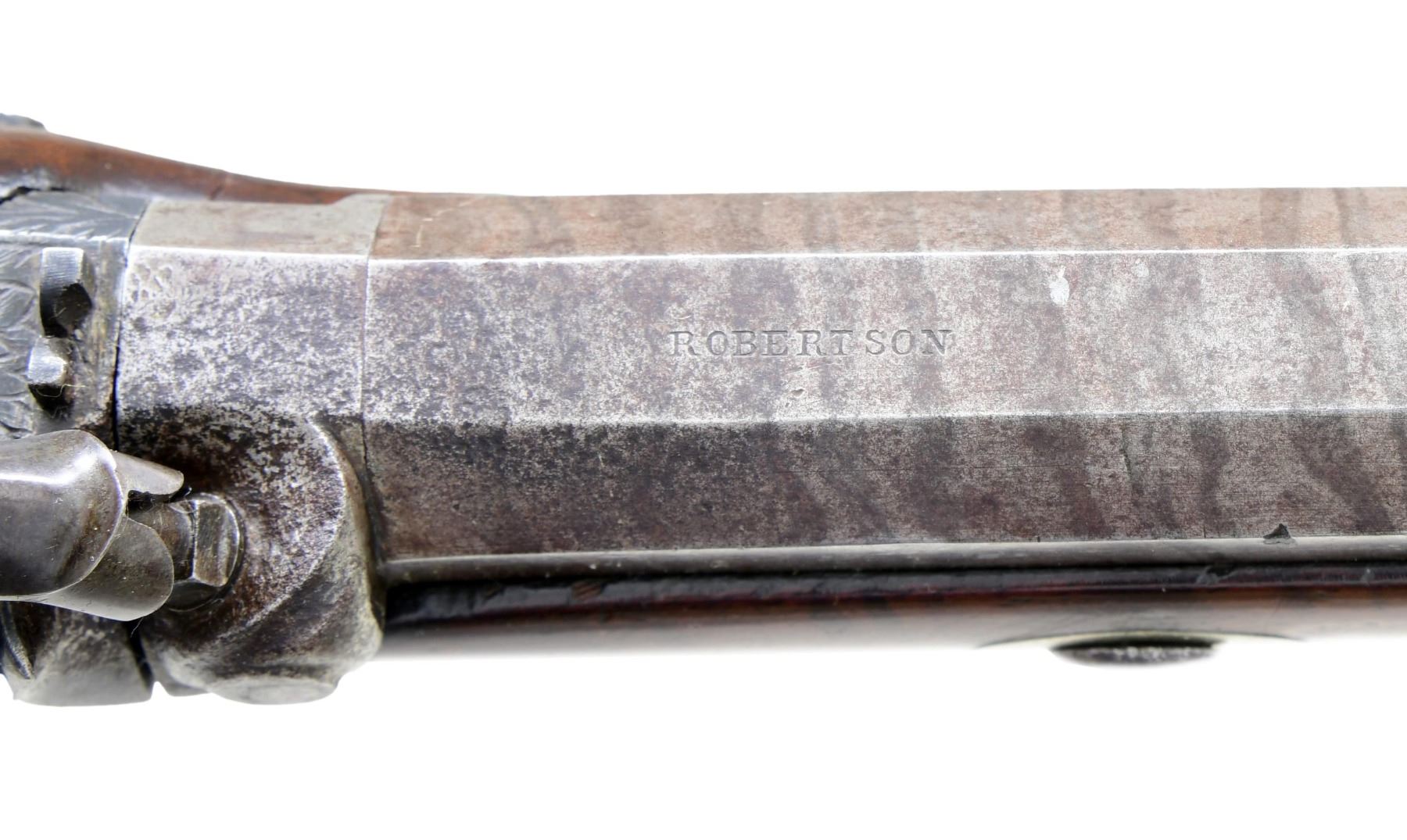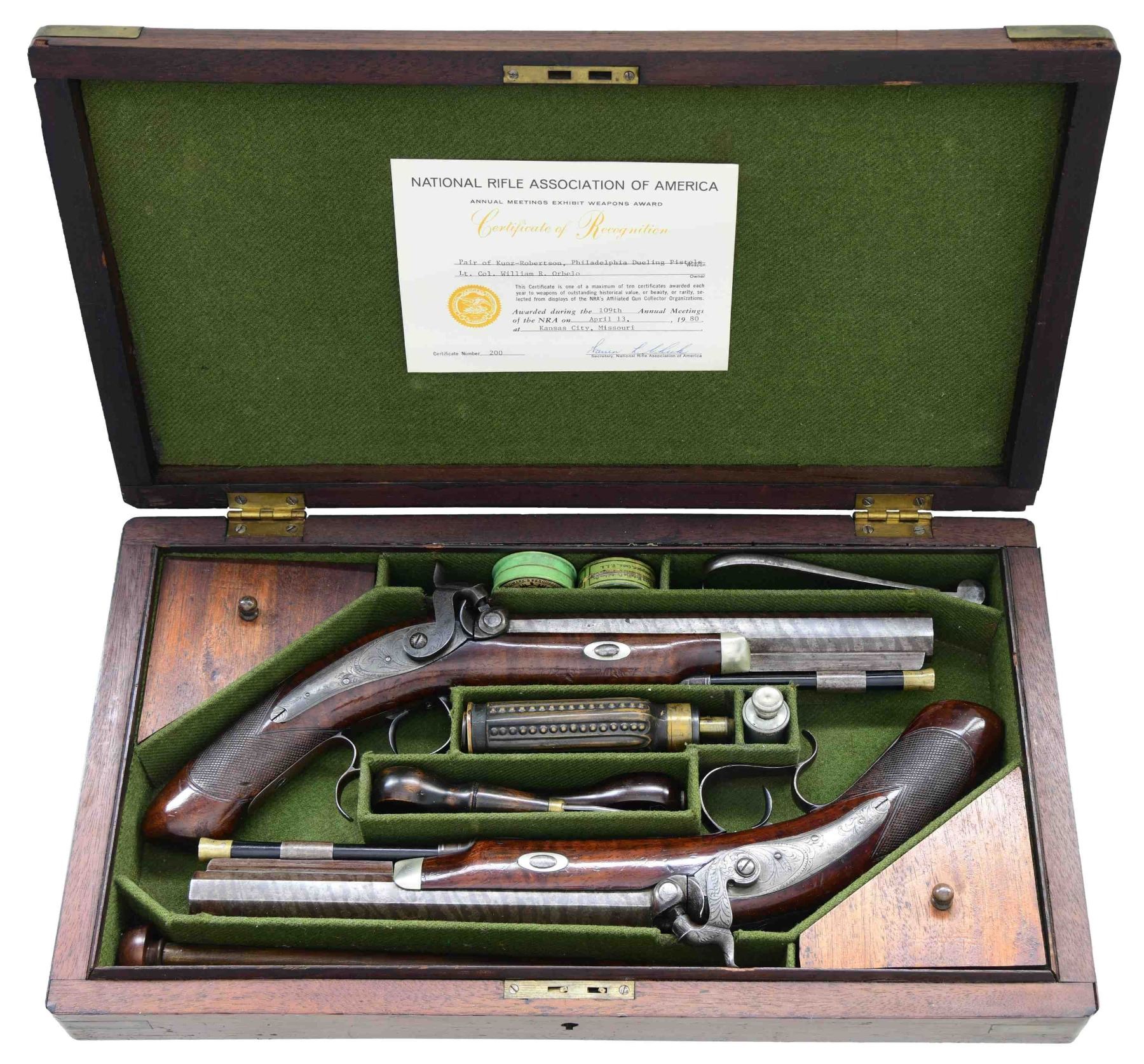 SMOOTHBORE PERCUSSION DUELING PISTOLS BY KUNZ-ROBERTSON, FORMER WILLIAM R. ORBELO COLLECTION. Cal. 52. NSN. Bbl. 8 1/8". Delightful pair of smoothbore percussion dueling pistols produced by William Robertson of Philadelphia, PA, during the mid-19th century. Robertson, a well-known Philadelphia gunsmith and maker of dueling pistols, was active from approximately 1829-1861 and had various shop addresses throughout the city, with his final address being listed at 131 Walnut Street in 1859. The pistols are both marked "ROBERTSON" over the top flat of the faceted Damascus bbls. at the breech. Back action lockplates and dolphin-form hammers exhibit finely executed floral-style engraving, which is also present on the bbl. tangs. Trigger guards are engraved with a floral motif and terminate in a pineapple finial. Wood half-stocks feature narrow pointed checkered wrists with flat butts and exhibit rectangular German silver inlays on the rear of the wrists, as well as German silver bbl. wedge escutcheons and nosecaps. Brass-tipped ebony ramrods feed through a single iron thimble on a half-length rib. Dovetailed German silver blade front sights with deep iron V-notch rear sights. UNATTACHED ACCESSORIES: fitted hardwood case featuring a green fabric lining and containing a key, 3 percussion cap tins, 1 ball mold, 1 brass powder flask, 1 oiler, 1 screwdriver, 1 nipple wrench, as well as a cleaning rod. Interior of lid retains an NRA annual meetings exhibit weapons award Certificate of Recognition (Certificate #200) that was awarded at the 190th Annual Meetings of the NRA on April 13th of 1980 at Kansas City, MO, that is marked "Pair of Kunz-Robertson, Philadelphia Dueling Pistols/ Lt. Col. William R. Orbelo". CONDITION: iron components, including the lockplates, hammers, bolsters, trigger guards, and thimbles, exhibit a pleasing gray patina overall, with traces of original bluing present on the bbl. tangs. Bbls. retain their distinct Damascus twist patterns, while the balance exhibits an aged gray patina, with some areas showing a pleasing brown patina and scattered spots of appropriate age-related discoloration. Both actions hold cock, half cock, and function appropriately when cycled by hand. Stocks exhibit some scattered marks from handling and storage, with some small impressions present overall. One pistol exhibits a crack stemming from the breech plug / bbl. tang, but otherwise appears to remain sturdy and serviceable. Case exhibits several notable cracks on the lid, with scattered losses to the exterior layer via age-related delamination overall. Brass components exhibit a pleasing mellow brown patina, with the original lid escutcheon being absent. An exceptionally attractive cased pair of both rare and desirable American-made dueling pistols by Kunz-Robertson that were formerly of the collection of Lt. Col. William R. Orbelo. (01-24818/MLW). ANTIQUE. $6,000-9,000.