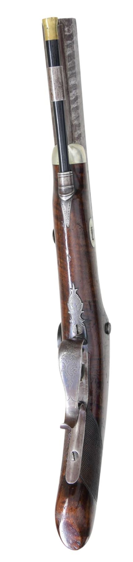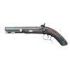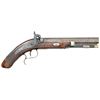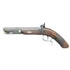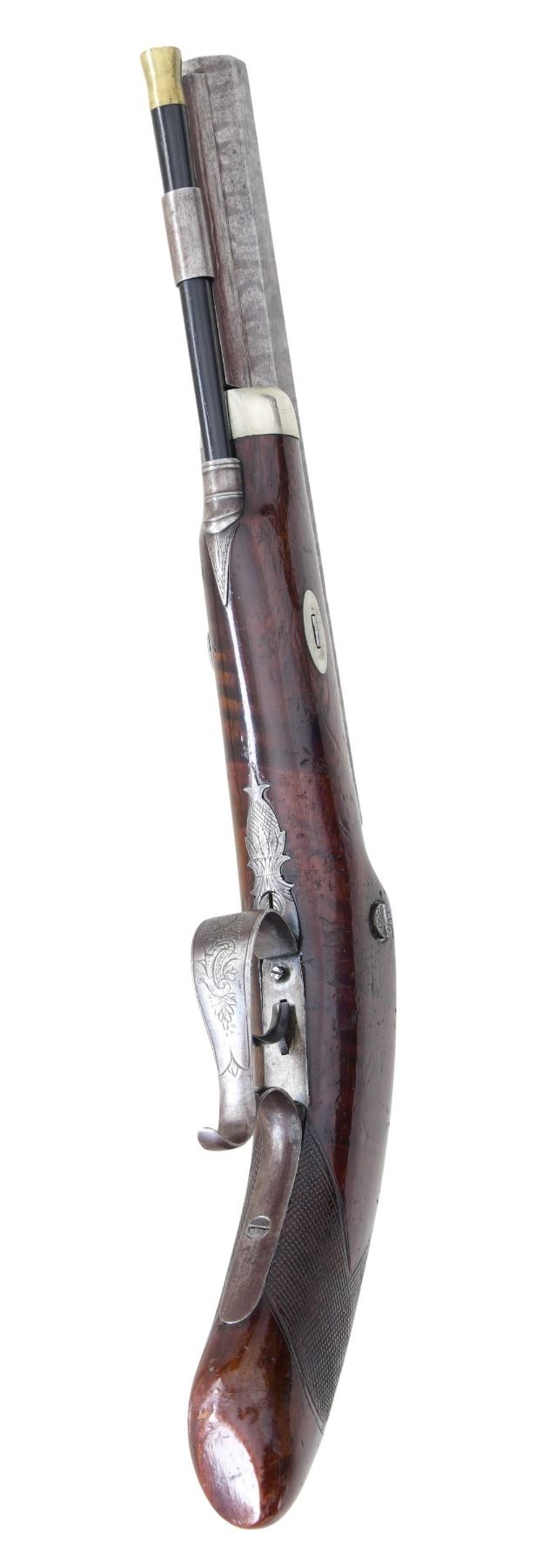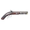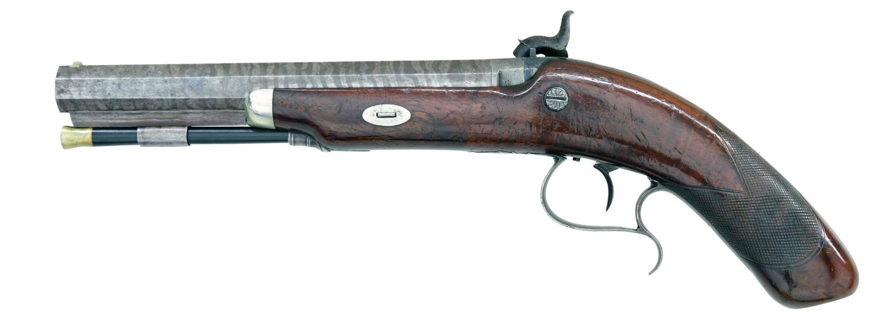 SMOOTHBORE PERCUSSION DUELING PISTOLS BY KUNZ-ROBERTSON, FORMER WILLIAM R. ORBELO COLLECTION. Cal. 52. NSN. Bbl. 8 1/8". Delightful pair of smoothbore percussion dueling pistols produced by William Robertson of Philadelphia, PA, during the mid-19th century. Robertson, a well-known Philadelphia gunsmith and maker of dueling pistols, was active from approximately 1829-1861 and had various shop addresses throughout the city, with his final address being listed at 131 Walnut Street in 1859. The pistols are both marked "ROBERTSON" over the top flat of the faceted Damascus bbls. at the breech. Back action lockplates and dolphin-form hammers exhibit finely executed floral-style engraving, which is also present on the bbl. tangs. Trigger guards are engraved with a floral motif and terminate in a pineapple finial. Wood half-stocks feature narrow pointed checkered wrists with flat butts and exhibit rectangular German silver inlays on the rear of the wrists, as well as German silver bbl. wedge escutcheons and nosecaps. Brass-tipped ebony ramrods feed through a single iron thimble on a half-length rib. Dovetailed German silver blade front sights with deep iron V-notch rear sights. UNATTACHED ACCESSORIES: fitted hardwood case featuring a green fabric lining and containing a key, 3 percussion cap tins, 1 ball mold, 1 brass powder flask, 1 oiler, 1 screwdriver, 1 nipple wrench, as well as a cleaning rod. Interior of lid retains an NRA annual meetings exhibit weapons award Certificate of Recognition (Certificate #200) that was awarded at the 190th Annual Meetings of the NRA on April 13th of 1980 at Kansas City, MO, that is marked "Pair of Kunz-Robertson, Philadelphia Dueling Pistols/ Lt. Col. William R. Orbelo". CONDITION: iron components, including the lockplates, hammers, bolsters, trigger guards, and thimbles, exhibit a pleasing gray patina overall, with traces of original bluing present on the bbl. tangs. Bbls. retain their distinct Damascus twist patterns, while the balance exhibits an aged gray patina, with some areas showing a pleasing brown patina and scattered spots of appropriate age-related discoloration. Both actions hold cock, half cock, and function appropriately when cycled by hand. Stocks exhibit some scattered marks from handling and storage, with some small impressions present overall. One pistol exhibits a crack stemming from the breech plug / bbl. tang, but otherwise appears to remain sturdy and serviceable. Case exhibits several notable cracks on the lid, with scattered losses to the exterior layer via age-related delamination overall. Brass components exhibit a pleasing mellow brown patina, with the original lid escutcheon being absent. An exceptionally attractive cased pair of both rare and desirable American-made dueling pistols by Kunz-Robertson that were formerly of the collection of Lt. Col. William R. Orbelo. (01-24818/MLW). ANTIQUE. $6,000-9,000.