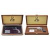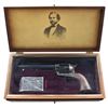 CENTENNIAL REVOLVERS, WITH CASES. 1) COLT SINGLE ACTION ARMY "PEACEMAKER" REVOLVER. Cal. 45. S# PC1712. Bbl. 7 1/2". Single Action Army "Peacemaker" revolver mfg. by Colt, commemorating 100 years of the iconic Single Action Army revolver. The left side of the bbl. is marked "1873 PEACEMAKER CENTENNIAL 1973", with Colt's single line address marked across the top. Left side of the frame is marked with Colt's patent information, followed by "U.S.". Black powder frame, hammer, and loading gate exhibit a case color hardened finish, with remaining metal components exhibiting a blue finish overall. Frame is mounted with a 1-piece smooth wood grip, which is marked with a boxed cartouche on the left side. Standard SAA pattern blade front sight, with frame notched rear sight. All serialized parts are matching and include the frame, loading gate, trigger guard, rear grip strap, as well as the cyl. UNATTACHED ACCESSORIES: original commemorative wood display case, featuring a maroon felt interior and a commemorative plaque. CONDITION: near new, with metal components retaining bountiful amounts of their original factory finishes, exhibiting a few light superficial handling marks, with a very small spot of light pitting present on the bbl. at either side of the muzzle. Brilliant mirror bore, exhibiting well defined rifling throughout. Grip is excellent, with an area of smoothing present on the bottom of the grip edge on the left side. Case shows a few superficial marks from handling and storage, but is otherwise very good overall. Felt lining exhibits a small loss towards the muzzle. (25-1221/MLW). CURIO. 2) COLT SINGLE ACTION FRONTIER SIX SHOOTER REVOLVER. Cal. 44-40. S# 1712PC. Bbl. 7 1/2". Single Action Army "Frontier Six Shooter" revolver mfg. by Colt, commemorating the 100th anniversary of the iconic Single Action Army revolver. The left side of the bbl. is marked "COLT FRONTIER SIX SHOOTER" within an oval panel, with Colt's single line address marked across the top. Left side of the frame is marked with Colt's patent information, with ".44 C.F." marked on the left side of the trigger guard. Metal components exhibit a lustrous nickel plated finish overall. Frame is mounted with 2-piece Colt checkered black synthetic grips. Standard SAA pattern blade front sight, with frame notched rear sight. All serialized parts are matching and include the frame, loading gate, trigger guard, rear grip strap, as well as the cyl. Grips are matching via "1712", which is inscribed on the interior of the panels. UNATTACHED ACCESSORIES: original commemorative brown leather case, featuring a brown felt interior, with a commemorative plaque. CONDITION: near new, with metal components retaining bountiful amounts of their original factory nickel plated finish, exhibiting a few superficial marks from handling and storage. Cyl. bears a couple of light drag lines. Brilliant mirror bore, exhibiting well defined rifling throughout. Grips are very good, showing a few light superficial handling marks. Case shows some light exterior wear, as well as some light staining, but otherwise is very good overall. An especially attractive pair of Colt's centennial Single Action Army revolvers. (25-1531/MLW). CURIO. $2,000-3,000.
