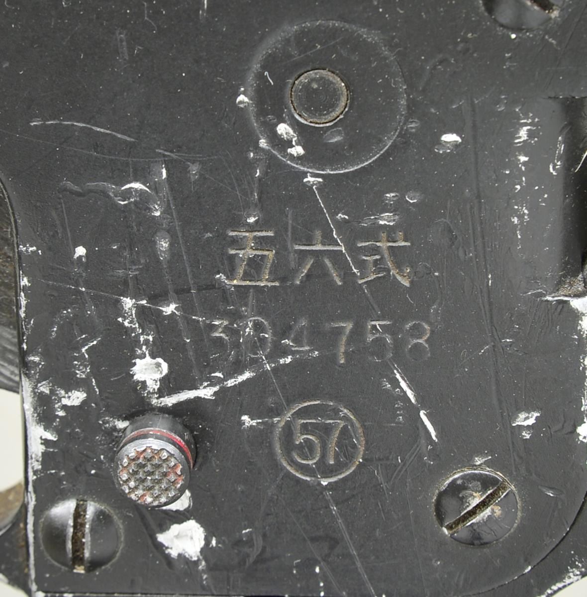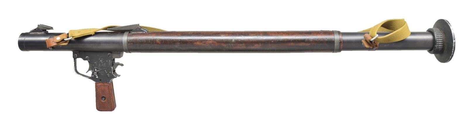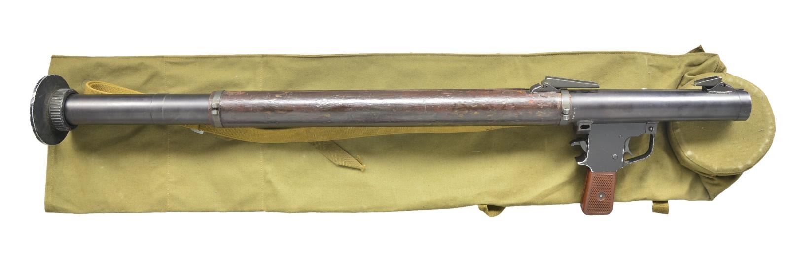 Overall length: 38 1/4" black finished tube. Fire control group has Chinese characters over S# "304758" / circle "57". Tube matching numbered "4758". Bakelite grip panels. A 19" wooden sleeve covers middle section of tube held by 2 steel bands. Folding 1 3/4" front sight & 3 1/4" rear sight. Khaki web sling hold by leather sling attachments. Fire control group is covered by canvas sling having Chinese characters on inside flap along w/ front tube cover. Also included is a canvas scabbard covering tube. CONDITION: good overall appearance w/ wear & moderate handling marks. Fire control mechanism appears to function. (02-16275-1/MD). $200-400.