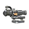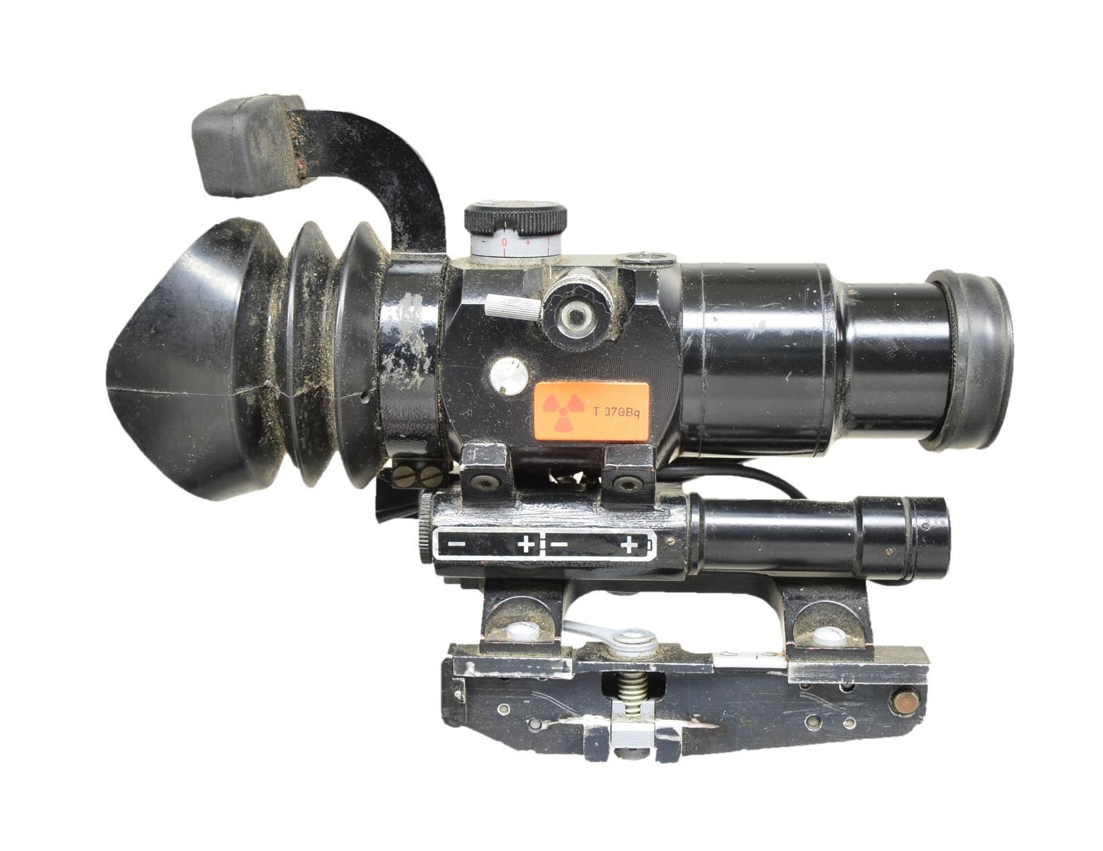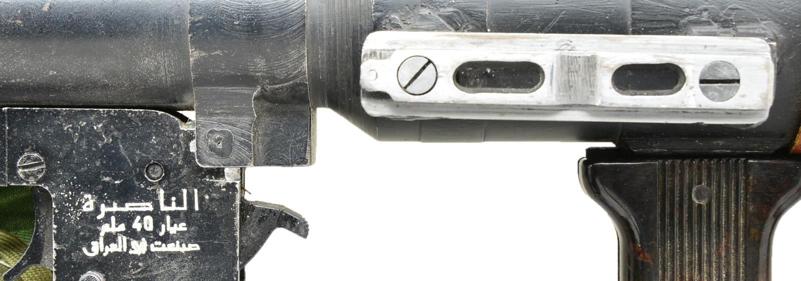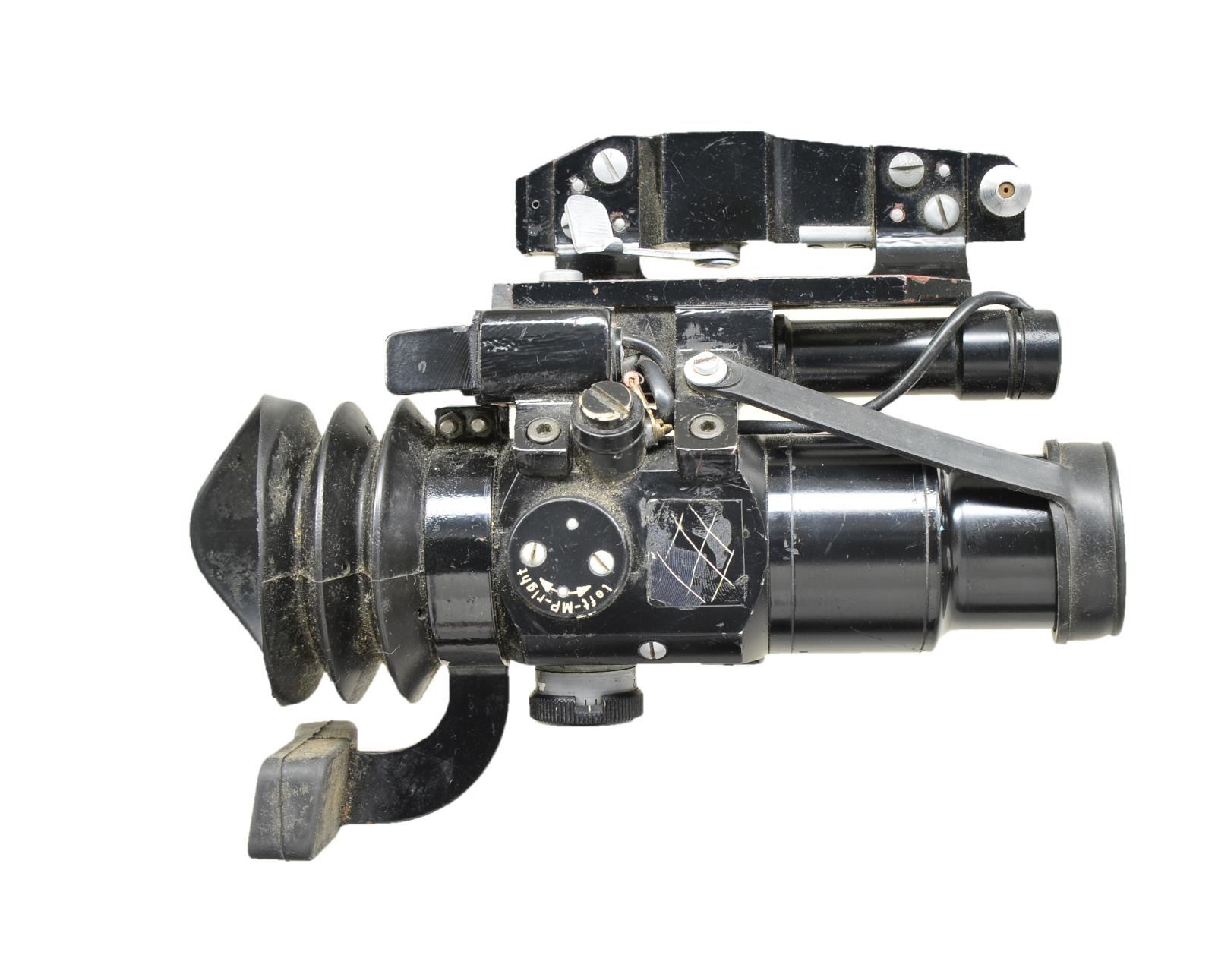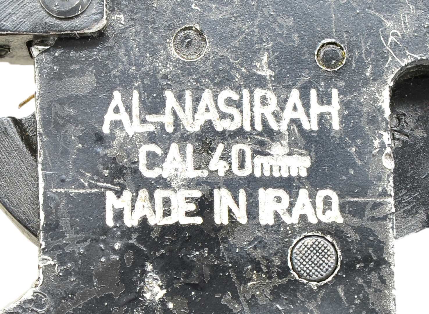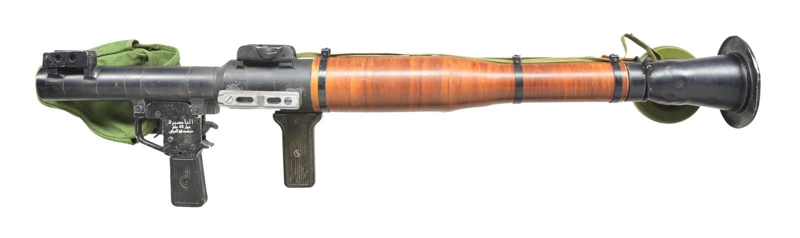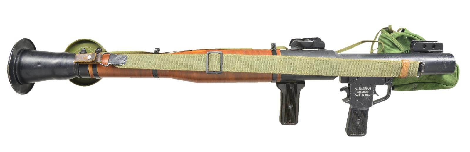 Cal. 40mm. Overall length: 37 1/2" w/ black painted finish & flared end to steel tube. 15 5/8" Length wood sleeve protects the user w/ 3 metal bands fastened to tube. Flip up adj. front & rear sight. Left side of tube has welded on rail for sight. 2 Synthetic grips. Fire control group marked on right side "AL-NASIRAH / CAL. 40MM / MADE IN IRAQ" & sideplate written in Arabic. Khaki green sling on sling swivels along w/ green canvas cover for fire control group & green plastic muzzle covers. UNATTACHED ACCESSORIES: rail mounted scope w/ forehead rest, eye cup & range finding reticle. Black finish exterior w/ orange label having "T 37GBq". Canvas carrying case for sight. Good overall exterior finish w/ top half of lens broken. CONDITION: good overall appearance w/ light oxidation, pitting & handling marks throughout. (02-16275-2/MD). $500-750.