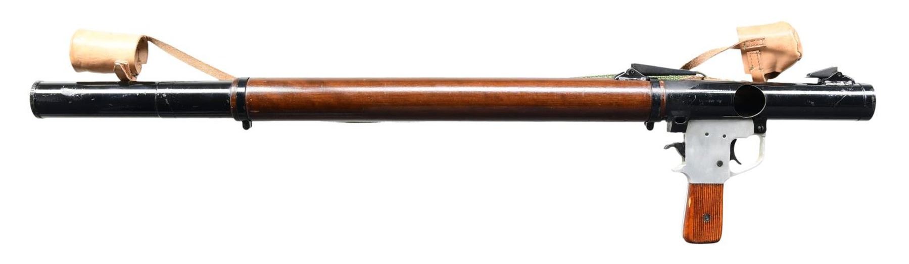 Cal.40mm. S# 3419. Overall length 37.75". The original weapons resembling what we know today as an RPG, started at the end of WWII. At that time, “RPG” stood for Ruchnoi Protivotankoviyi Granatomyot – Hand Antitank Grenade Launcher with a clear lineiage w/ the German Panzerschreck rocket launcher and the Panzerfaust. This first Russian evolution, the RPG 1, utilized the simple launch tube of the Panzerfaust’s and employed a black powder propelling charge that w/ a very low muzzle velocity. It was never manufactured in high numbers. The first variation to see a large production effort was the RPG 2 which was introduced in the late 1940s to early 1950s. It utilized the same straight tube recoilless launch system, resembling the Panzerfaust 150 & was similar in performance to other systems of the time, such as the US "Bazooka" and the British "PIAT". The RPG-2 was heavily used in & around the Viet Nam war. It was an important evolution in the constant balance between the capability of available armor, and systems designed to defeat it. Simple pop up sights. Rounded wood hand guards. Soviet markings on the trigger housing include arrow in circle arsenal & “56-r-660 / NoM 3419”. This is an actual RPG-2 that has been de milled to ATF specs. A hole has been bored in the tube in front of the trigger housing & a steel bar welded inside the tube, obstructing it, just rear of the hole. UNATTACHED ACCESSORIES: Black nylon TacForce case. CONDITION: exposed metal surfaces painted black. Aluminum trigger housing retains original finish & original bakelite grips. PROVENANCE: From the Working Reference Collection of Military Arms Instructor, Master Sergeant Vincent Pestilli. (02-21773/JZ). NON-GUN. $400-800.