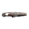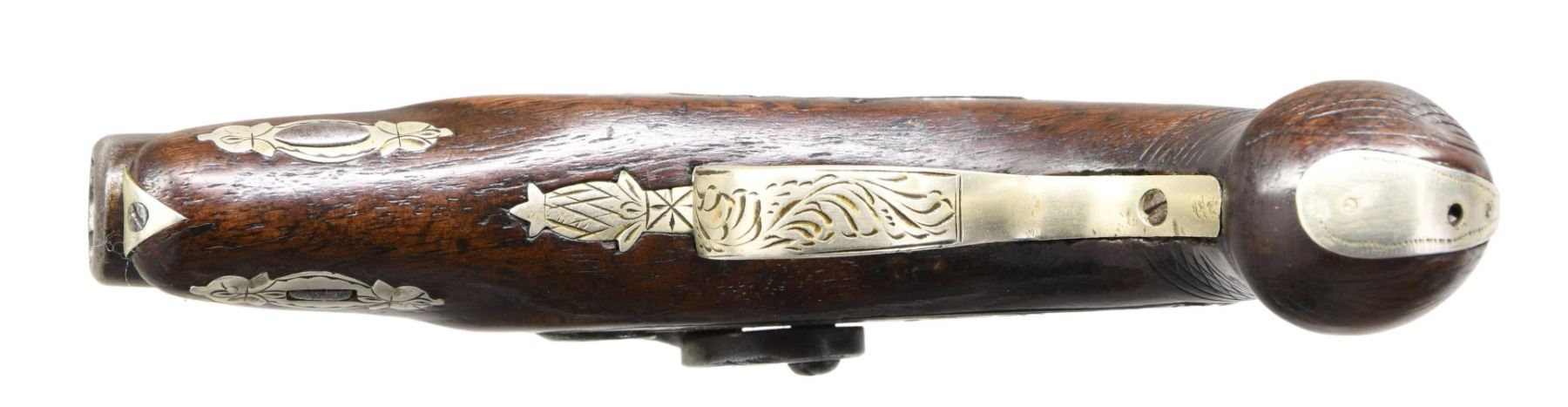 Cal. 44. NSN. Bbl. 2 1/2" w/ German silver sight having 2 inlaid bands at muzzle. Back action engraved lock & hammer. Breech end of bbl. & lock are marked "Deringer / Philadelphia". Wedge fastened round butt walnut stock w/ checkered wrist. German silver fittings have matching engraving. CONDITION: metal finish has faded to gray. Stock shows moderate wear w/ handling marks. Sound lock. Lightly pitted bore retains intact rifling. PROVENANCE: From the Collection of a Tennessee Gentleman. (01-25705/DS). ANTIQUE. $1,000-1,500.
