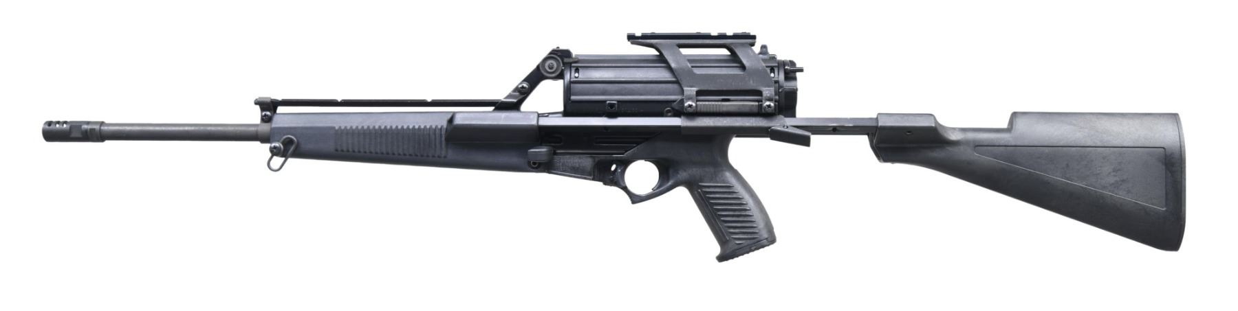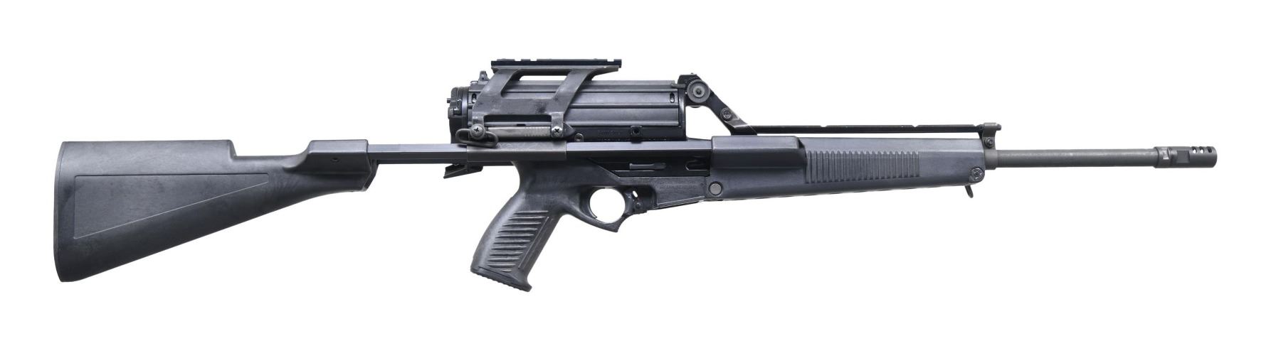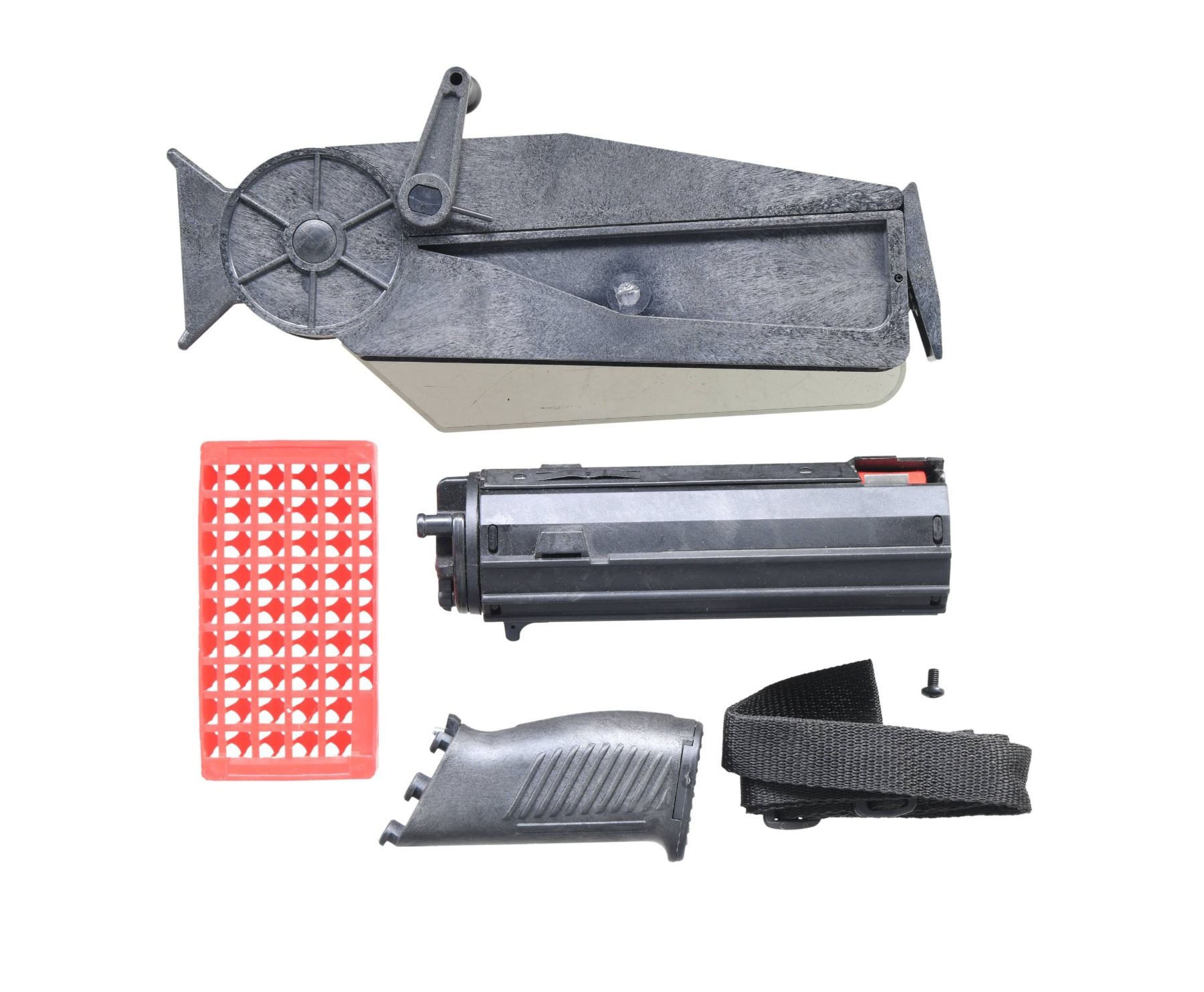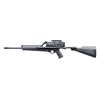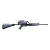 Cal. 9mm Luger. S# T000369. Mfg. in Bakersfield, CA 1995-2001. Chrome-Moly 16" bbl. w/ muzzle brake. Matte black finished frame has added accessory rail mounted to barrel, added accessory rail that mounts over magazine & white dot front sight; corresponding ghost ring rear sight on magazine. Roller delayed blowback action w/ bottom ejection port. Black polymer handguard w/ sling swivel & retractable fixed buttstock. MAGS: 2 Helical 50 rd. mag. UNATTACHED ACCESSORIES: magazine loader, 9mm cartridge block, additional pistol grip, black nylon sling & Calico paperwork. CONDITION: rifle has very good overall original finish showing scattered light handling wear. Very good bore. Appears to function correctly when cycled by hand. (25-2281/MD). MODERN. $300-500.