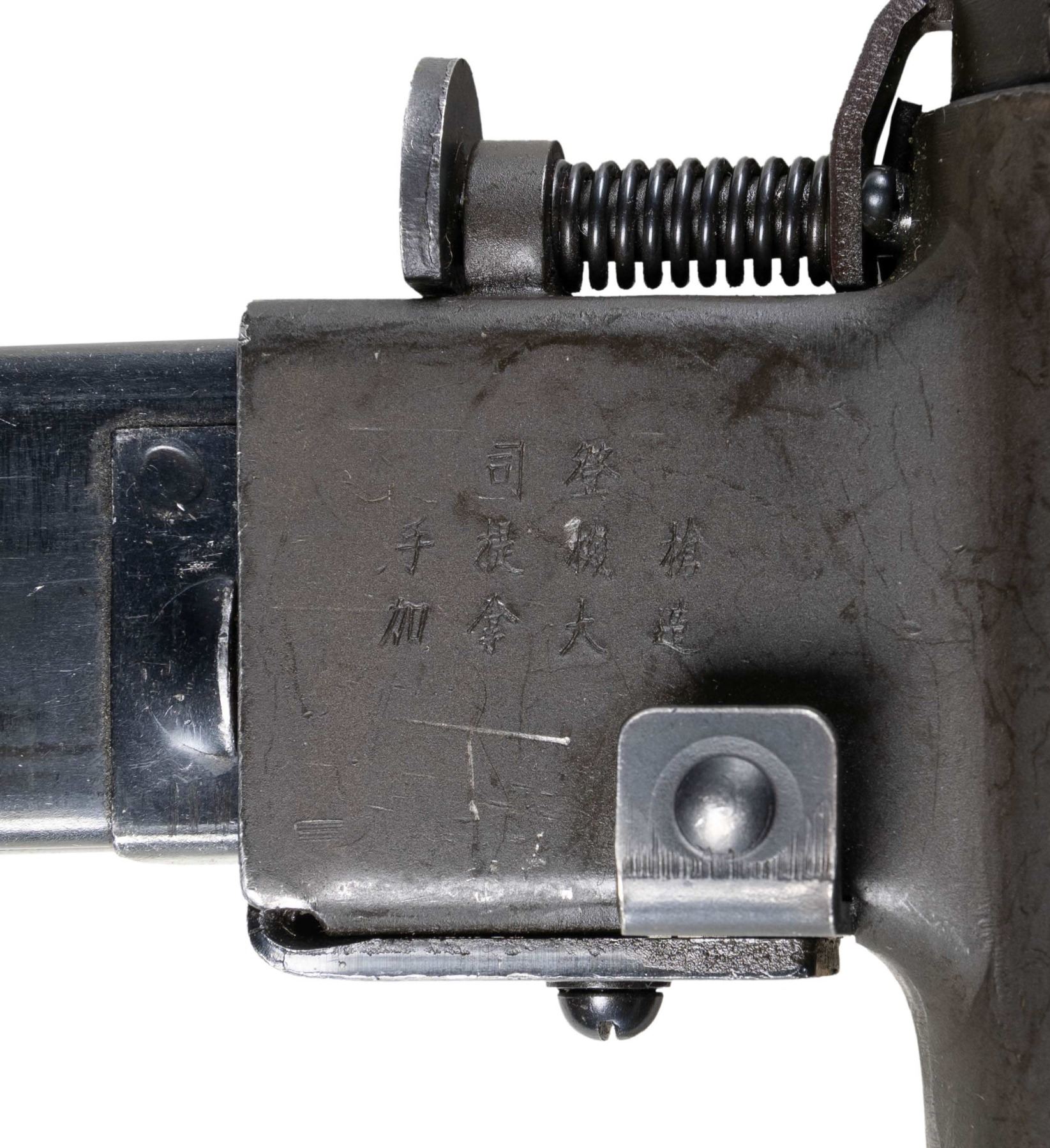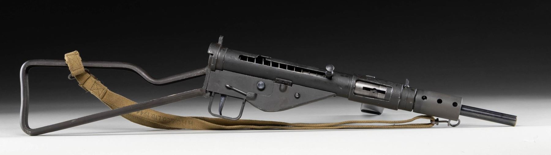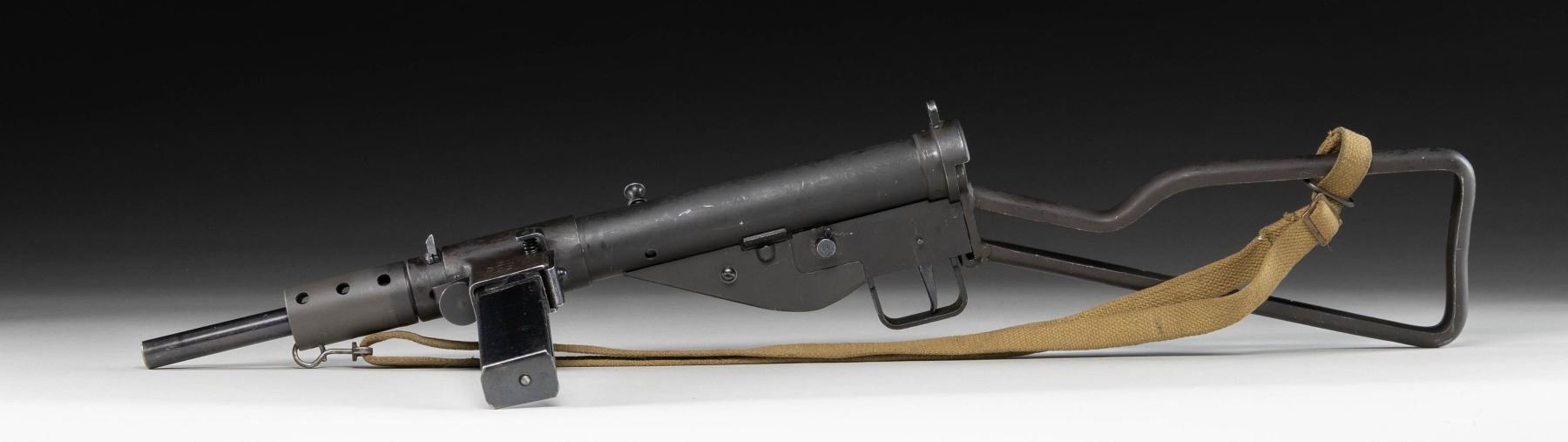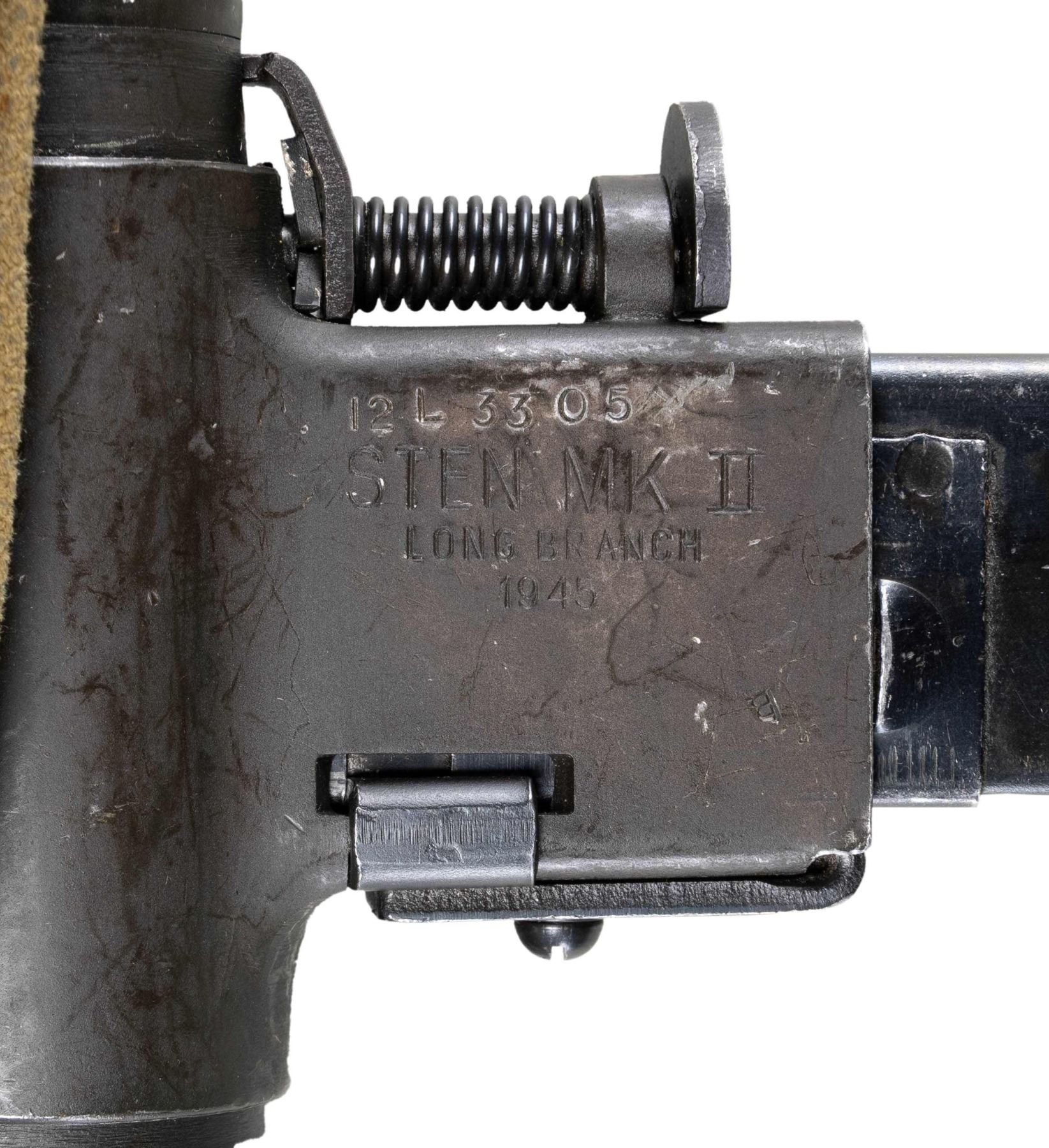 CONTRACT STEN MK II SUBMACHINE GUN. Cal. 9mm (9x19mm Parabellum). S# 12 L 3305. Bbl. 8". 1 of only approx. 73,000 Sten Mk II submachine guns mfg. in Canada at the Long Branch arsenal for the Chinese Nationalist military. The top of the mag. well exhibits 3-lines of Chinese characters, appearing to denote the model and country of origin. Underside of the mag. well is stamped with the S# above "STEN MK II/ LONG BRANCH/ 1945". Left side of the trigger housing is stamped with what appears to be a "CA/ 90" within an oval proof. Metal components exhibit what appears to be their original dark parkerized finish, with the bbl. and some small parts being blued. Forward 3/4 of the bbl. nut exhibits a notably lighter parkerized finish and appears to be have refinished at one time. Bolt is polished in-the-white, exhibiting an electro-penciled encircled broad arrow proof on the left side. Bbl. nut and rear of stamped steel stock are mounted with a 1944 dated khaki web sling. MAGS: 1 blued 32-rd. mag. CONDITION: metal components retain the majority of their apparent original arsenal parkerized finish, exhibiting some light to mild edge wear, as well as scattered superficial handling marks and scratches overall. Bbl. exhibits some spots of pitting beneath the finish. Near mirror bore, exhibiting scattered spots and a few streaks of light pitting, while retaining well defined rifling throughout. Sling shows age related discoloration and some wear, but otherwise remains sound. THIS IS A NATIONAL FIREARMS ACT ITEM REQUIRING BATF TRANSFER BEFORE TAKING POSSESSION. CURIO & RELIC / FULLY TRANSFERABLE. (03-1918/MLW). CURIO / CLASS III. $8,500-12,500.