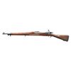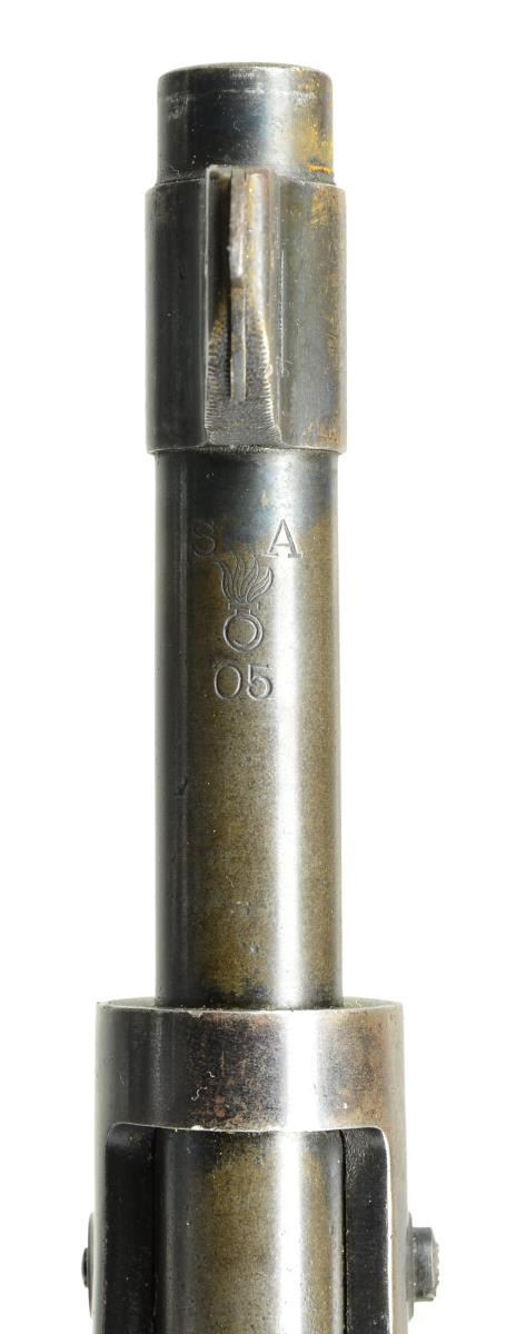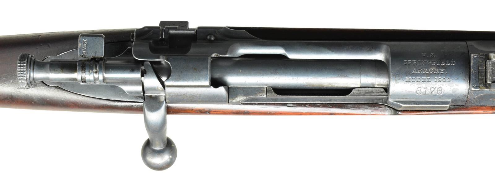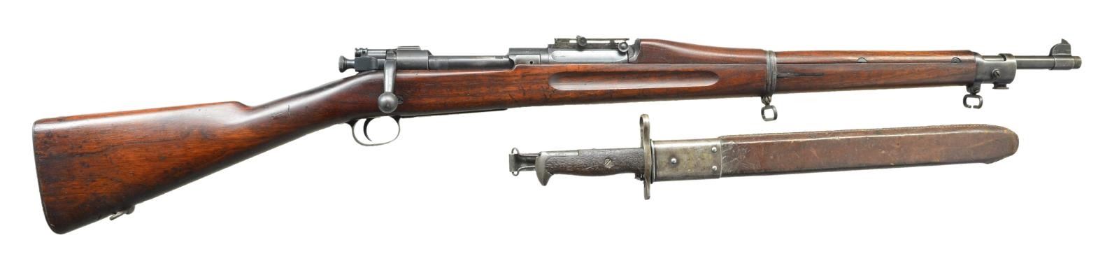 SPRINGFIELD BOLT ACTION MILITARY RIFLE W/ 4-DIGIT SERIAL NUMBER. Cal. 30-06. S# 6176. Bbl. 23-7/8" marked behind front sight “SA” “flaming bomb” & “05”. Ladder rear sight graduated to 2850 yards w/ volley notch. Dished elevation knob & sm. dished windage knob. Blade front sight w/ replacement pin. This scarce early Springfield rifle was mfg. in 1903 & would have been completed as a “rod bayonet” model. When production of the rod bayonet pattern was ended in 1905, a majority of the rifles were arsenal converted to the 1905 model taking a newly developed knife bayonet. The 1905 rifles were produced for a very short time in the original 30-03 cal.; but with the adoption of the model 1906 (30-06) cartridge loaded with a lighter pointed bullet, the vast majority of the 1905 rifles were then converted to the 30-06 cal. which was the case w/ this rifle. This rifle (in spite of the arsenal conversion) is a very scarce & desirable example of an early 1903 Springfield. Bolt handle is marked underneath w/ “E”. Safety & cutoff markings have serifs. Cocking piece is later replacement. Bolt sleeve lock spring & ejector spring are not present. Walnut stock set. “S” type buttstock w/ grasping grooves is marked at forend tip “S” indicating mfg. at Springfield Armory. Cutoff recess is marked “E”. The high wood stock does not have inspection or proof marks, & has only the tiny “50” assembly mark under grip. Handguard has sighting groove & made w/ 2 clips. All milled furniture including smooth trap buttplate. UNATTACHED ACCESSORIES: nickel plated oiler in butt. 15-7/8” fullered blade Model 1905 bayonet. Bayonet is marked on left Ricasso “SA” “flaming bomb” & “1906”. Marked on right Ricasso “US” & “S# 31474”. Correct corrugated black walnut grips. Birds head pommel. Unmodified Model 1905 leather scabbard w/ Krag-type belt hanger. Scabbard is marked on back “R.I.A. 1906” & “W.K.” Bayonet has lightly worn blade w/ scattered spots of oxidation & very fine pitting notable in tip area. Blue finish is visible on Ricasso. Balance of metal retains traces of blue turning gray & patina. Grips have moderate wear & handling marks. Leather scabbard has wear, light scuffing & handling marks throughout. Tip has notable loose stitching. Metal throat & belt hanger have traces of original blue turning gray & patina w/ scattered areas of very fine pitting. CONDITION: original finish stock set has moderate wear and handling marks with several notable dents at the top of the grip area. Metal retains approx. 60% of its original blue finish, with thinning, flaking and scattered spots of very fine oxidation. Bore is shiny but the lands show a great deal of wear. (22-4166/RW). CURIO. $2,000-3,000.