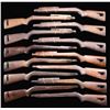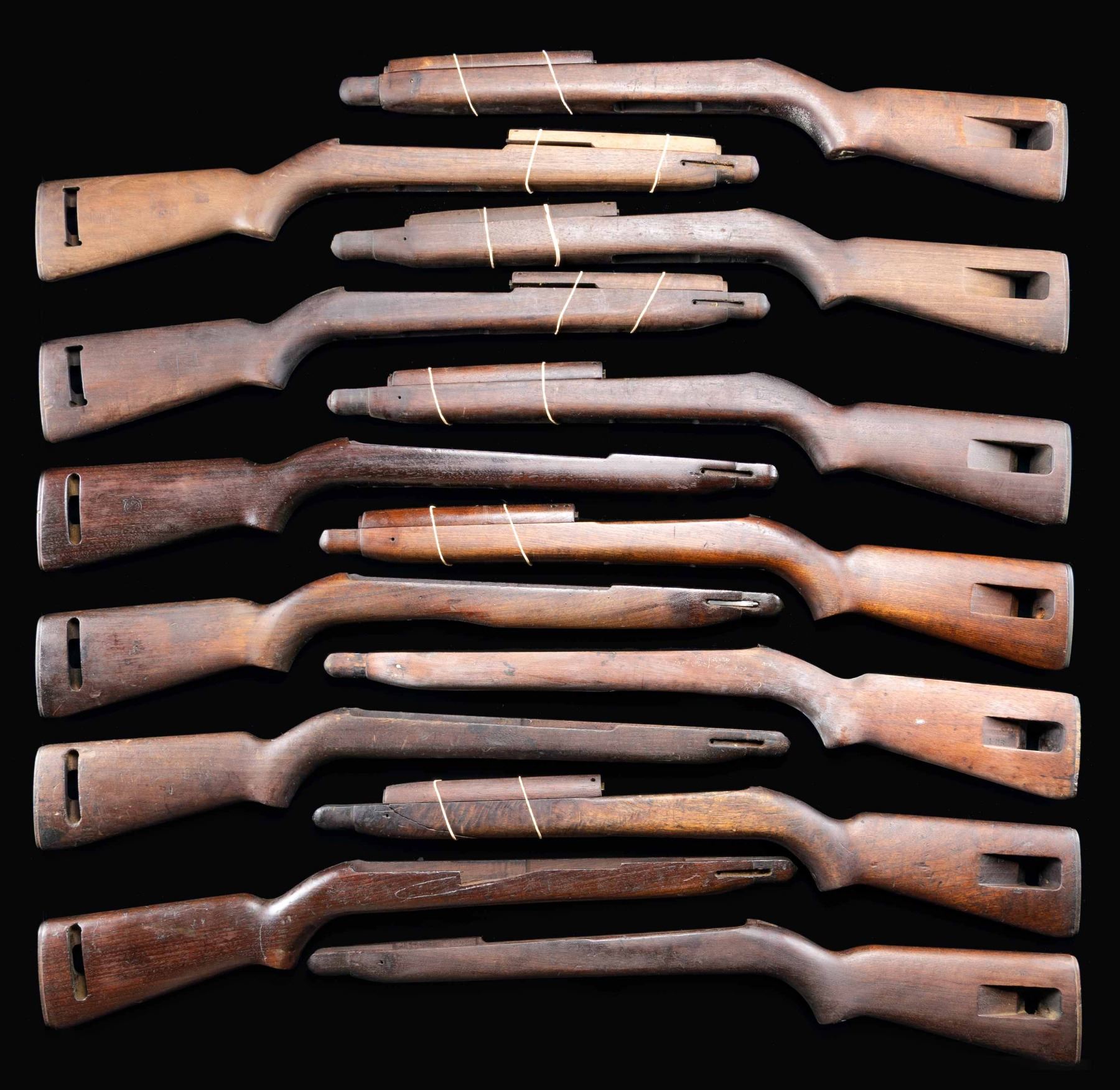 Stocks are generally w/o metal parts, some are w/ handguards. No.1: Low wood oval-cut walnut stock w/ handguard. Stock is marked "W" in sling slot & ".U." in front cheek area. Marked on right side of butt w/ "crossed cannons" & "W.R.A. / GHD". Stock has two stamped & 1 white painted rack number at the end of the pistol grip. 4 rivet handguard is marked "W". CONDITION: stock has moderately worn original finish w/ wear & handling marks throughout & a notable removal of finish around buttstock. Handguard is in worn original condition. / No.2: I-cut high wood walnut stock. Stock has been modified by removal of of most original finish. Markings appear have been enhanced. Markings on right side of butt include "crossed cannons", boxed "WRA / GHD" & boxed "RIA / EB". End of pistol grip has encircled "P" proof. Stock is marked inside ahead of magazine well w/ "S". Forend has "40" rack number at bottom. Two rivet handguard is marked w/ tiny "W". CONDITION: stock has light wear & handling marks. Finish is largely removed. Notable repaired chip behind recoil plate. Handguard is devoid of finish. / No.3: Oval-cut high wood walnut stock. Stock is marked on right side of butt w/ partly double-stamped "crossed cannons" & boxed "SG". Markings appear to have been added. Marked at end of pistol grip w/ "53" rack number. Two rivet handguard marked "RSG". CONDITION: stock has arsenal rework type finish w/ notably thin finish around buttstock. Finish has notable wear & handling marks. Buttstock has original finish w/ light wear. / No.4: I-cut high wood walnut stock. Stock is marked in sling slot "RMC". Right side of buttstock is marked w/ boxed "RMC" & faint "crossed cannons". Two rivet handguard marked "RMC". CONDITION: stock set has light wear & moderate handling marks w/ its arsenal rework finish. / No.5: T-cut high wood walnut stock. Marking in sling slot is not legible. Buttstock is marked on the right side w/ boxed "RMC" & partially boxed "crossed cannons". Stock marked on left side below recoil plate w/ boxed "O.G." overhaul mark. Two rivet handguard marked "RMC". CONDITION: stock set has worn arsenal rework finish w/ numerous handling marks. / No.6: Oval-cut low wood walnut stock. Marked "IO" in sling slot. Right side of butt is marked w/ "crossed cannons". Two rivet handguard marked "LW-B". CONDITION: stock has extensive cracks in forend w/ its worn arsenal refinish & numerous handling marks. Handguard is in notably better condition. / No.7: Oval-cut low wood walnut stock. Equipped w/ recoil plate, buttplate & band retaining spring. Stock is marked only w/ "IO" in sling slot. Four rivet unmarked handguard. CONDITION: stock & handguard have moderately worn arsenal rework finish. / No.8: Oval-cut low wood walnut stock. Marked in sling slot "H.I." & marked on right side of butt w/ "crossed cannons". Encircled "P" proof under grip. Marked "1" at end of pistol grip. Handguard is not present. CONDITION: lightly worn arsenal rework finish w/ extensive repaired crack in forend. / No.9: Oval-cut low wood walnut stock. Marked "IO" in sling slot. "P" proof under grip. CONDITION: stock set has extensive wear & handling marks throughout. Notable chip at top of sling slot. Small crack behind recoil plate inletting & notable long scratch on left side of forend. / No.10: Oval-cut low wood walnut stock. Marked "MR" on left side over sling slot. Faint "crossed cannons" on right side of butt. Metal tag at end of pistol grip w/ "101" rack number. CONDITION: stock has moderate wear, staining & handling marks w/ an arsenal rework finish. / No.11: M2 walnut stock. Marked "IO" in sling slot. Stock marked "AN" on left side of butt in cheek area & small boxed "NOP?-SA". Two "P" proofs found under grip. No handguard is present. Stock has moderately worn arsenal refinish. Recoil plate inletting has been partially glass bedded. / No.12: Oval-cut high wood walnut stock. Marked in sling slot "I-HV" & "flaming bomb". Encircled "P" proof at end of grip & faint "crossed cannons" on right side of butt. Stock retains its recoil plate. CONDITION: stock has had most of its arsenal rework finish removed & wood retains a large percentage of white degreasing agent. / No.13: Oval-cut low wood walnut stock. Marked "IO" in sling slot. Partial "crossed cannons" on right side of butt. "56" at end of pistol grip. CONDITION: stock set has moderately worn arsenal rework type finish w/ handling marks. Very large missing chip & crack found on right side of action area. (02-2450-45/RW). NON-GUN. $700-900.