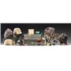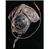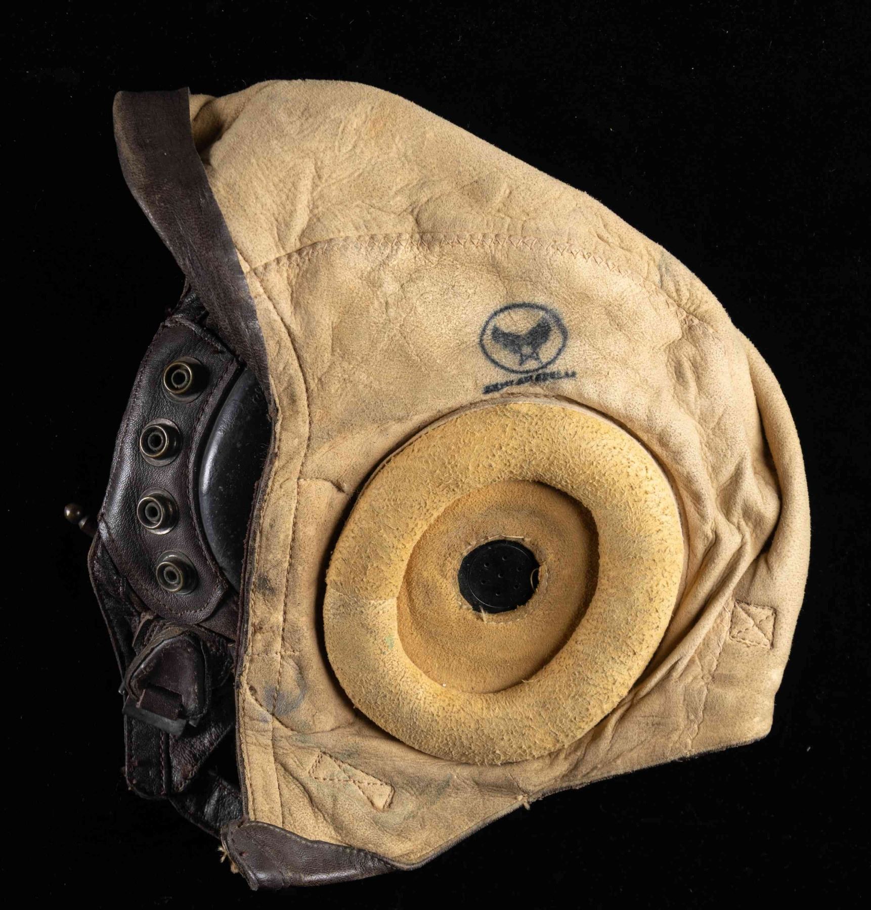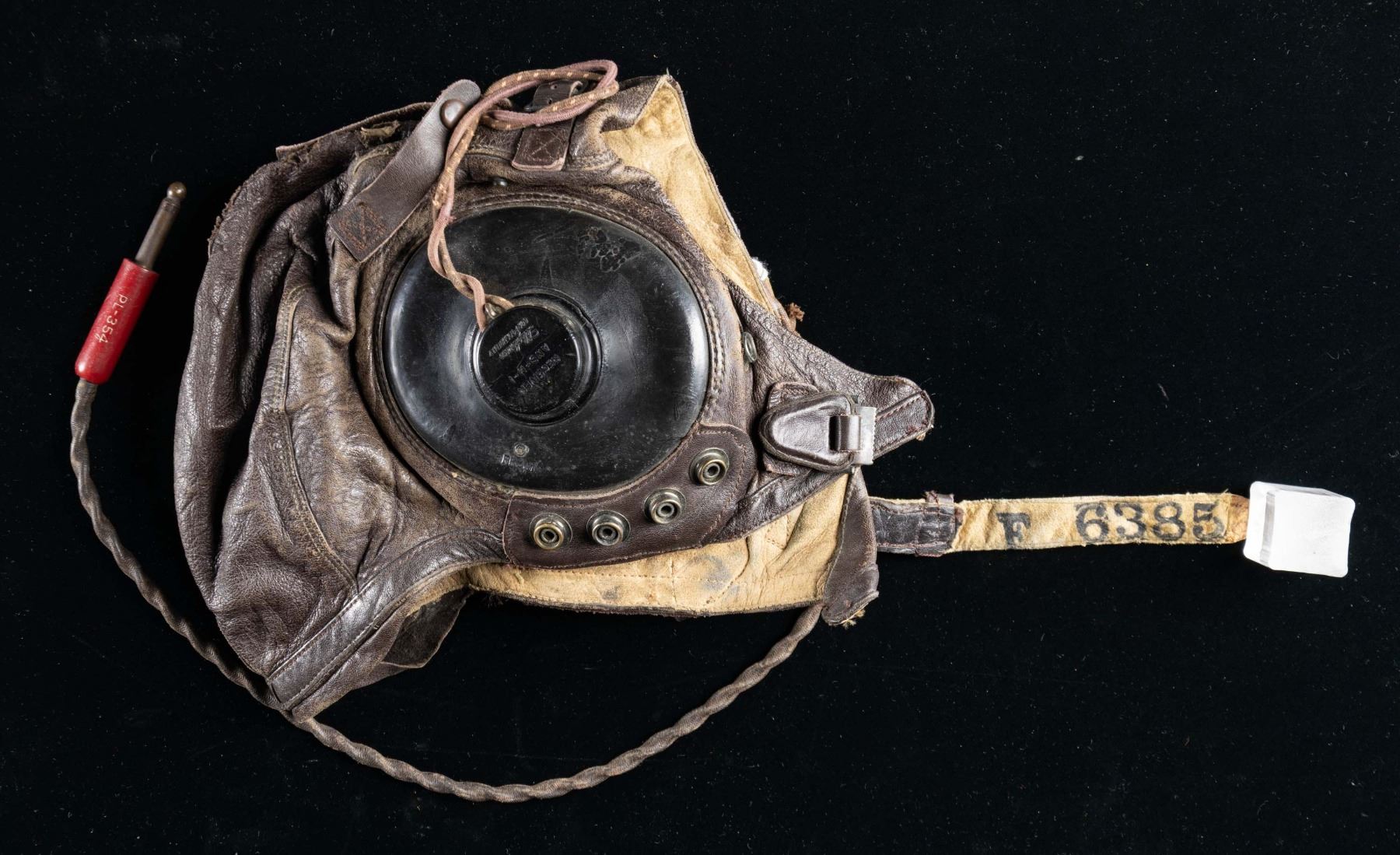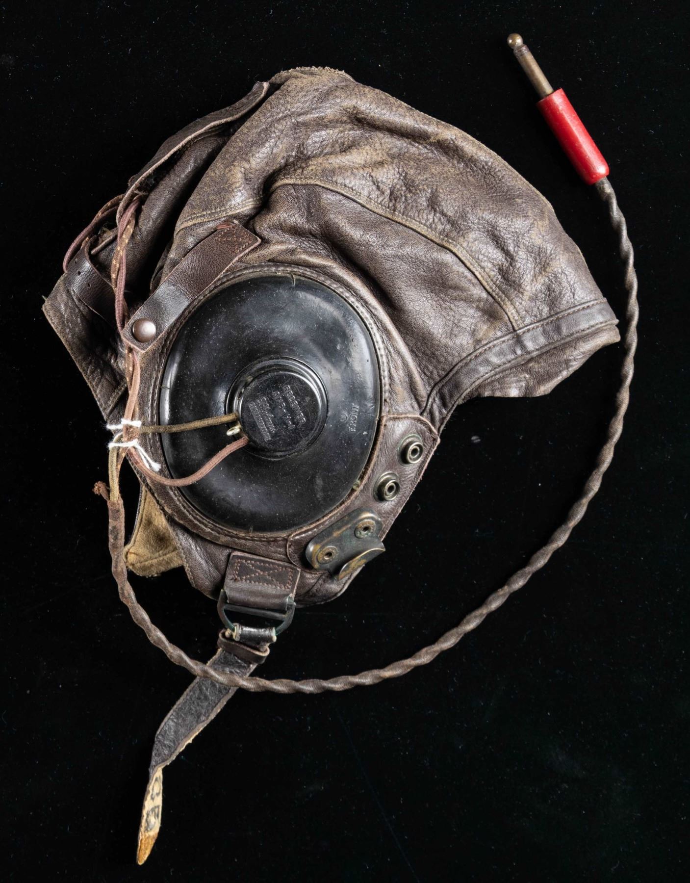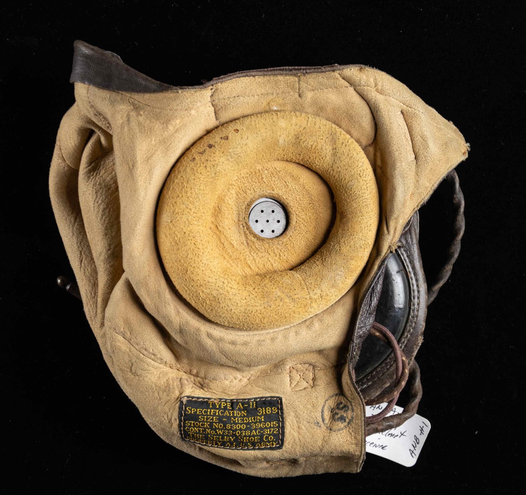 HELMETS AND RADIO EQUIPMENT. Grouping includes: No.1: brown leather flight helmet Type A-11, size medium complete with earphones and cord. In well-worn condition, but appears reasonably complete. / No.2: brown leather fleece-lined flying helmet Type B5. Earphones are not present. Helmet complete with chin strap has wear, flexing and staining. / No.3: brown leather fleece-lined Type B-6 flight helmet without earphones. In worn condition with flexing and small areas of rodent damage. / No.4: ANB-H-1 headset complete with headphones, cord and plug in worn condition. / No.5: AN-H-15 headset with cord and plug. One earpiece has glued repair in otherwise good worn condition. / No.6: Cloth flying helmet marked Army Air Forces Type A-10A. Headphones are not present. Helmet has significant rodent damage. / No.7: Hand-held T-17 microphone with cord and thumb-button. Dated 1942. Well-worn, but appears complete. / No.8: Microphone Type 9104. Also marked "NAF NO 213264-6" with coiled black cord in good condition with light wear. / No.9: Two Signal Corps radio tube and crystal sets. Wooden OD painted boxes measure approximately 13 1/2" by 4 1/2" by 3". One is marked "SIGNAL CORPS / BOX BX-49-A / 18521;CGG 49802-PHILA-45-07". The boxes have radio frequency tags and contain approximately half of their original components. One box is missing its metal tag. / No.10: U.S. Army marked stereo viewer in it's original brown leather pouch. Th viewer has a black crackle finish with wire folding wire supports. Optics are cloudy. / No.11: Late issue Aviator sunglasses in a green leatherette case. Case is equipped with an ALICE attachment. Case and glasses in good condition. / No.12: Chart board light assembly in it's original baseboard container. Container has wear and staining. / No.13: 2 green face-shields for flight helmets, 1 in original paper wrapping. CONDITION: as noted in description. (02-25741/RW). NON-GUN. $200-400.