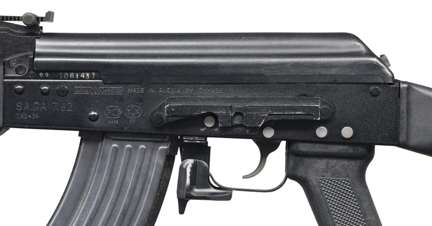 Cal. 7.62x39. S# 1061437. Bbl. 16" over flash hider. OAL 35". A real Russian AK variant manufactured by Izhmash & imported by Kalashnikov USA. Black painted finish. Protected post front sight. Elevation adjustable rear tangent sight. Right side reciprocating charging handle. Left side scope mount on stamped receiver. Right side controls. Black plastic forend, pistol grip & shoulder stock w/ trap door. Left side sling swivels. MAGS: 1 steel 30 rd. CONDITION: Finish complete w/ some thinning on high spots & in areas of mechanical intervention. Bright bore w/ aggressive rifling. Fire control mechanism appears to function correctly when cycled by hand. PROVENANCE: From the Working Reference Collection of Military Arms Instructor, Master Sergeant Vincent Pestilli. (23-7535/JZ). MODERN. $500-700.