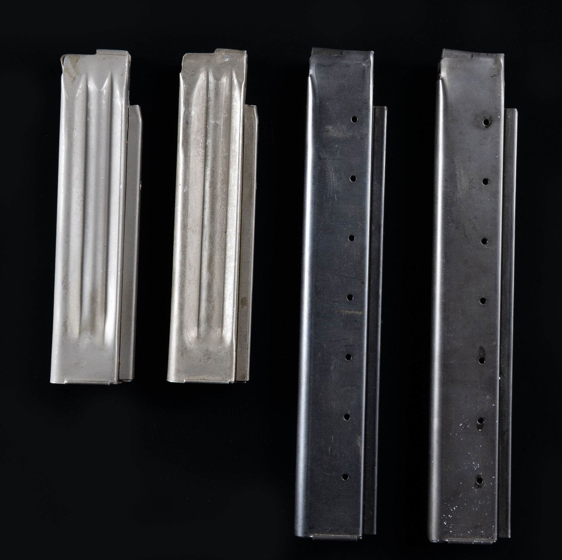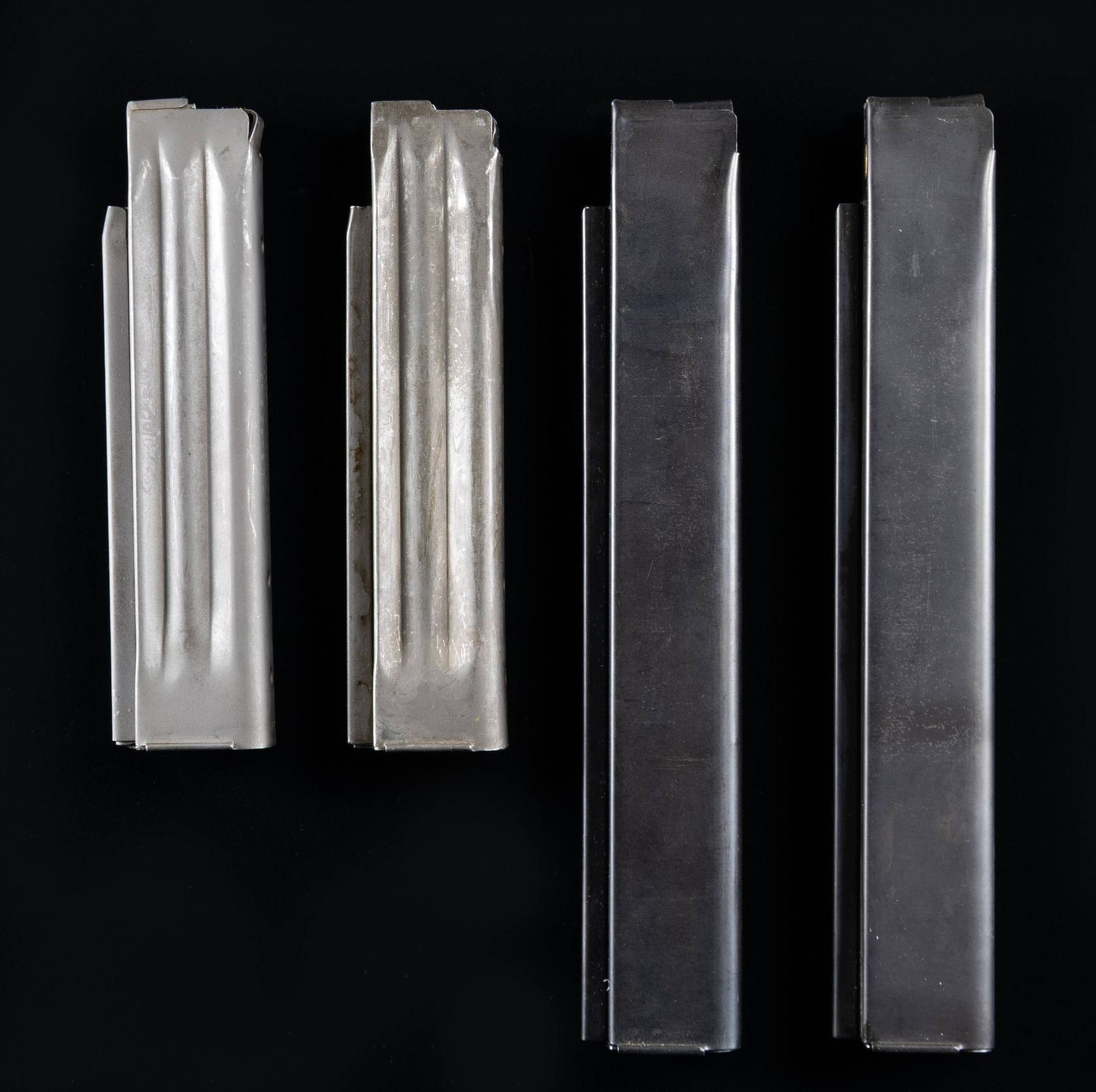 MODEL 50 SUBMACHINE GUN MAGAZINES. Lot consists of 4 Harrington & Richardson Reising Model 50 mags., including: 1) x2 corrugated 12-rd. Harrington & Richardson mags. Steel construction with parkerized finish. 2) x2 aftermarket 30-rd. mags., likely mfg. by Ken Christie. Steel construction with blued finish. CONDITION: 1 corrugated mag. is very good, with light wear and superficial handling marks. Other corrugated mag. shows mild wear and age related discoloration. Aftermarket mags. are very good overall, with a few light superficial handling marks. (02-24536-7/MLW). $700-1,100.