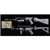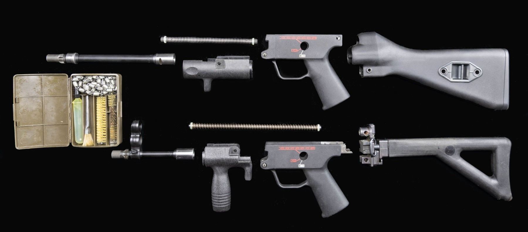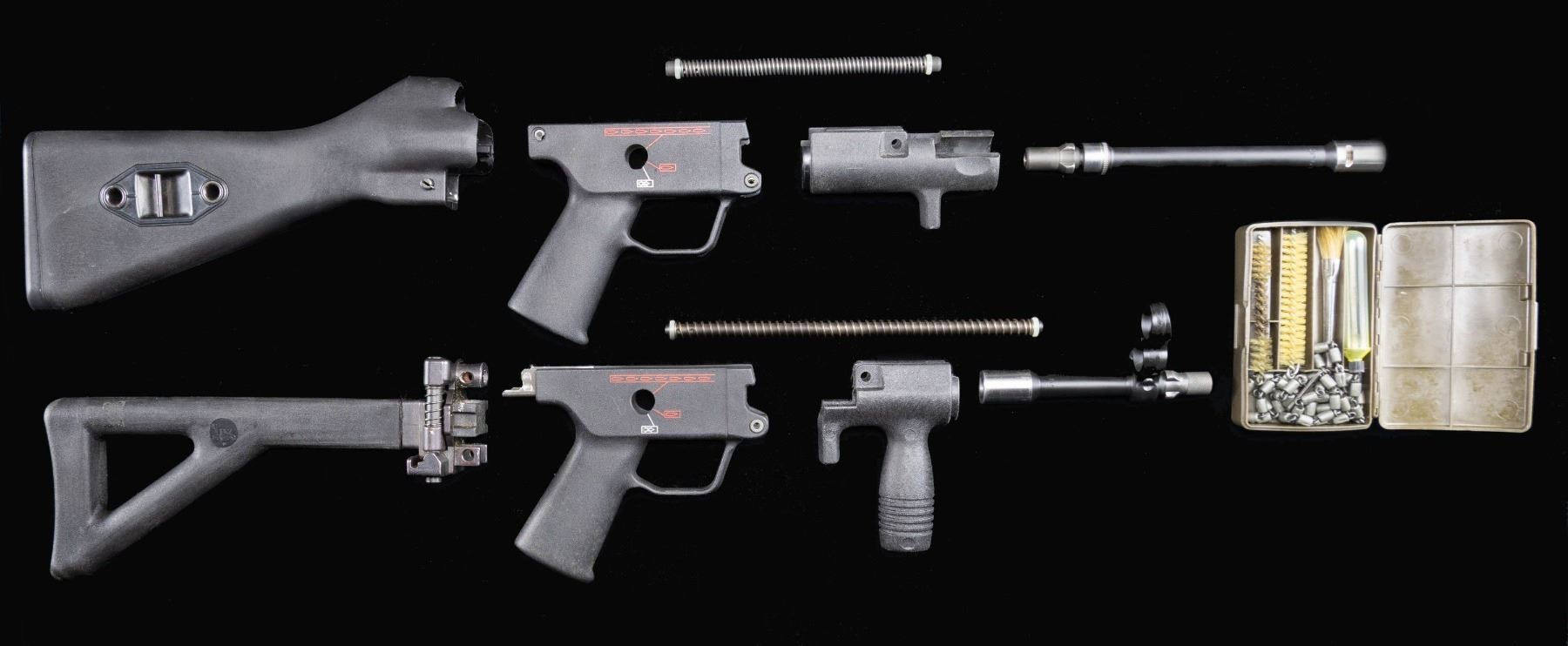 Desirable lot of Heckler & Koch MP5 and MP5K parts, including: 1) x1 MP5 3-position pictogram (Safe, Semi, Full) black polymer trigger pack housing with false front push pin. 2) x1 MP5K 3-position pictogram (Safe, Semi, Full) black polymer trigger pack housing with false front push pin. 3) x1 MP5A2 fixed black polymer buttstock (push pin present). 4) x1 MP5K black polymer side-folding buttstock (push pins absent). 5) x1 MP5K black polymer forearm with short hand stop. 6) x1 MP5K black polymer vertical foregrip with integral hand stop. 7) x1 MP5 8 7/8" chrome lined bbl. with fluted chamber and integral tri-lug adapter. Bbl. is marked "E9 JC" towards the breech. 8) x1 MP5K 5 13/16" chrome lined bbl. with fluted chamber, integral tri-lug adapter with threaded muzzle & knurled muzzle cover, as well as the front sight assembly. Bbl. is marked "J8 Ie" towards the breech. 9) x1 MP5K recoil guide rod assembly. 10) x1 MP5 recoil guide rod assembly. 11) x1 German green synthetic cleaning kit. CONDITION: black polymer furniture is very good overall, exhibiting some light superficial handling marks. Bbls. retain brilliant mirror chrome lined bores with sharp, well defined rifling throughout. (02-25029/MLW). NON-GUN. $800-1,200.