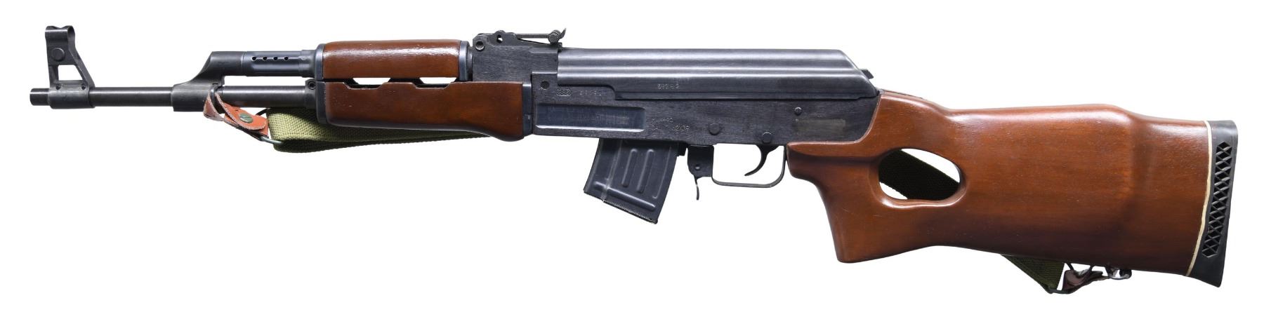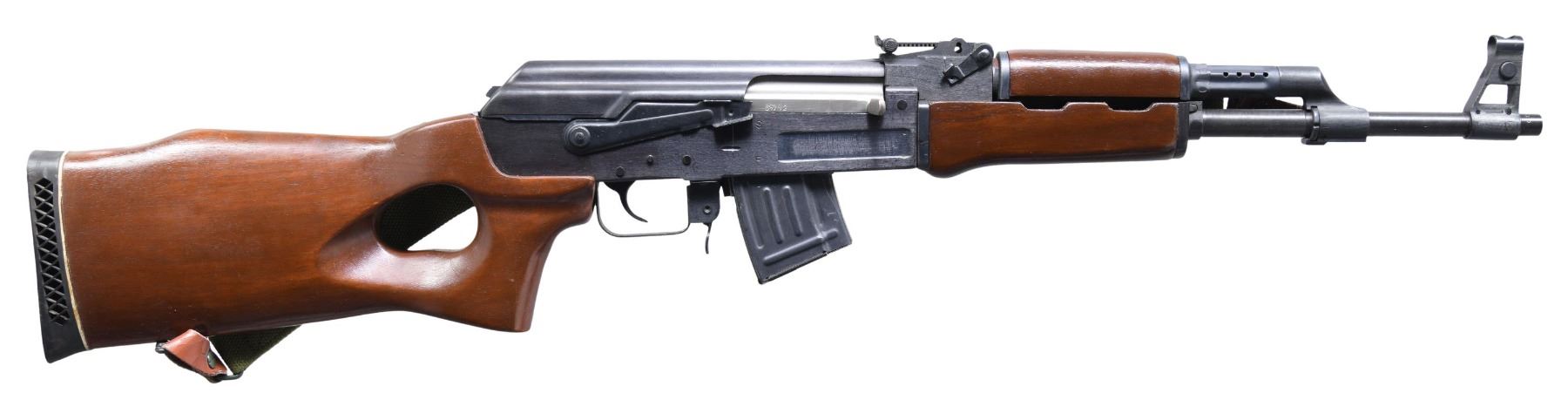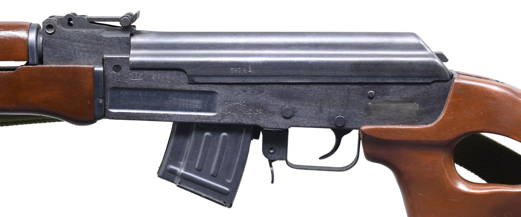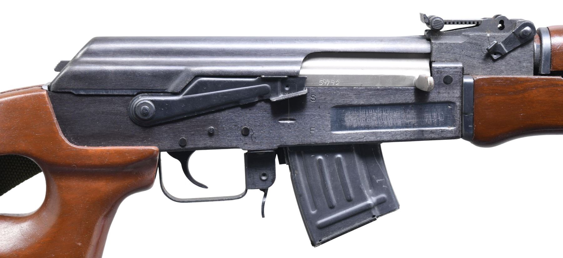 SEMI-AUTOMATIC RIFLE. Cal. 7.62x39mm. S# 59792. Bbl. 16 1/4". MAK-90 semi-automatic rifle mfg. in China by Norinco and imported by C.J.A. Left side of the milled receiver is marked with Norinco's Factory "386" code within an oval, the S#, model and cal. designations, as well as with C.J.A.'s importer information. Left side of frame also exhibits an area that has been scrubbed at the rear, likely indicating that this receiver was reworked to comply with the American 1989 import ban. Underside of the receiver is marked with the Norinco logo above "MADE IN/ CHINA". Metal components exhibit a blue finish overall, save for on the bolt assembly, which is in-the-white. Plain brown painted wood thumbhole buttstock and handguards. Post front sight, with standard Chinese AK pattern rear sight. All serialized parts are matching and include the receiver, receiver cover, bolt carrier, bolt, as well as the gas cyl. tube. MAGS: 1 blued Chinese 5-rd. mag., with replacement floorplate and follower. CONDITION: metal components retain the majority of their original factory blue finish, exhibiting some scattered superficial handling marks overall. Brilliant mirror chrome lined bore, retaining well defined rifling throughout, Wood furniture shows a few superficial marks from handling and storage, but otherwise remains sturdy and serviceable. (24-6753/MLW). MODERN. $600-1,200.
