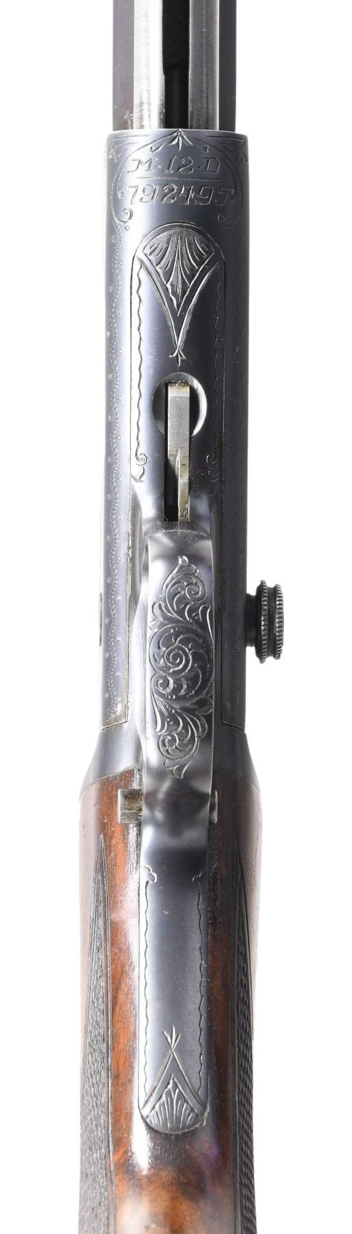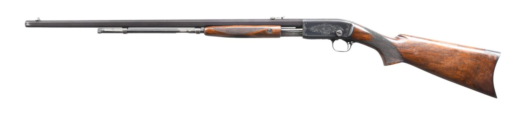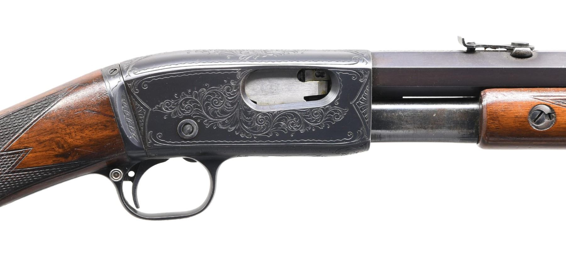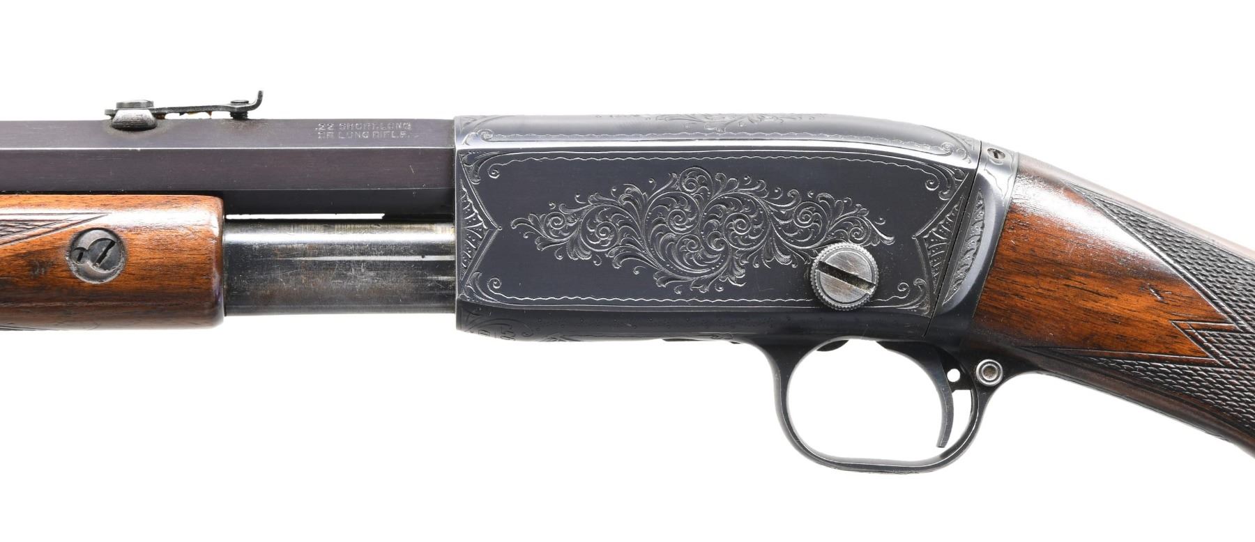 Cal. 22 S,L,LR. S# 792495. Bbl. 24" octagon w/ original sporting sights. D grade engraving consists of arabesque scroll w/ straight line & wavy borders & highlights that extend to upper & lower receiver areas. Forearm & uncapped pistol grip stock of nicely grained walnut w/ crescent steel buttplate & factory hand checkering. Mfg. 1930. CONDITION: 85% lightly faded original blue showing slide & edge wear w/ spots of freckling. Original wood finish has a heavily blistered & crazed appearance w/ scattered handling marks. Good bright bore w/ lightly worn rifling. PROVENANCE: The estate collection of Don "Duck" Combs. (24-2421/DS). CURIO. $4,000-6,000.