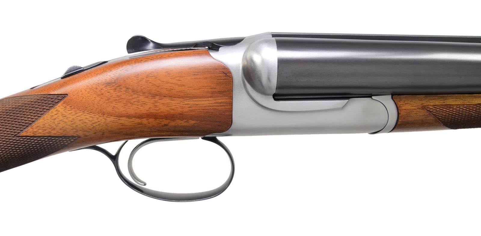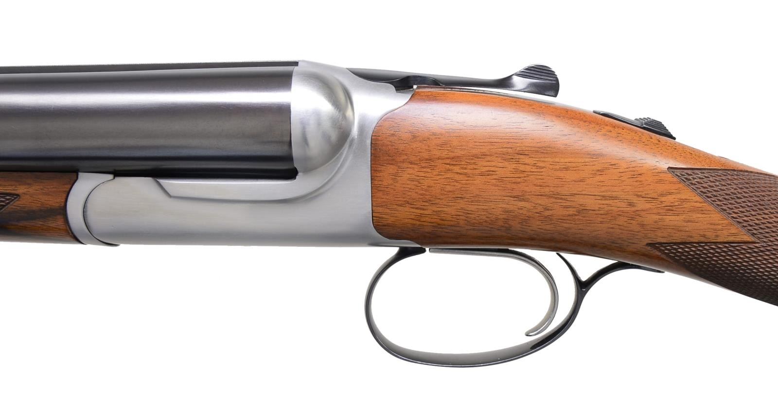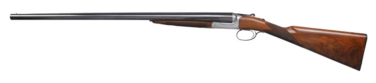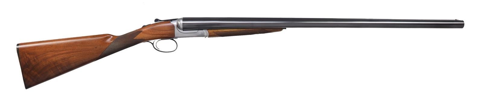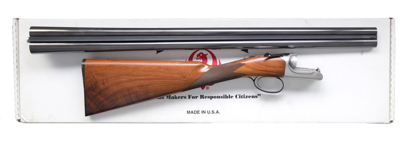 Cal. 12 Ga., 3". S# U460-01745. Bbl. 28". Ruger's attempt to enter the SxS shotgun market. The amount of handwork necessary to correctly join the bbls. made it impossible to build these guns cheaply, so production ceased in 2008. All are 12 Ga. w/ 28" bbls. fitted w/ interchangeable choke tubes. The action & ejector system is modeled on the famous Dickson rnd. action, except coil springs replaced Dickson's leaf springs. Rnd. body stainless steel action is fitted w/ single selective trigger. Bottom engraved "Gold Label" & w/ Ruger name & address above & below gold Ruger logo. Trigger guard & top lever are blued. Straight grip stock is of nicely figured American walnut & measures 14 3/8" over Ruger hard rubber buttplate. Point pattern checkering is at grip. Matching splinter forend has Anson type release. MEASUREMENTS: STOCK: LOP: 14 3/8". DAC: 1 5/8". DAH: 2 7/16". WEIGHT: 6 lbs. 12 oz. UNATTACHED ACCESSORIES: original box w/ end label for this gun containing 6 choke tubes, instruction booklet, & trigger lock. CONDITION: very fine, close to "new", but w/ some evidence of limited firing w/ only a scattering of very slight handling & assembly marks on all surfaces. Mechanically fine. Box is fine w/ some scuffs & soiling. (20-1653/MGM76). MODERN. $2,000-3,000.