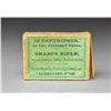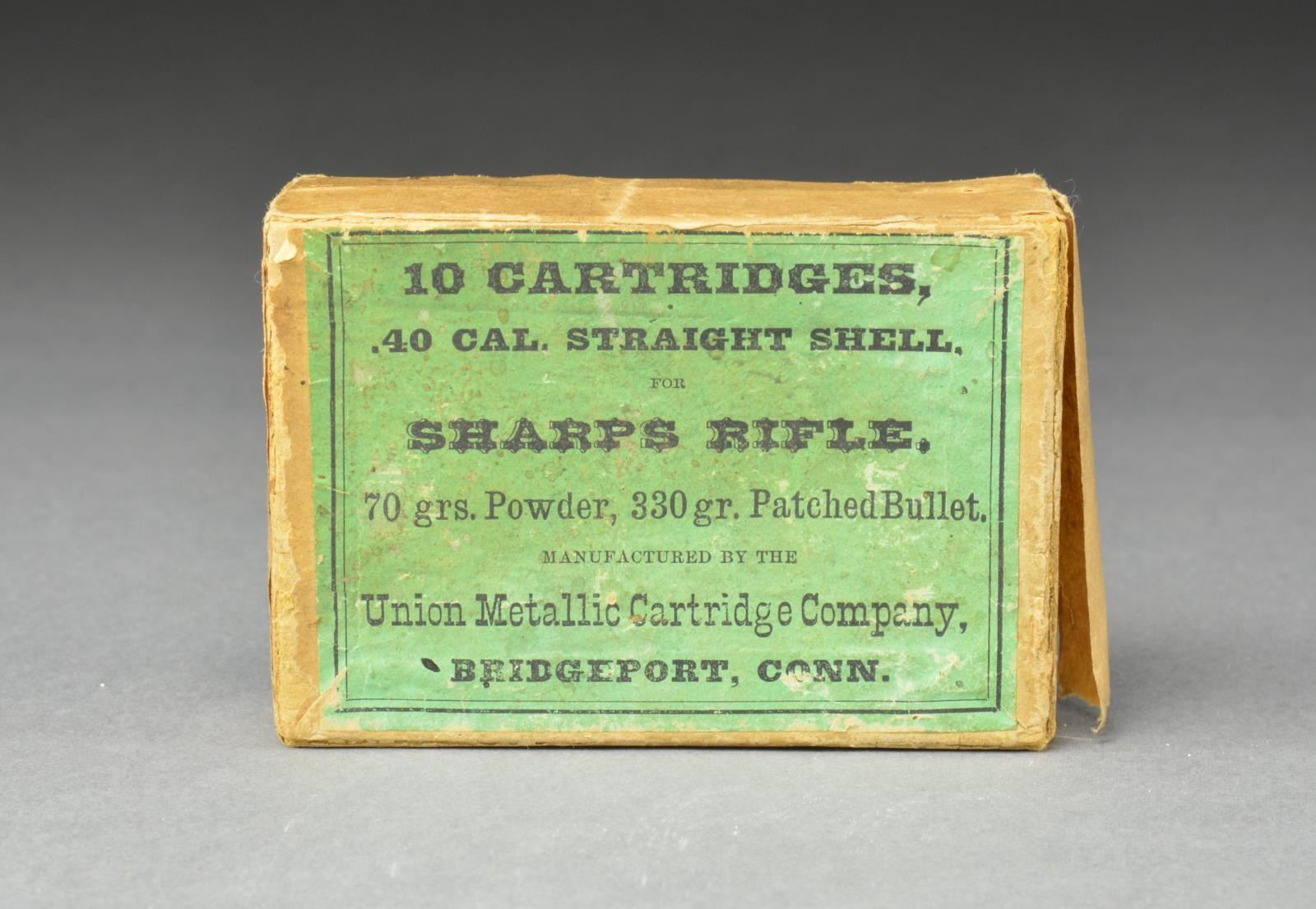 RIFLE CARTRIDGES. Sealed box of 10 cartridges. Tan box w/ light green label. Label marked "10 CARTRIDGES .40 CAL. STRAIGHT SHELL FOR SHARPS RIFLE 70 G.R.S. powder, 330 gr. patched bullet. MANUFACTURED BY THE Union Metallic Cartridge Company Bridgeport Conn." Box has light wear, scuffing & staining w/ legible markings. Sealing tape is loose on one end. (02-16175/RW). $300-500.