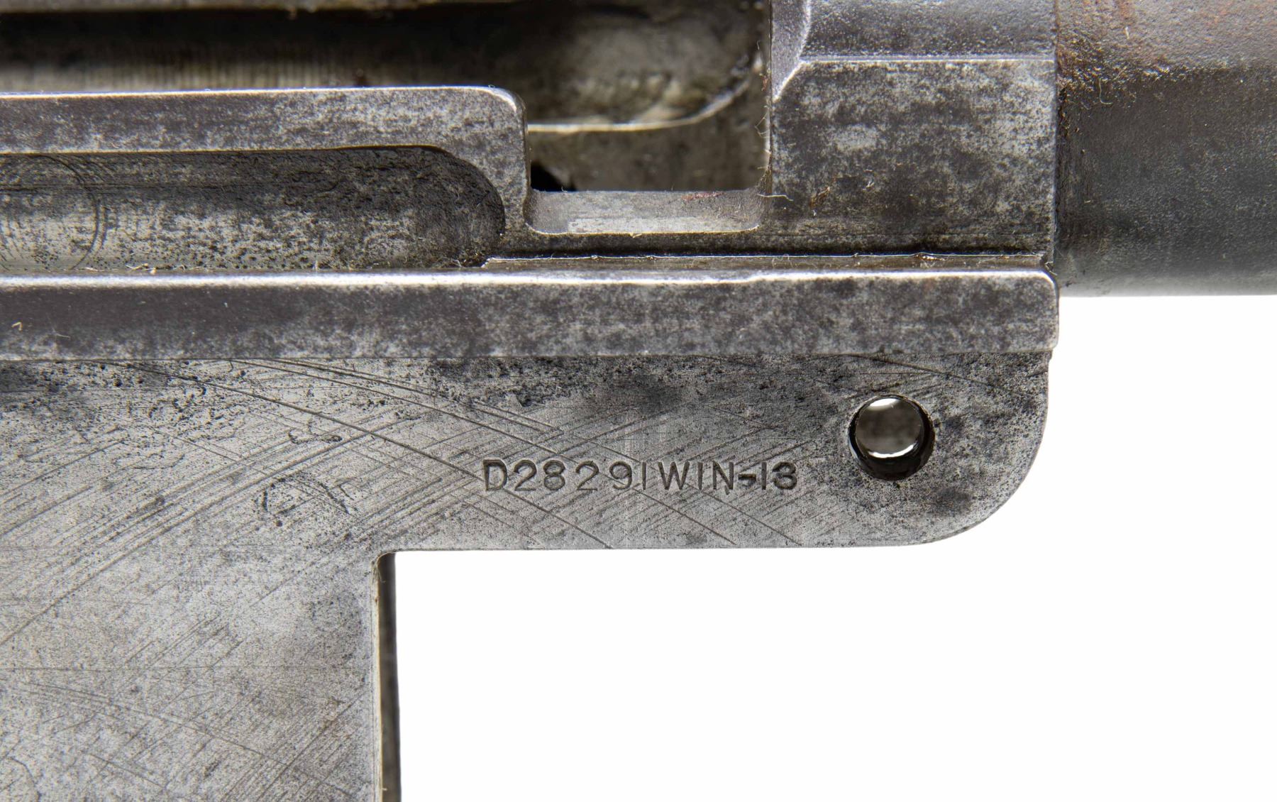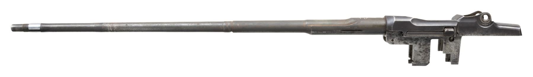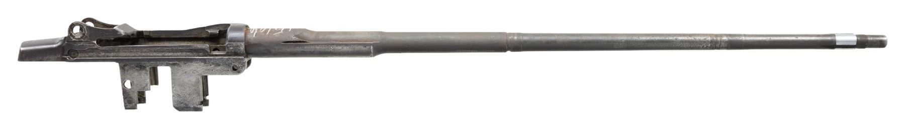 RECEIVER. Cal.30-06. S# 1614685. 24" replacement barrel has "SA" markings on the right side which have been over stamped with "import marks". Defense acceptance "Eagle" is also present. The Win -13 marking referred to on the right side of the receiver is a drawing number and occurs in the 1,600,000 range. This receiver is from a rifle which saw hard service. The only other parts included are the clip latch assembly. CONDITION: The receiver has turned grey and patina with wear , areas of oxidation and pitting. Notable pitting at front of receiver ring. Barrel gauges 1.0 at throat and muzzle. Bore is oxidized at both ends but shows strong lands. (25-2997/RW). MODERN. $300-500.
